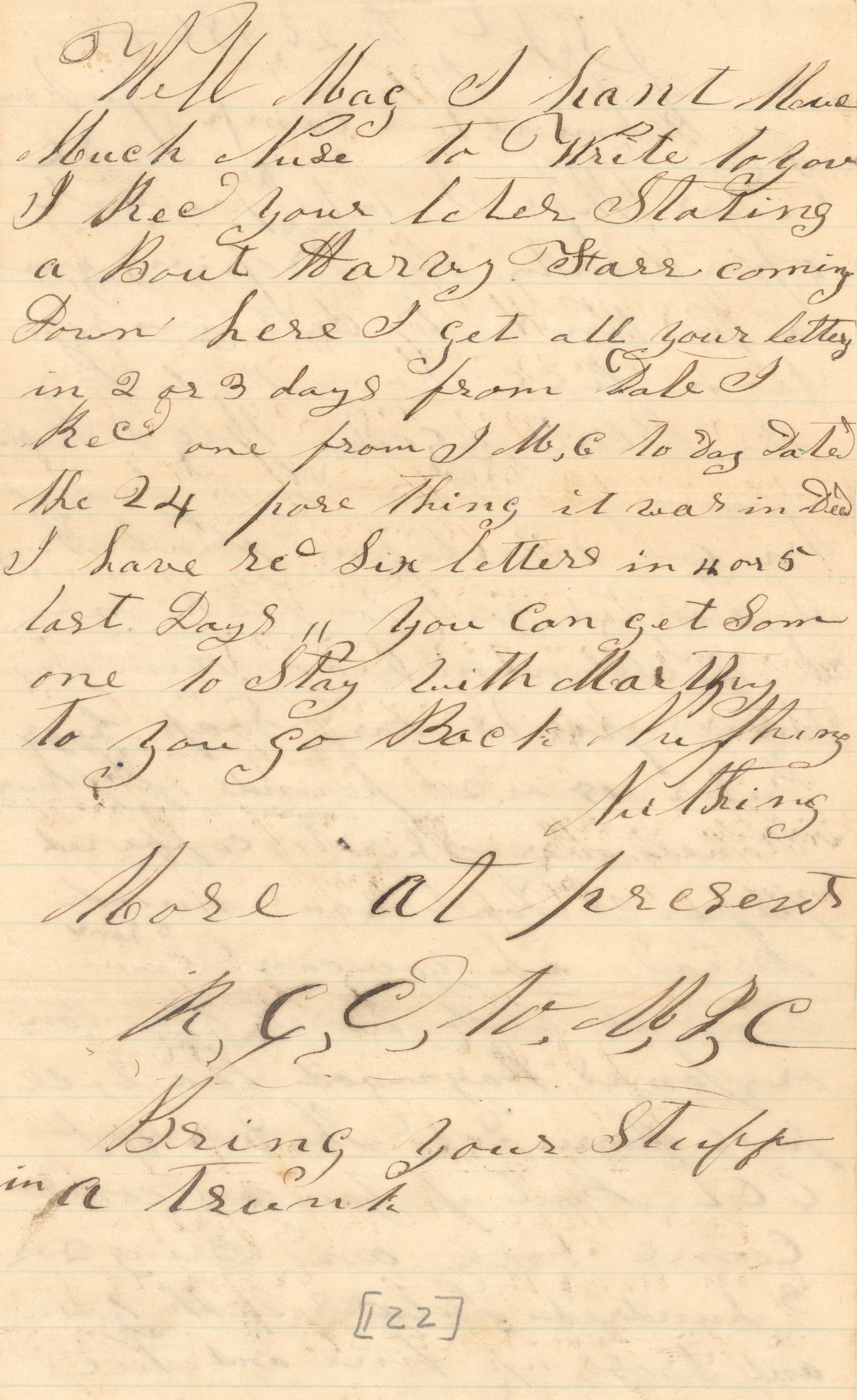 Well Mag I hant Have Much Nuse to Write to you I Rec your leter Stating a Bout Harvy Starr coming down here I get all your letters in 2 or 3 days from date I recd one from J M.C. to day dated the 24 pore thing it was in Dec I have recd six letters in 4 or 5 last days,, you can get som one to stay with Marthy to you go back[note]