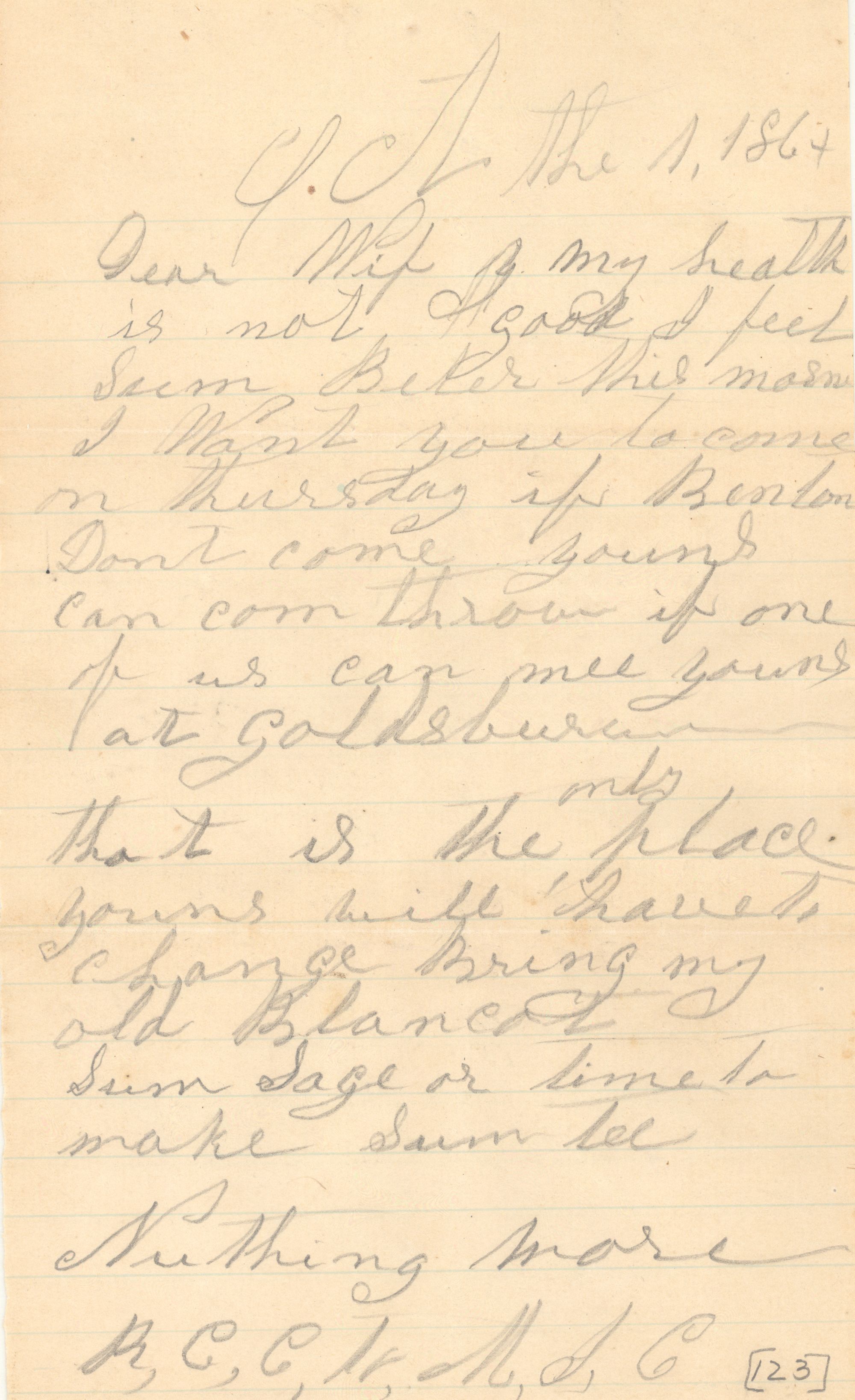 my health is not good I feel Sum Beter this morni I want you to come on thursday if Benton dont come youns[note] can com throw[note] if one of us can mee youns at Goldsbureu that is the only place youns will have to change bring my old blancot sum sage or time to make sum tee