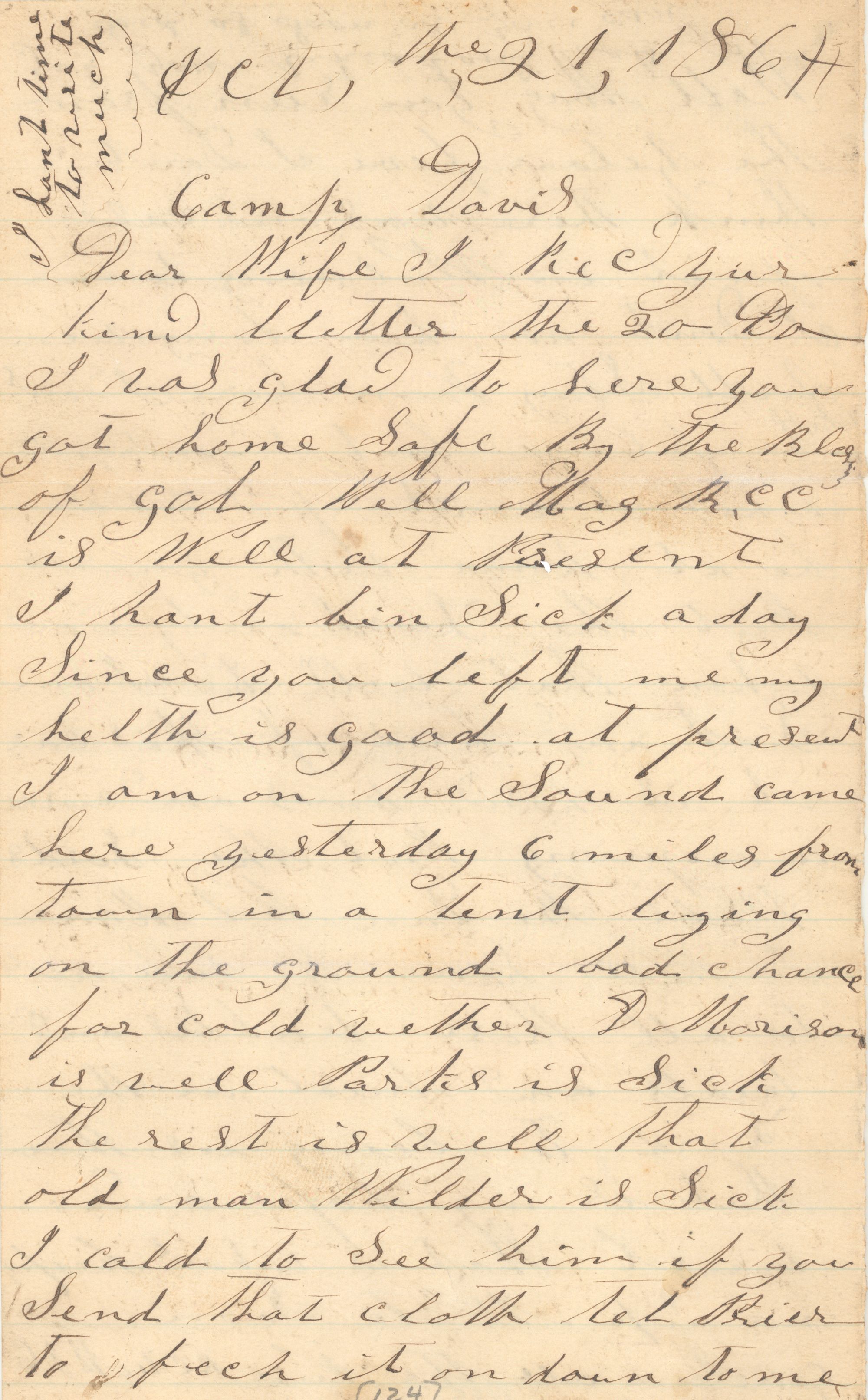 I recd yur kind lletter the 20 do I was glad to here you got home Safe by the Blesing of god Well Mag R.CC is well at Present I hant bin Sick a day Since you left me my helth is good at present I am on the Sound came here yesterday 6 miles from town in a tent lying on the ground bad chance for cold wether D Morison is well Parks is Sick The rest is well That old man Wilder is sick I cald to See him if you Send that cloth tel Pier to fech it on down to me