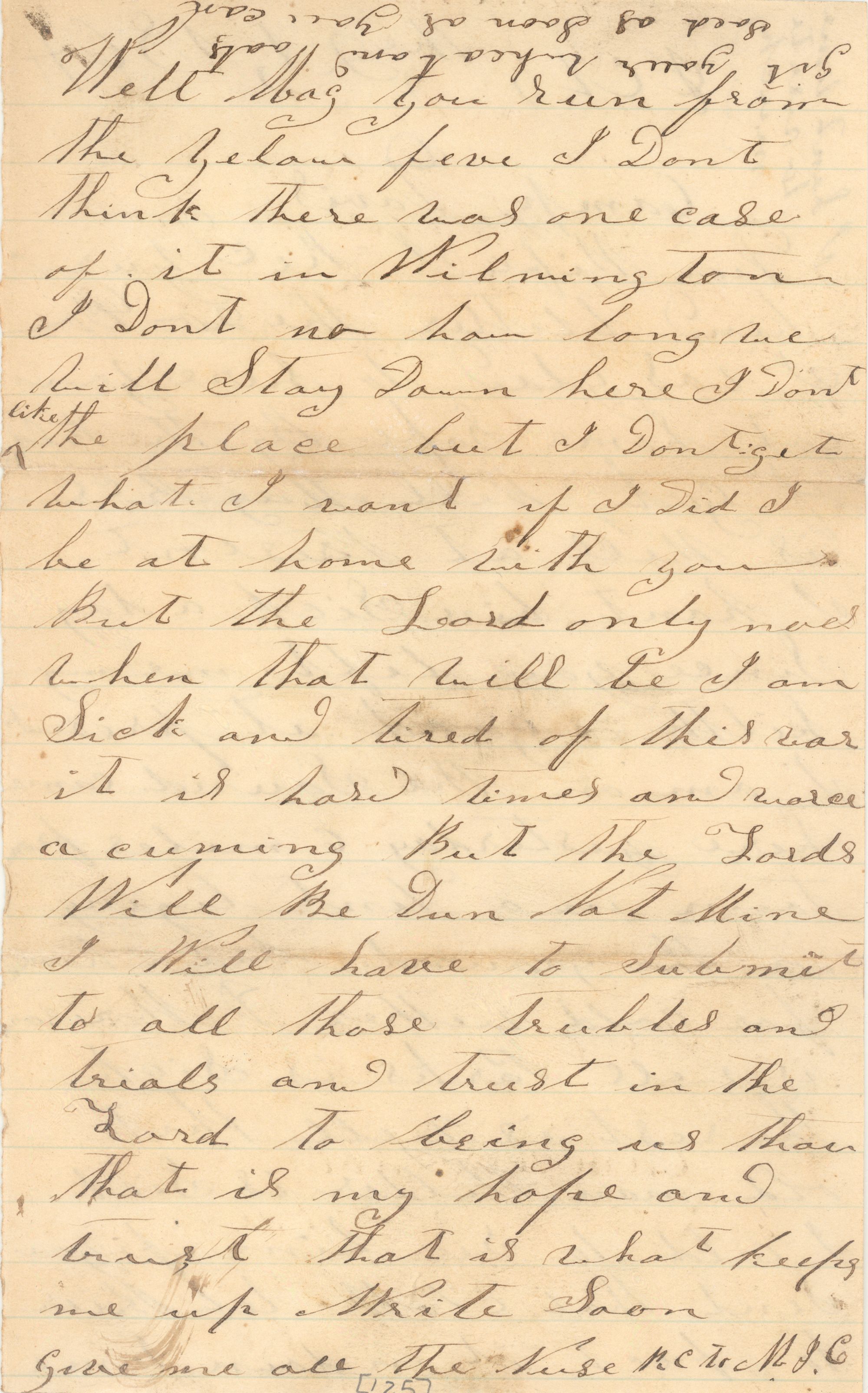 Well Mag you run from the yelow feve I dont think there was one case of it in Wilmington I Dont no how long we will Stay Down here I Dont like the place but I dont get what I want if I did I be at home with you but the Lord only noes when that will be I am Sick and tired of this war it is hard times and worce a cuming but the Lords Will Be Dun Not Mine I Will have to submit to all those trubles and trials and trust in the Lord to being us than that is my hope and trust that is what keeps me up