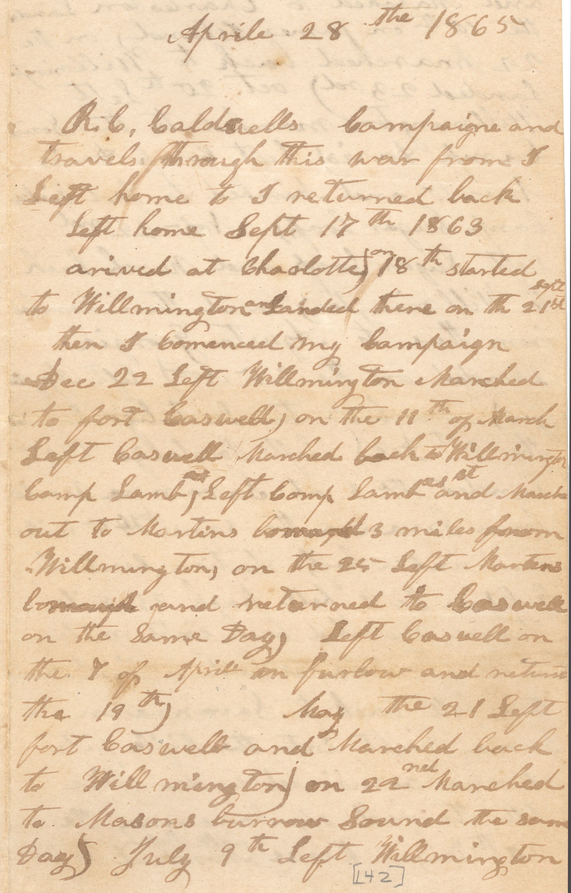 Left home Sept 17th 1863 arived at Charlotte on 18th started to Willimington and landed there on the Sept 21st then I comenced my campaign Dec 22 Left Willmington marched to fort Caswell, on the 11th of March left Caswell marched back to Willmington Camp Lamb, Left Camp Lamb as St and marched out to Martins comand 3 miles from Willmington, on the 25 Sept left Martins Comand and returned to Caswell on the Same Day, Left Caswell on the 7 of Aprile on furlow and returned the 19th, May the 21 Left fort Caswell and marched back to Willmington, on 22nd marched to Masons burrow Sound the same Day, July 9th left Willmington