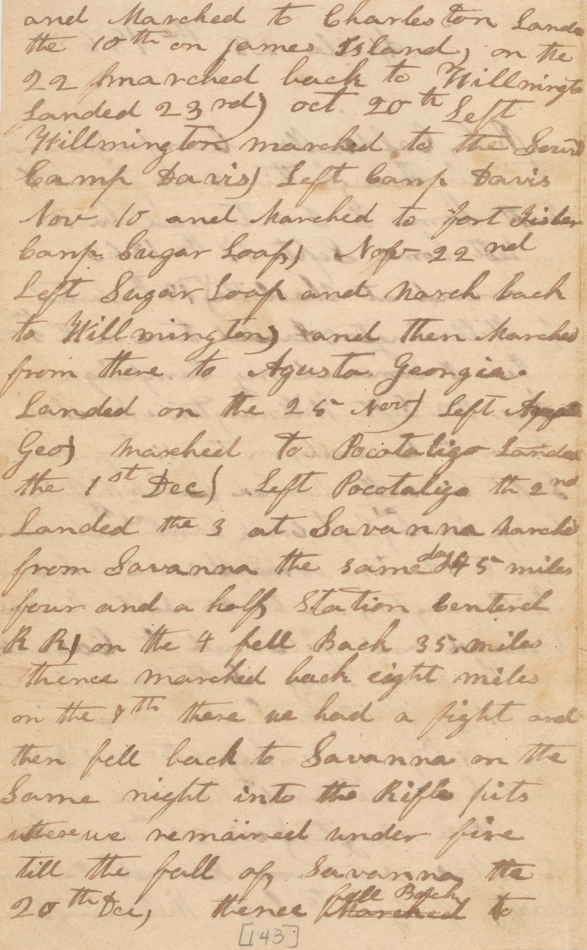 and marched to Charleston landed the 10th on James Island, on the 22 marched back to Willmington Landed 23rd, Oct 20th Left Willmington marched to the Sound Camp Davis, Left Camp Davis Nov 10 and marched to fort Fisher Camp Sugar Loaf, Nov 22nd left Sugar Loaf and march back to Willmington, and then marched from there to Agusta Georgia. Landed on the 25 Nov, left Agusta Geo, marched to Pocotaligo Landed the 1st Dec, left Pocotaligo the 2nd landed the 3 at Savanna marched from Savanna the same day 245 miles four and a half station centered R R, on the 4 fell back 35 miles thence marched back eight miles on the 9th there we had a fight and then fell back to Savanna on the Same night into the Rifle pits these we remained under fire till the fall of Savanna the 20th Dec, thence fell back to