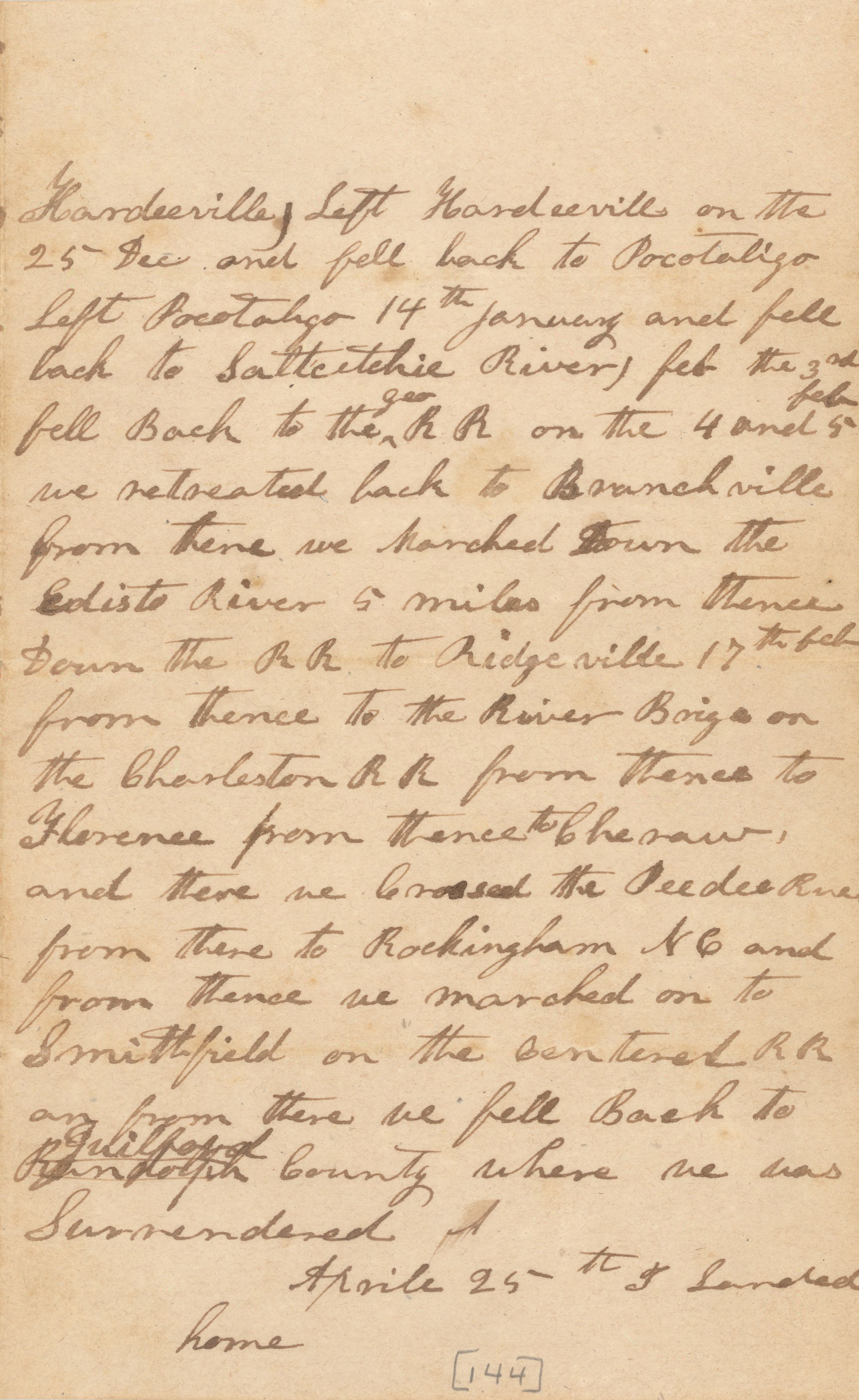 Hardeeville, Left Hardeeville on the 25 Dec and fell back to Pocotaligo Left Pocotaligo 14th January and fell back to Saltcetchie River, Feb the 3rd fell back to the geo R.R. on the 4 and 5 Feb we retreated back to Branchville from there we marched down the Edisto River 5 miles from thence Down the R R to Ridgeville 17th Feb from thence to the River Barge on the Charleston R R from thence to Florence from thence to Cheraw, and there we crossed the Peedee River from there to Rockingham NC and from thence we marched on to Smithfield on the centered R R an from there we fell back to Guilford County where we was Surrendered