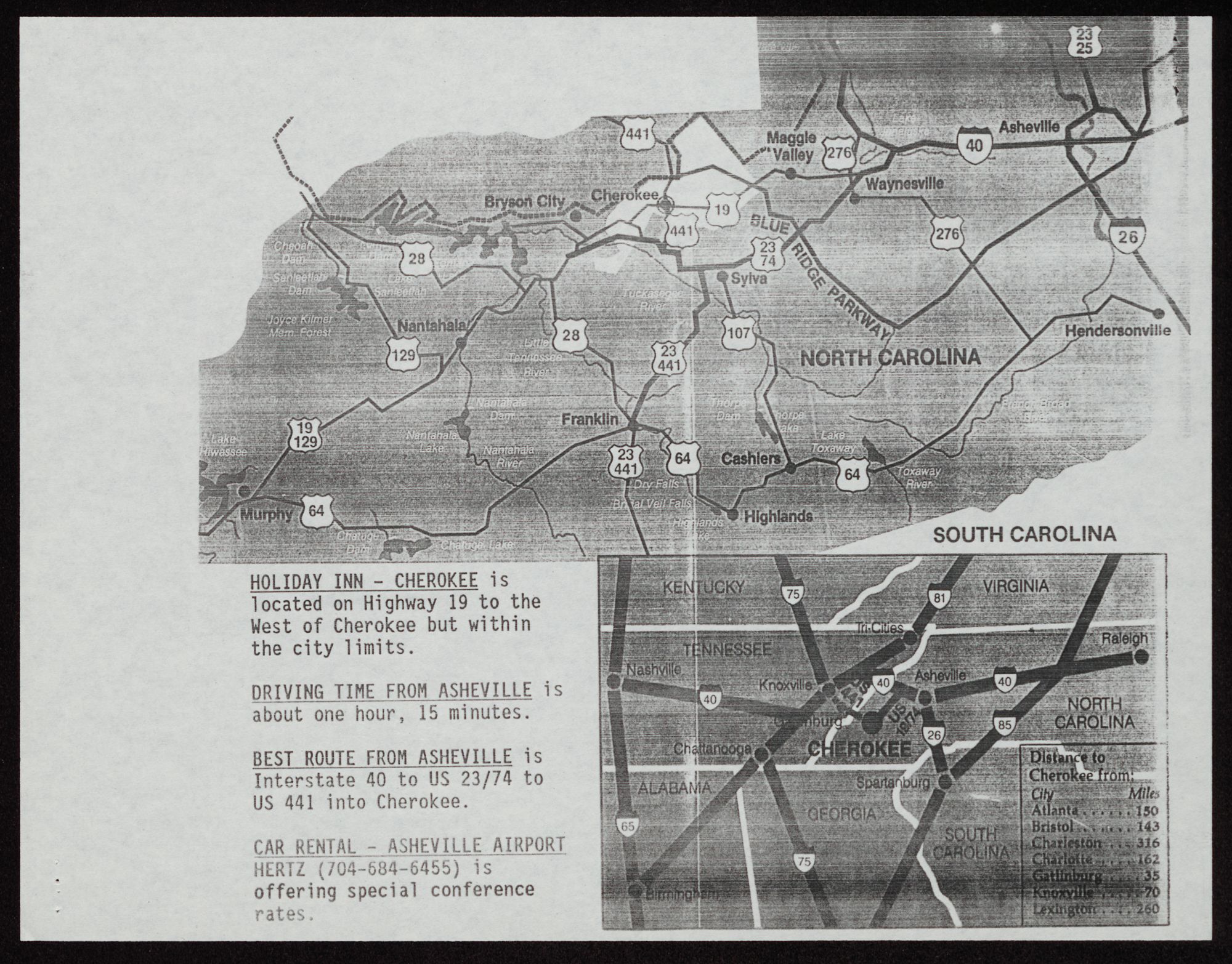 Cherokee is located 50 miles west of Asheville, North Carolina (see enclosed map). Driving time