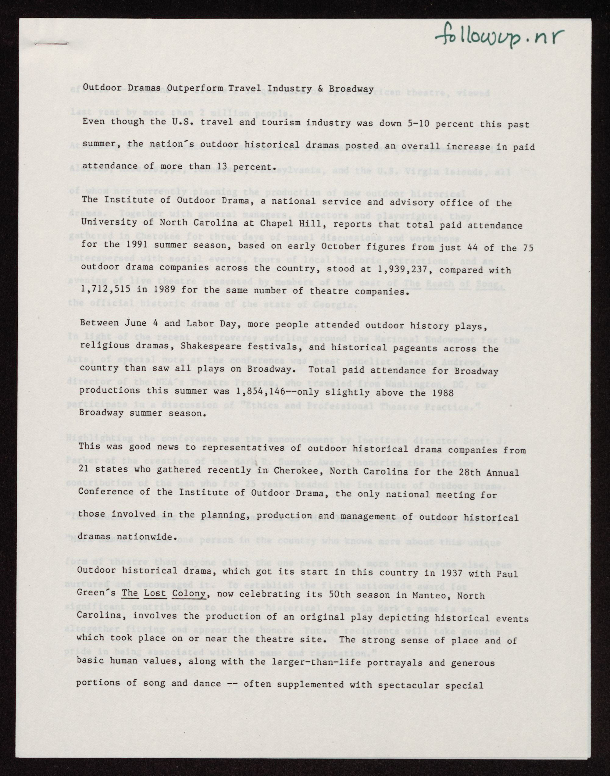Outdoor Dramas Outperform Travel Industry & Broadway