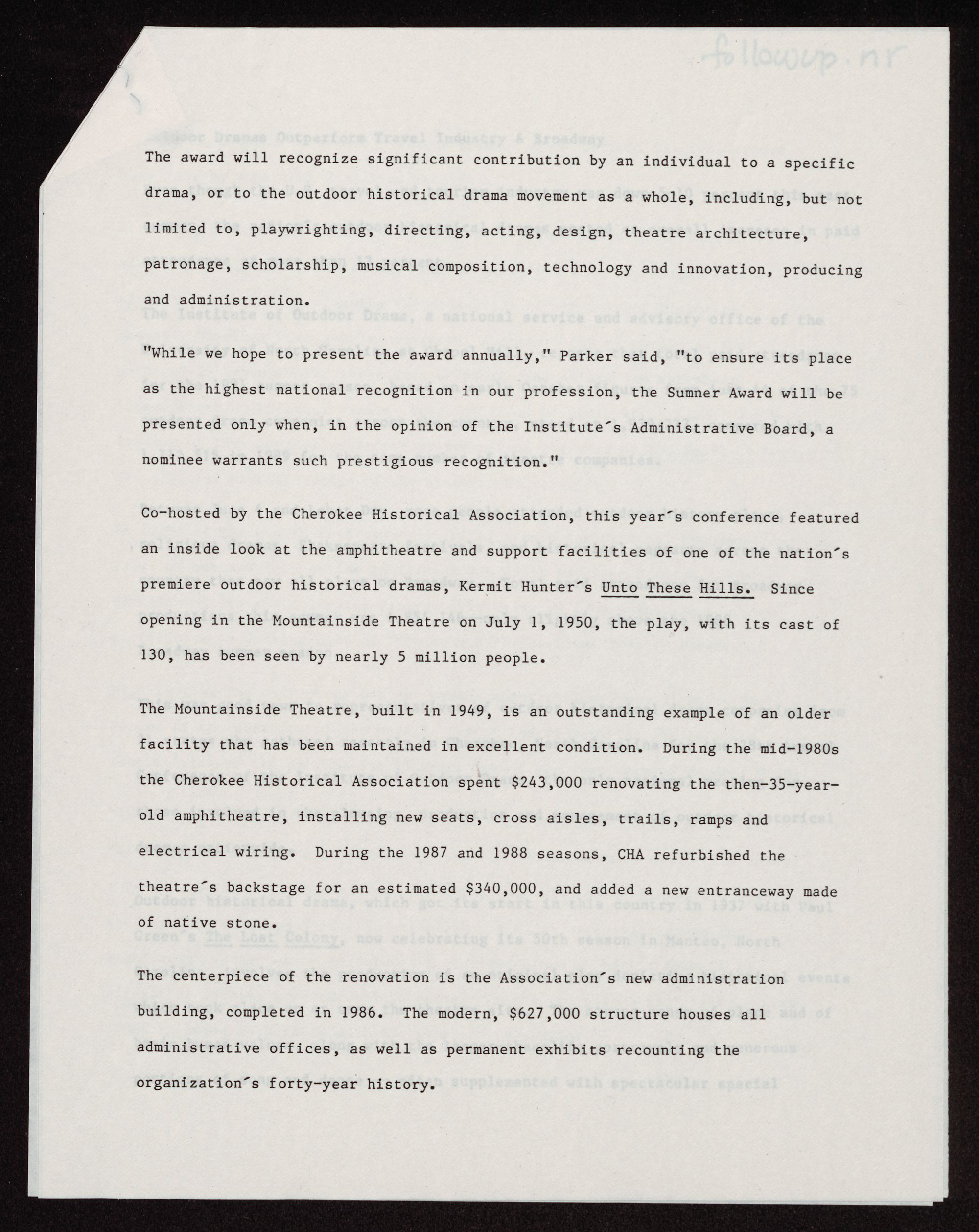 premiere outdoor historical dramas, Kermit Hunter~s Unto These Hills. Since