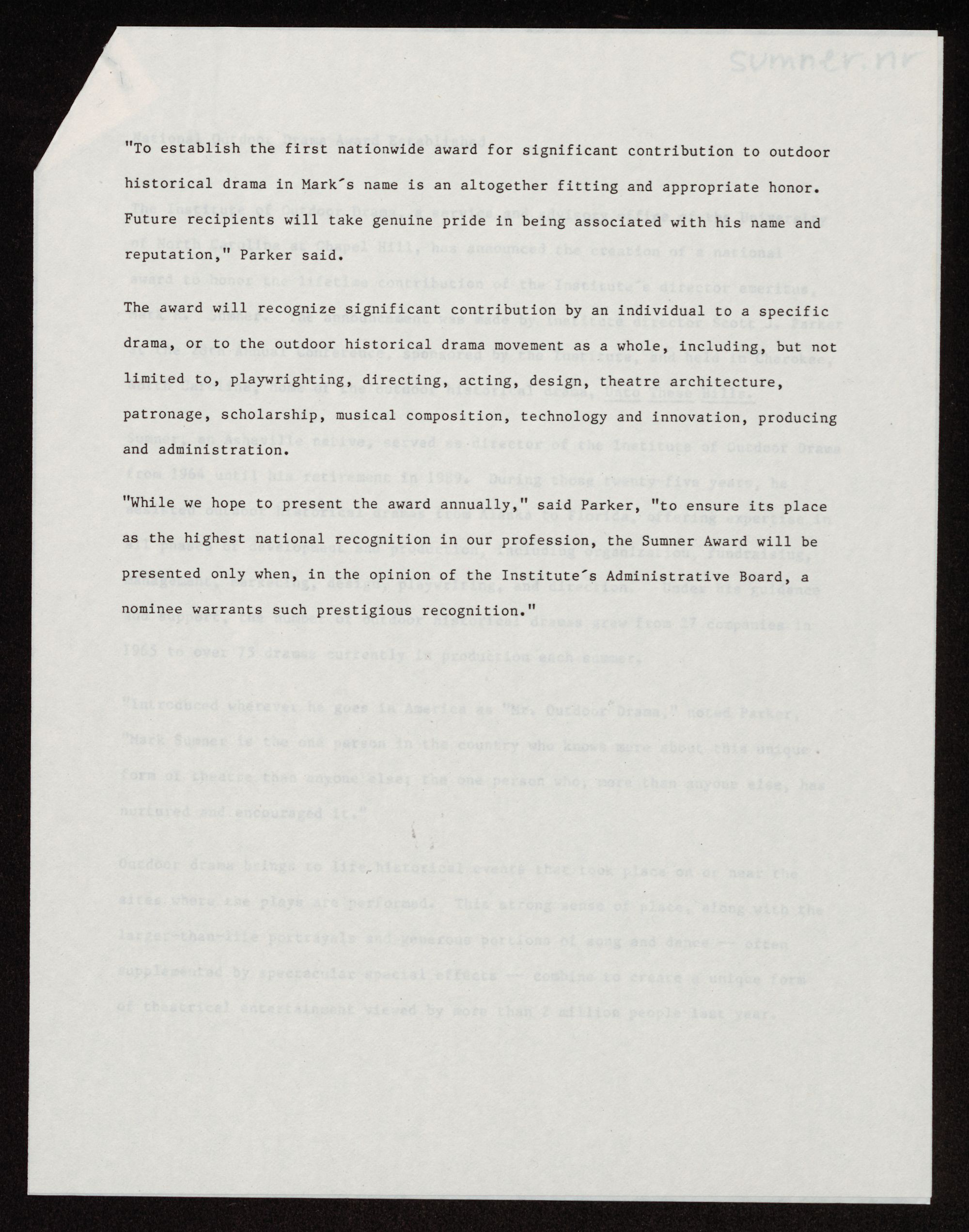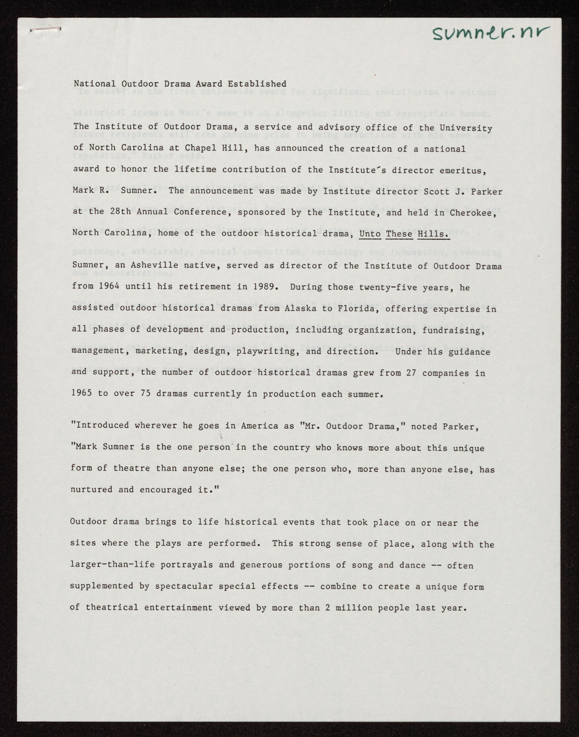 Sumner, an Asheville native, served as director of the Institute of Outdoor Drama