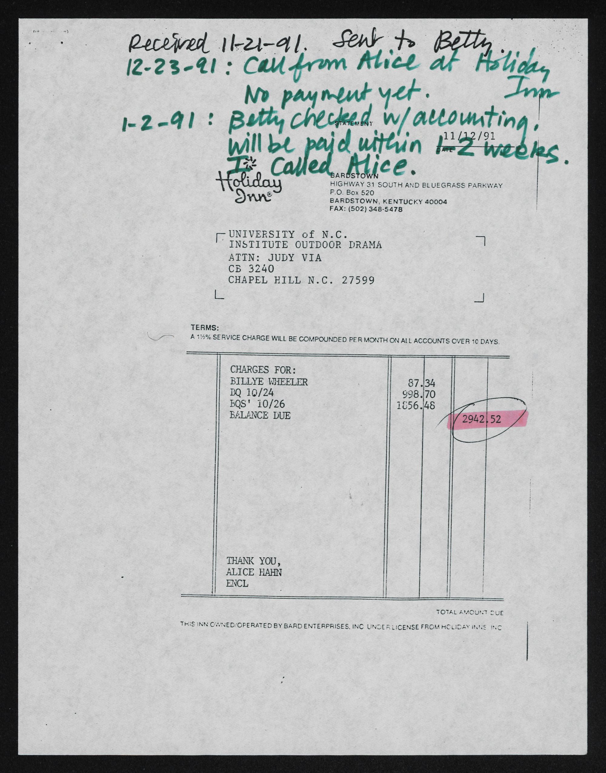 A 112% SERVICE CHARGE WILL BE COMPOUNDED PER MONTH ON ALL ACCOUNTS OVER 10 DAYS.