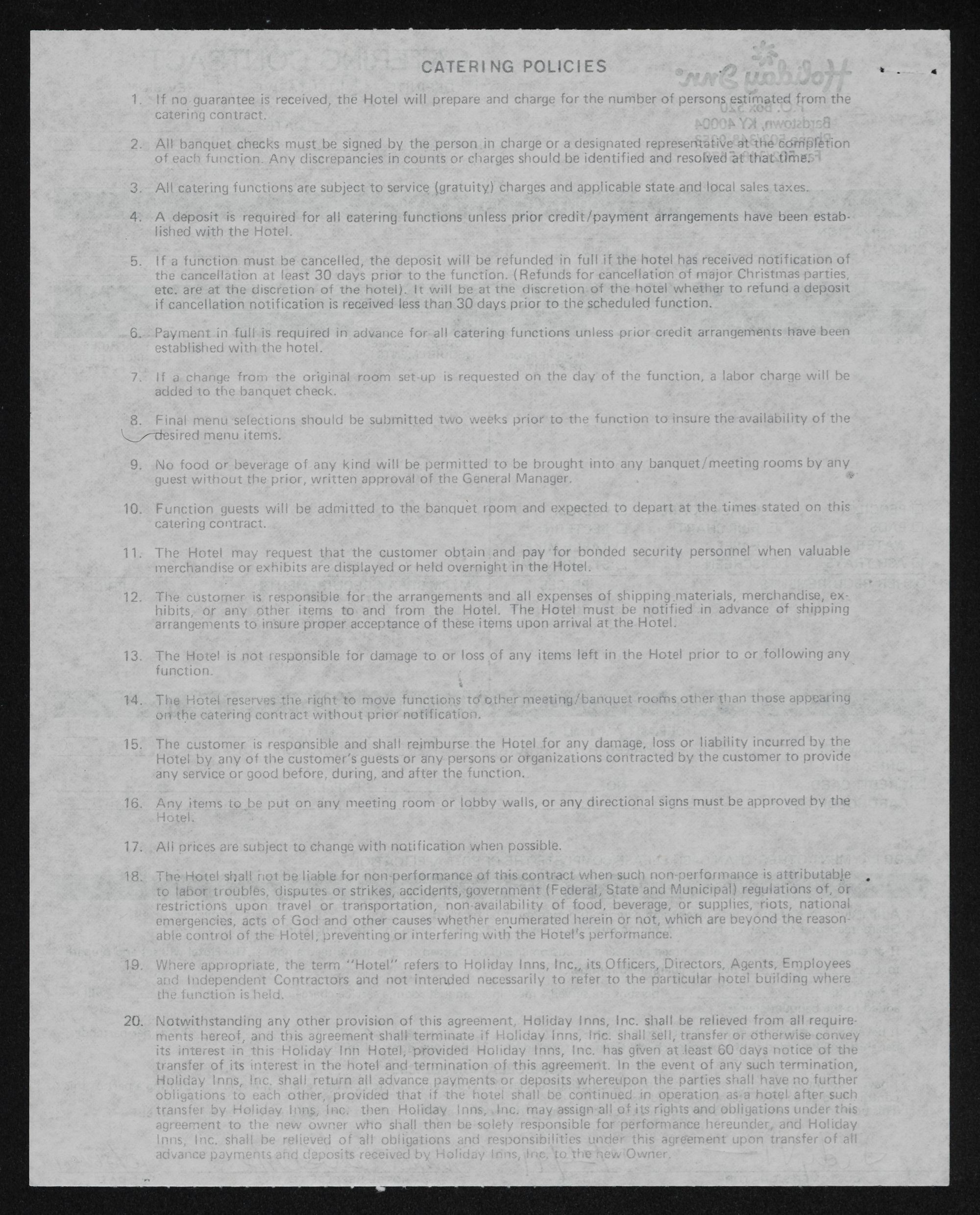 1. A final guarantee of the attendance at any catering function must be received 48 ; hours in advance.