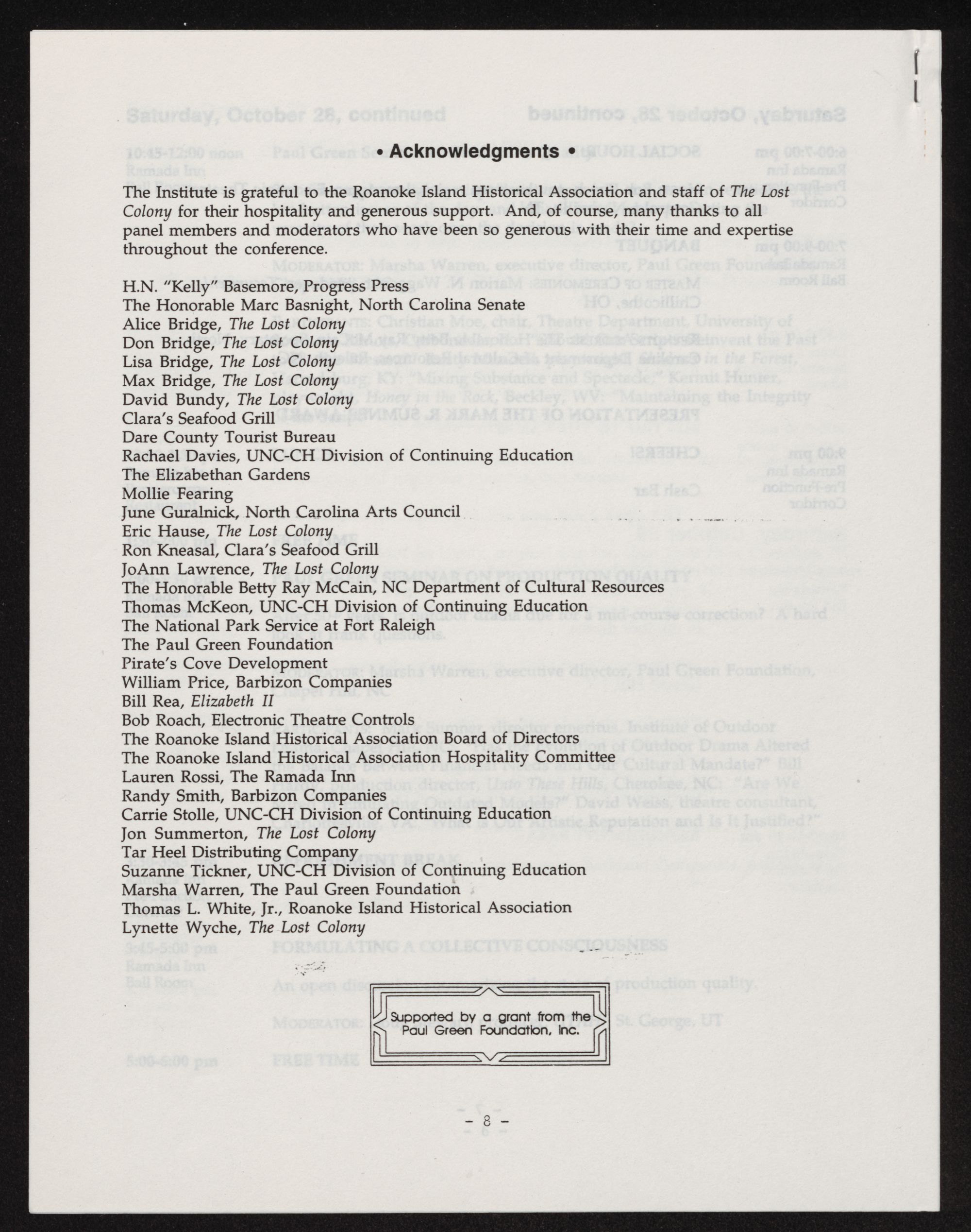 The Institute is grateful to the Roanoke Island Historical Association and staff of The Lost