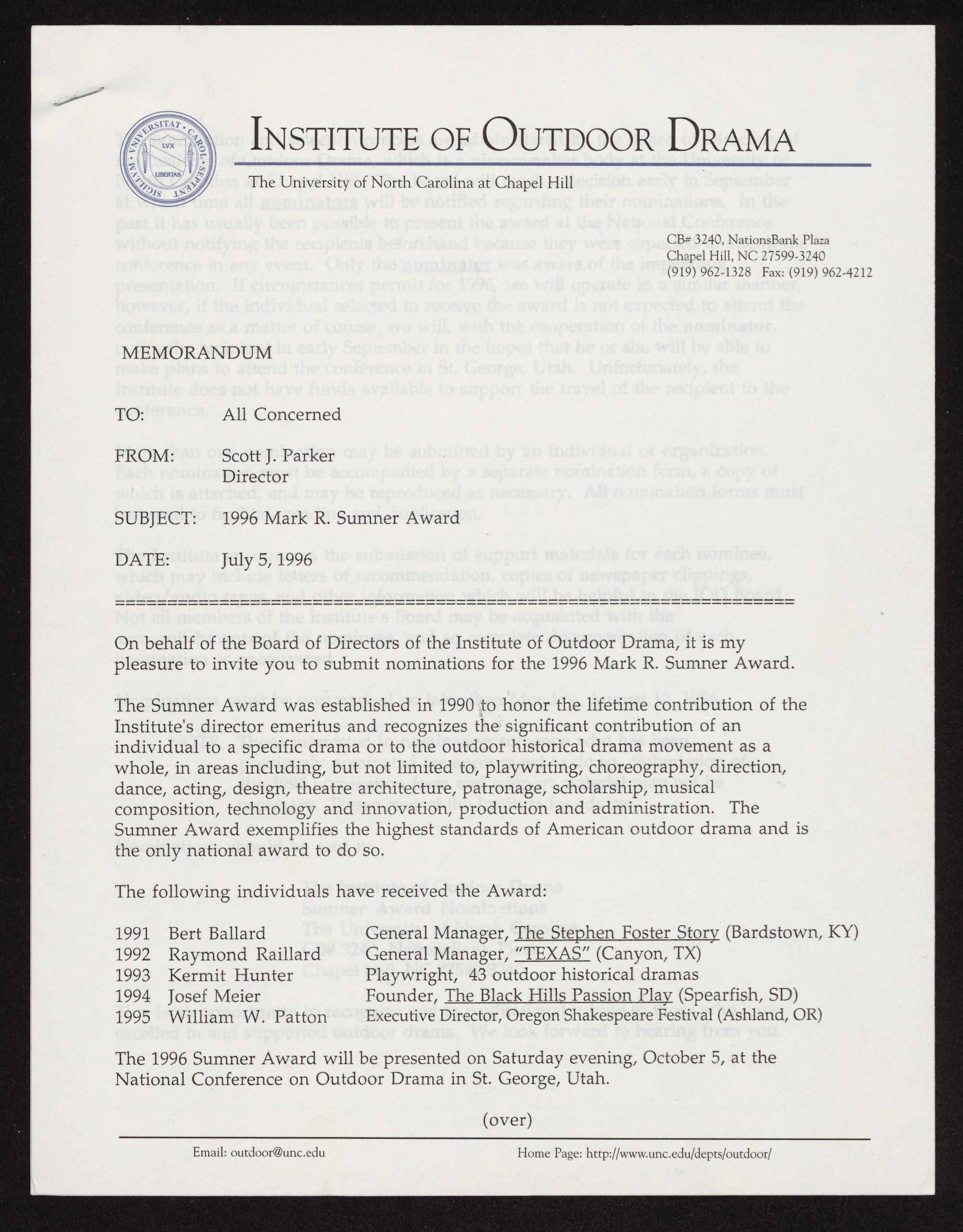 pleasure to invite you to submit nominations for the 1996 Mark R. Sumner Award.