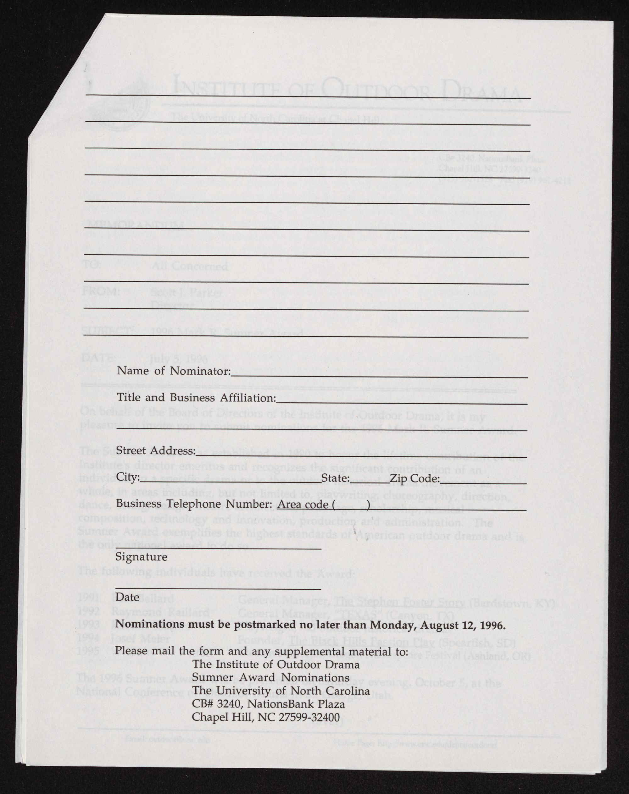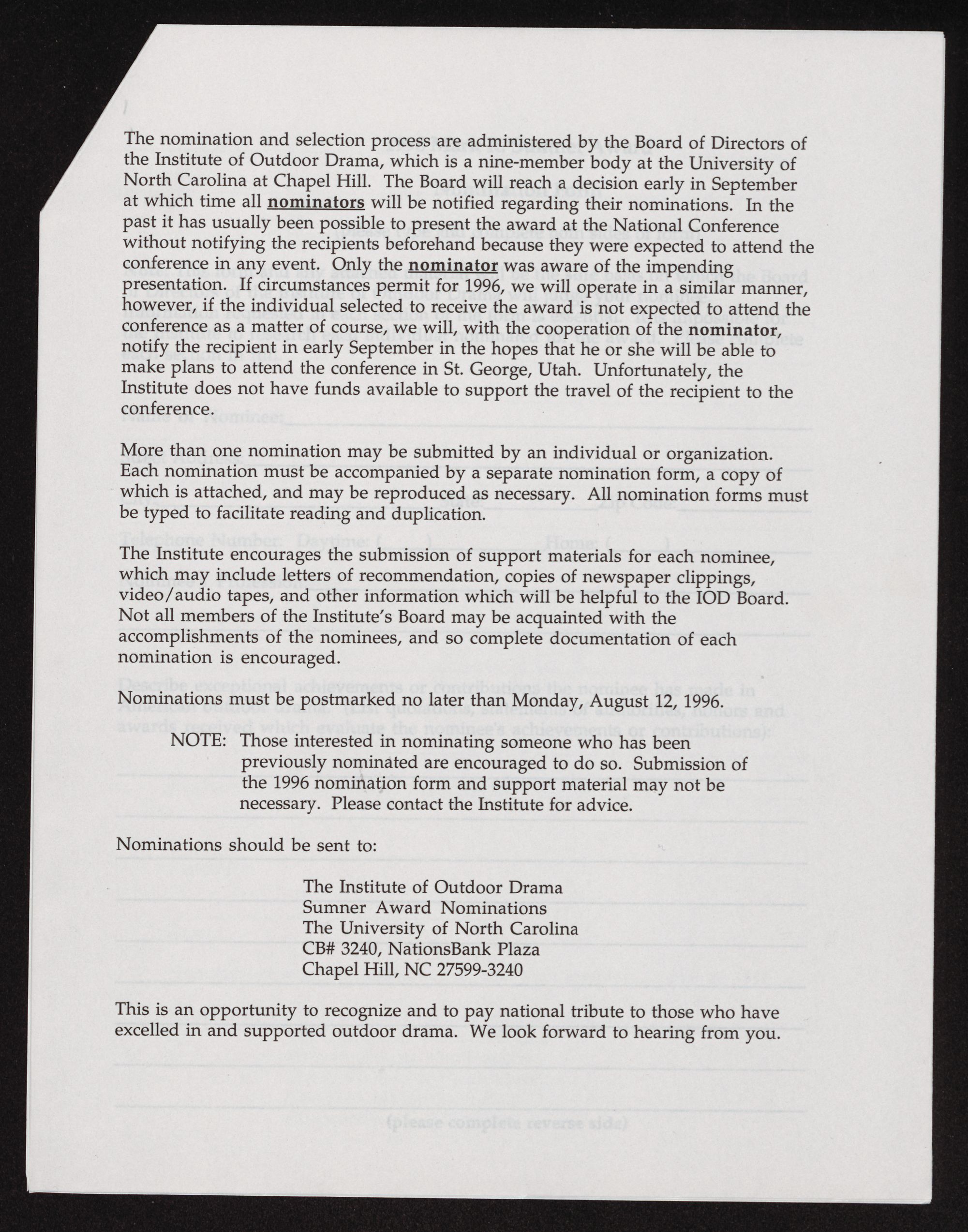 Nominations must be postmarked no later than Monday, August 12, 1996.