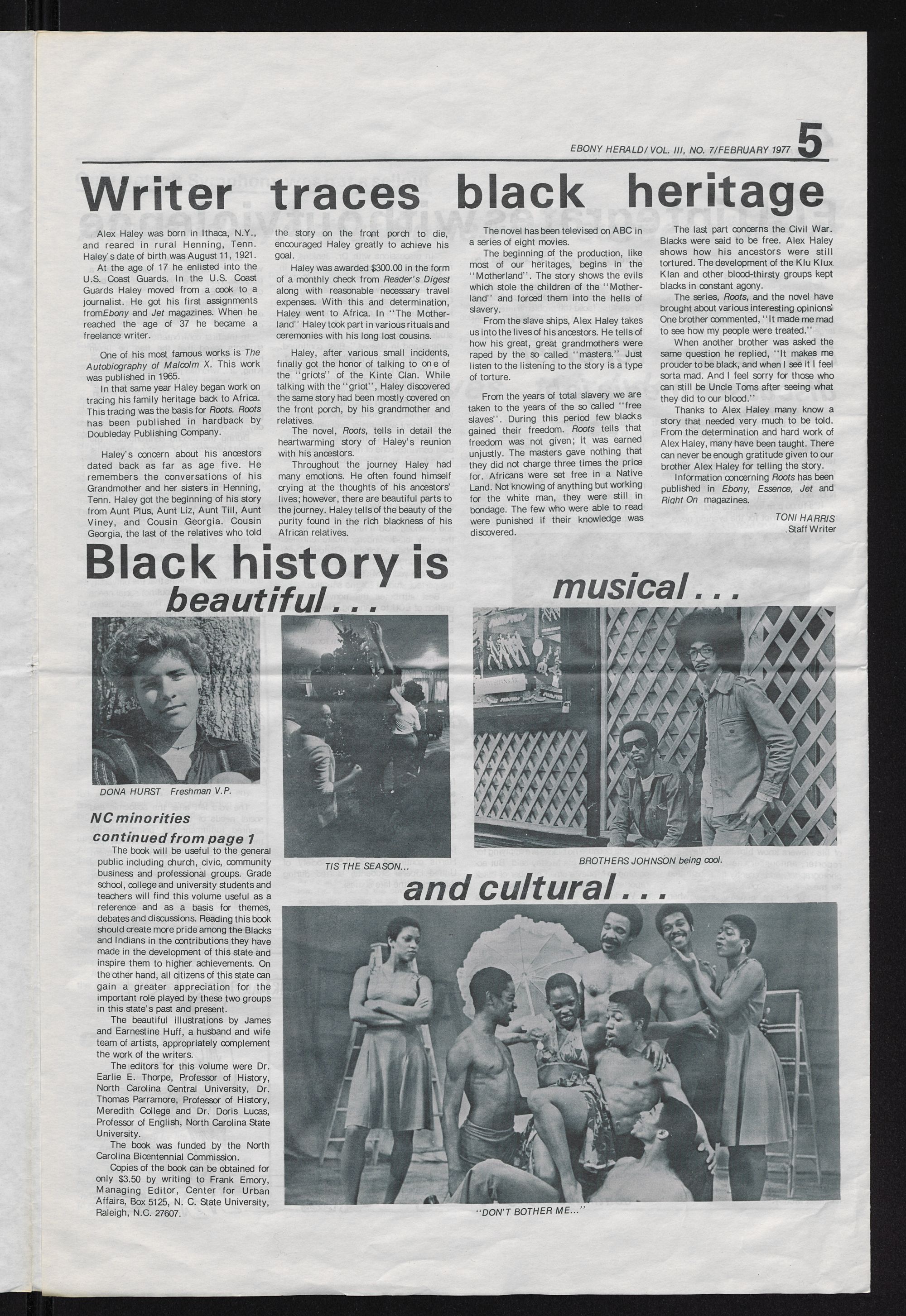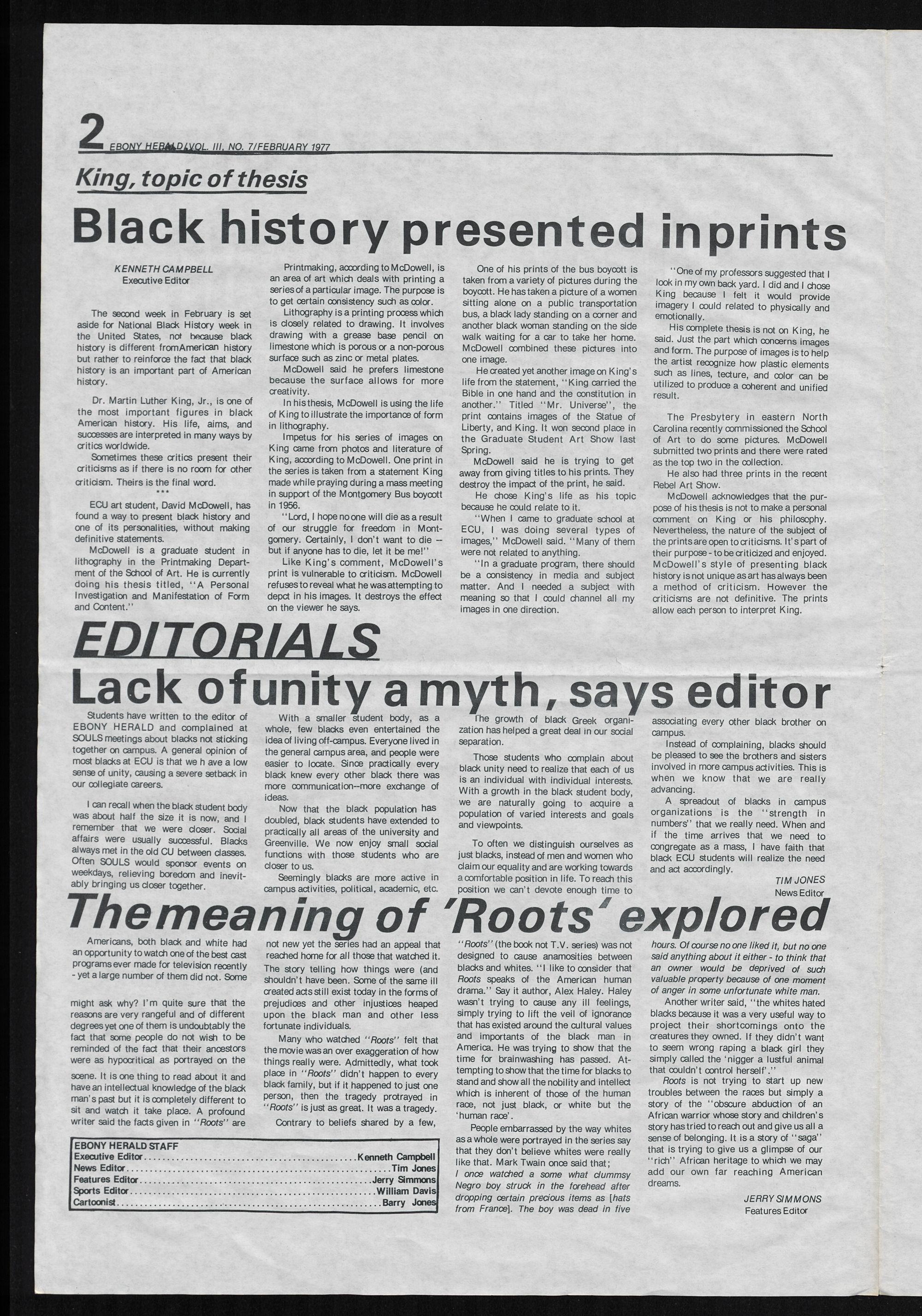 The Ebony Herald, Vol. III No. 7. Renaming Center still not final. The Ebony Herald was the first minority publication of East Carolina University. It was printed from 1975 through 1984.