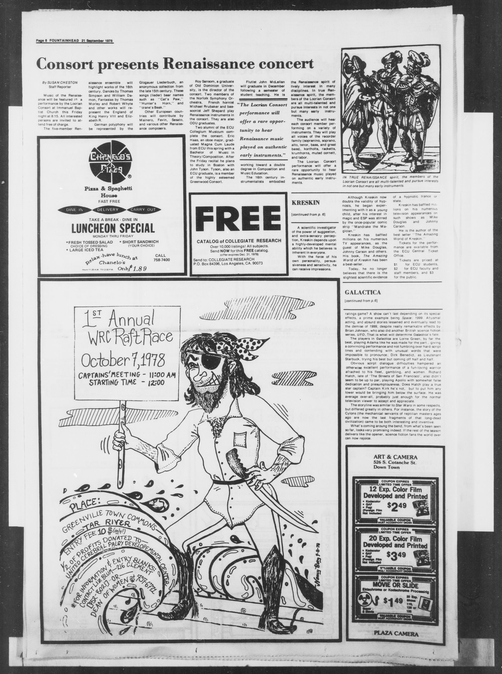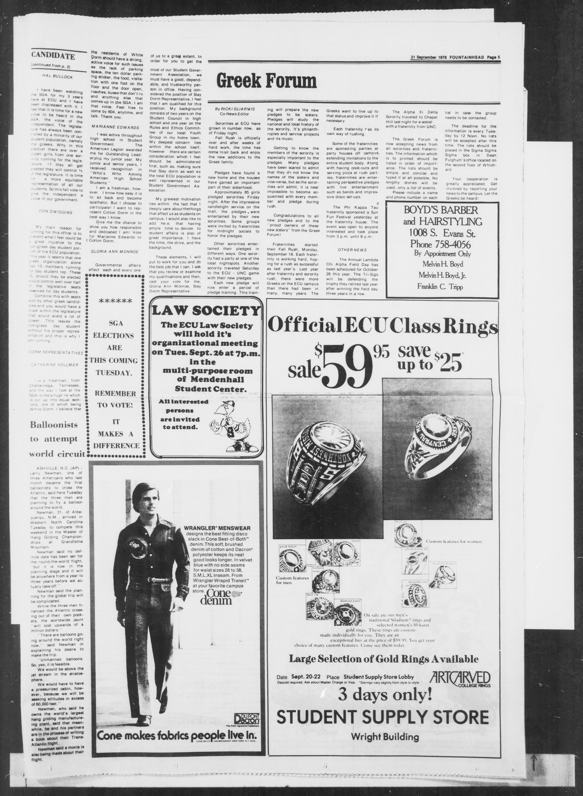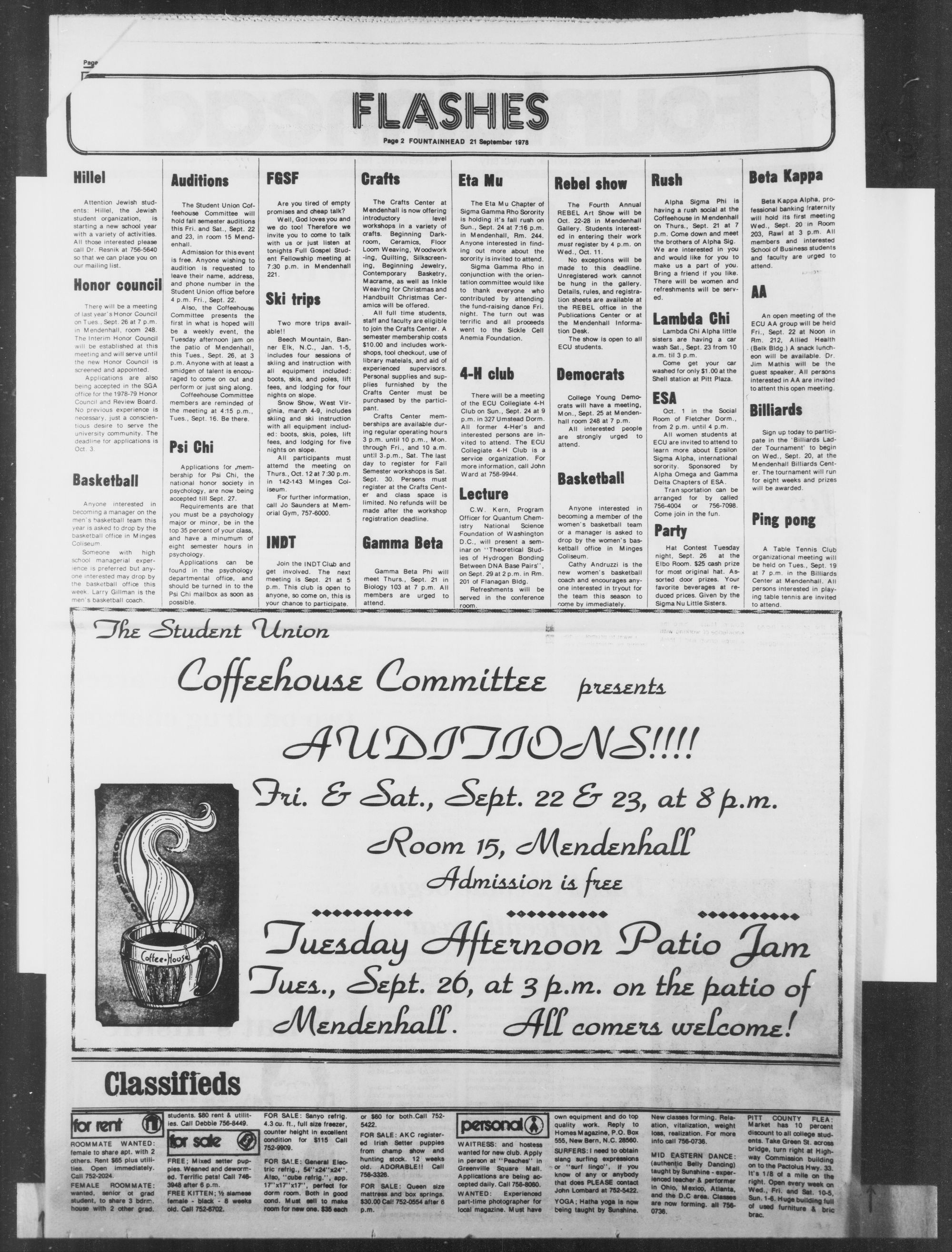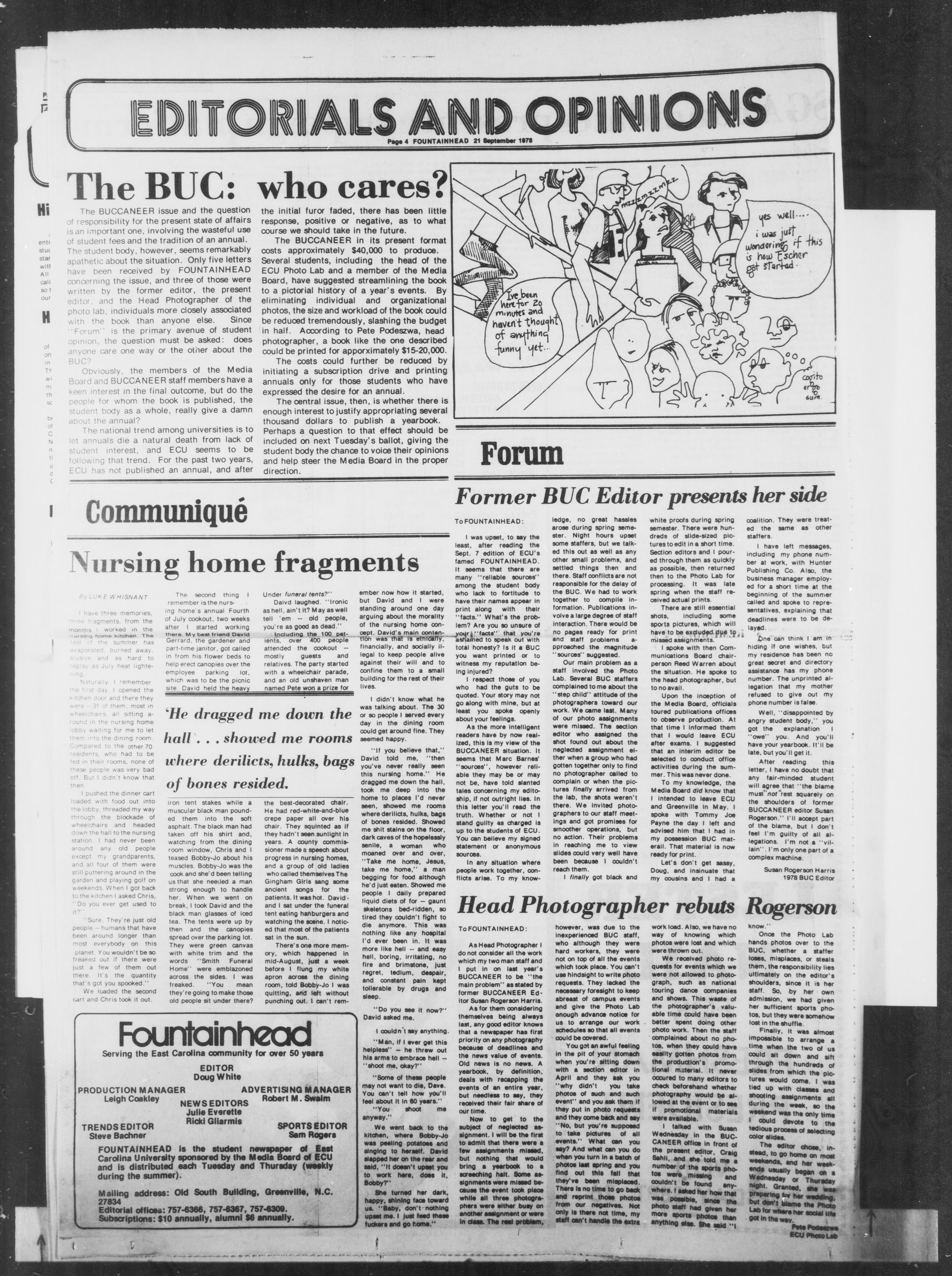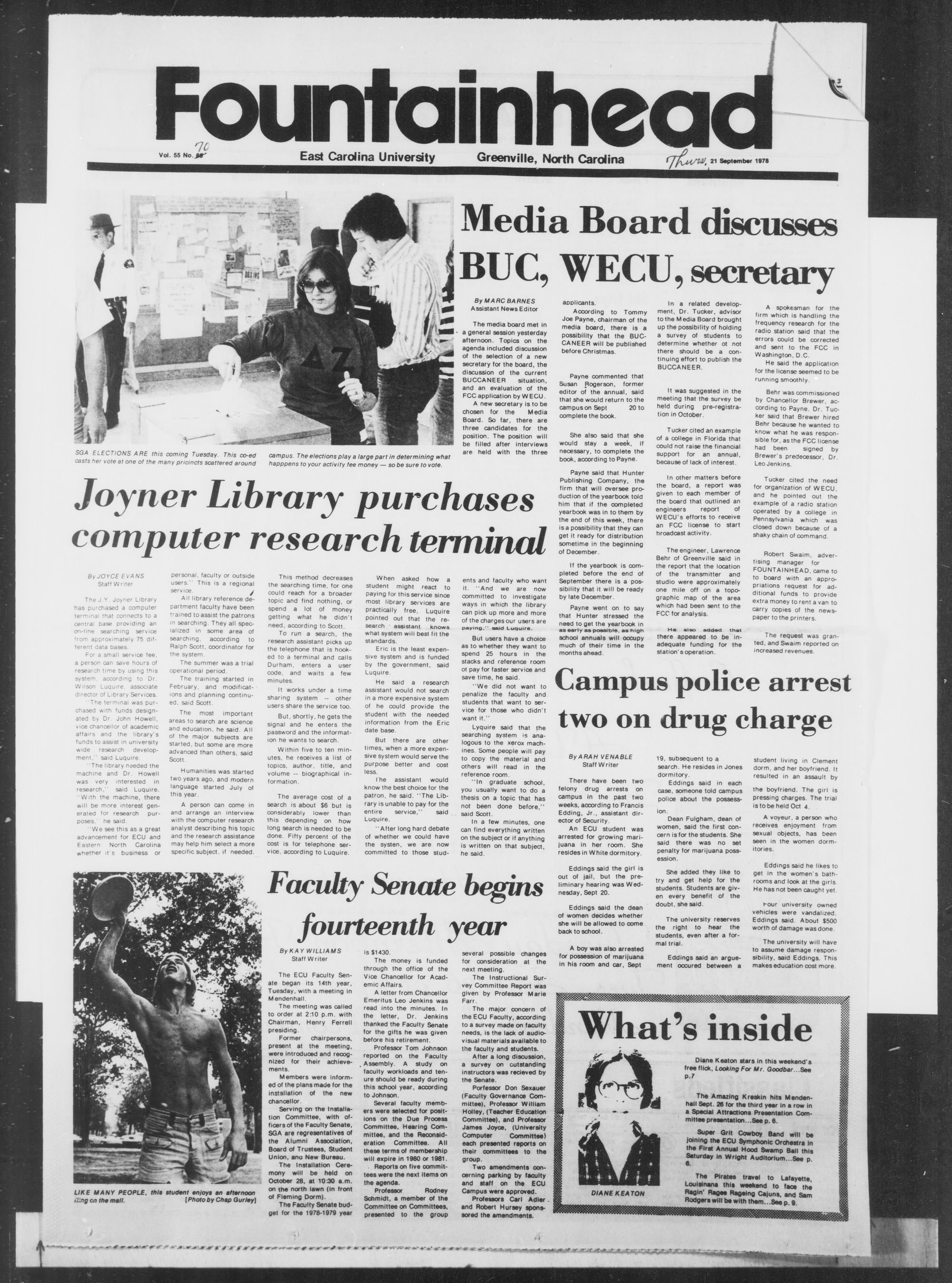 East Carolina's student-run campus newspaper was first published in 1923 as the East Carolina Teachers College News (1923-1925). It has been re-named as The Teco Echo (1925, 1926-1952), East Carolinian (1952-1969), Fountainhead (1969-1979), and The East Carolinian (1969, 1979-present). It includes local, state, national, and international stories with a focus on campus events.