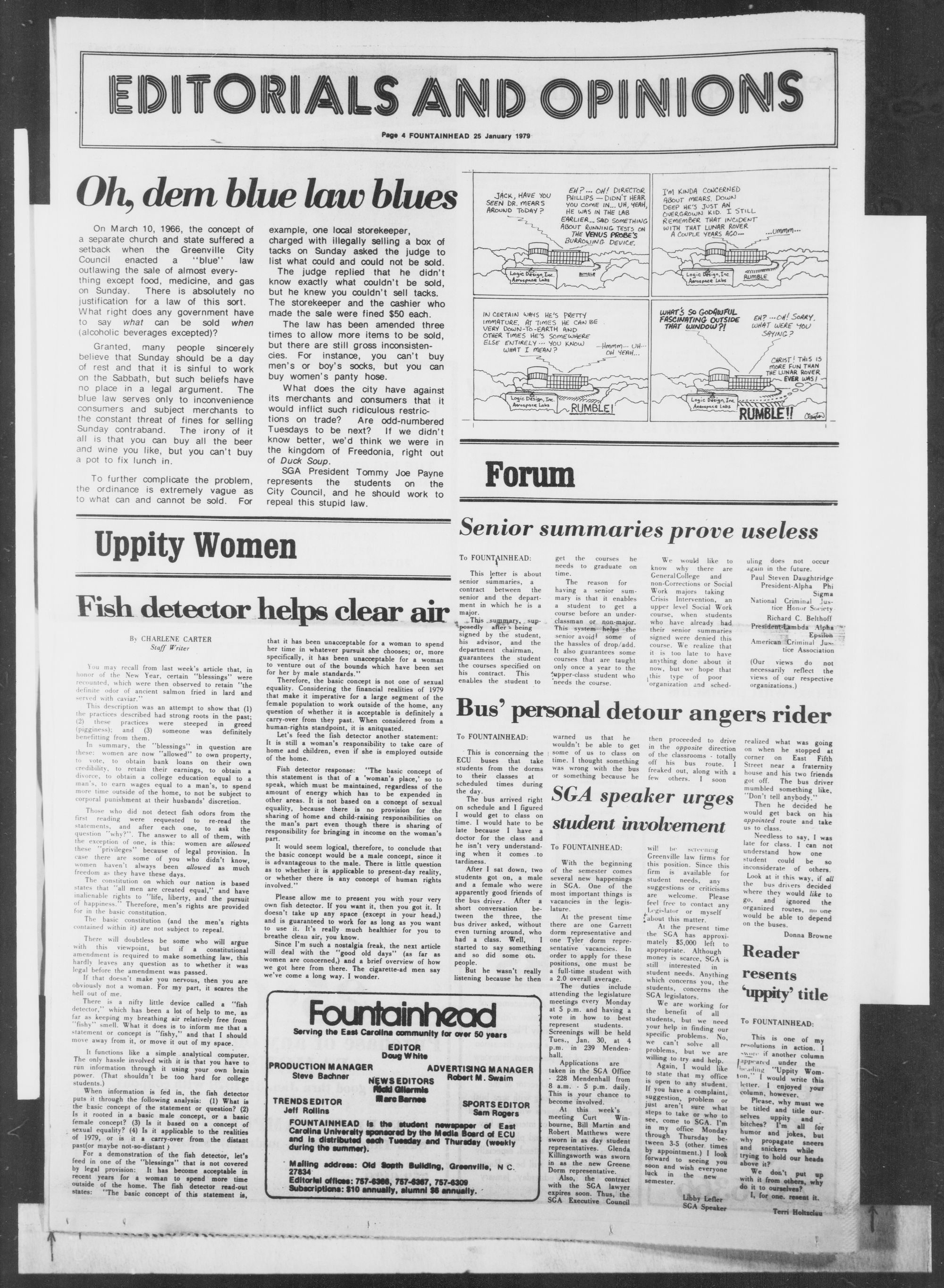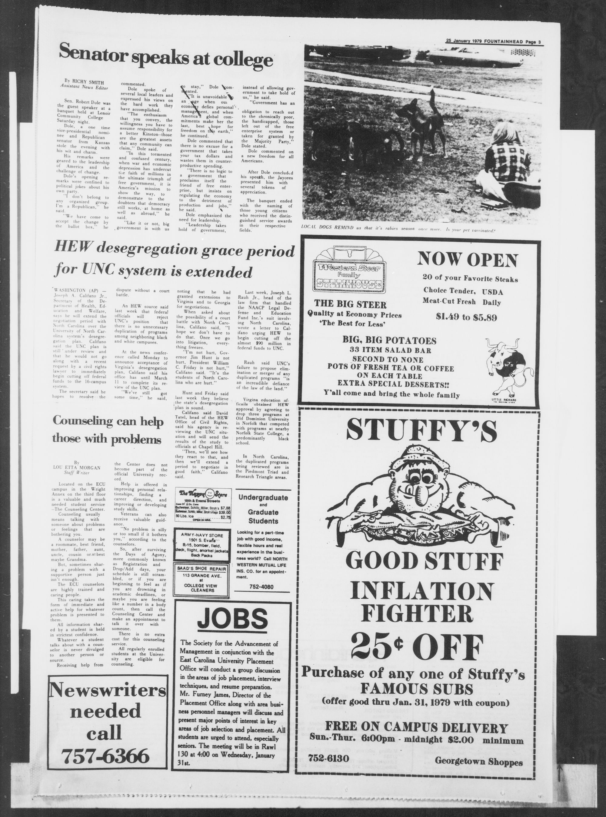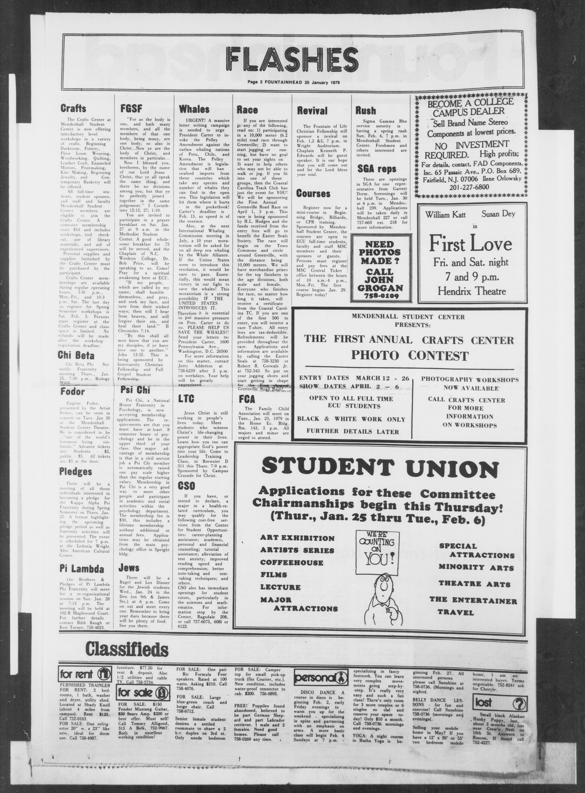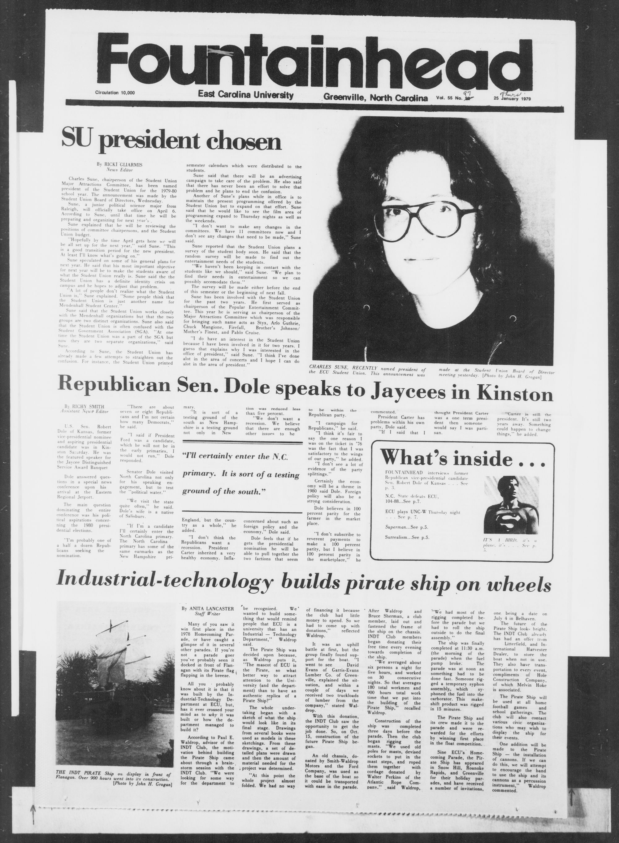 East Carolina's student-run campus newspaper was first published in 1923 as the East Carolina Teachers College News (1923-1925). It has been re-named as The Teco Echo (1925, 1926-1952), East Carolinian (1952-1969), Fountainhead (1969-1979), and The East Carolinian (1969, 1979-present). It includes local, state, national, and international stories with a focus on campus events.