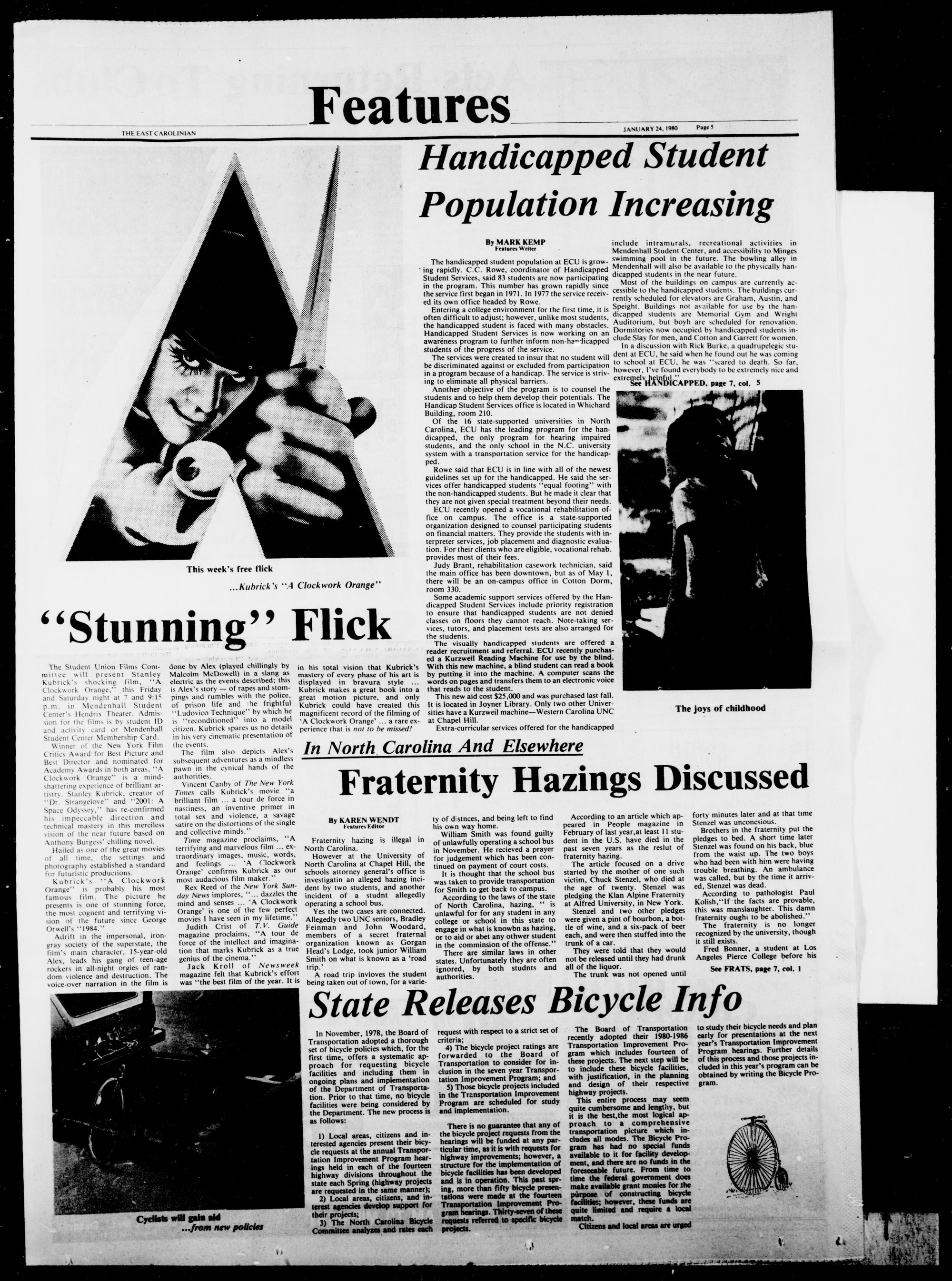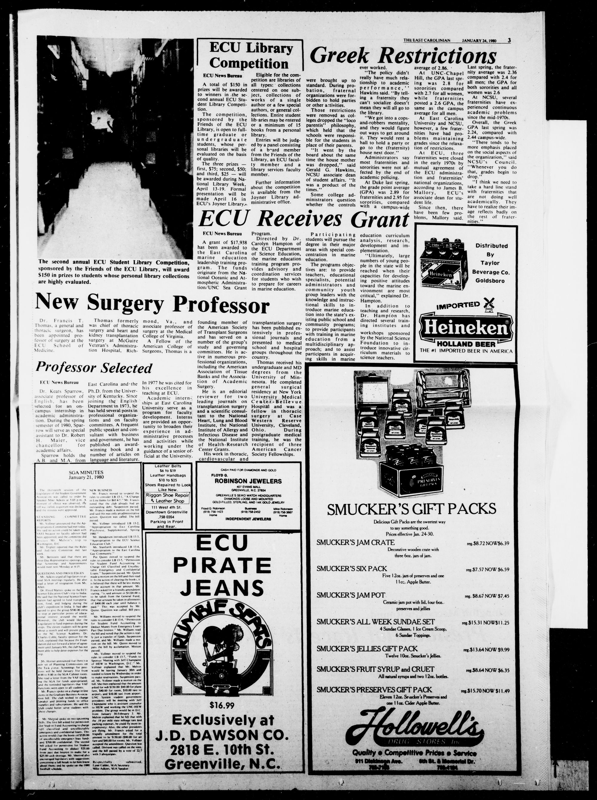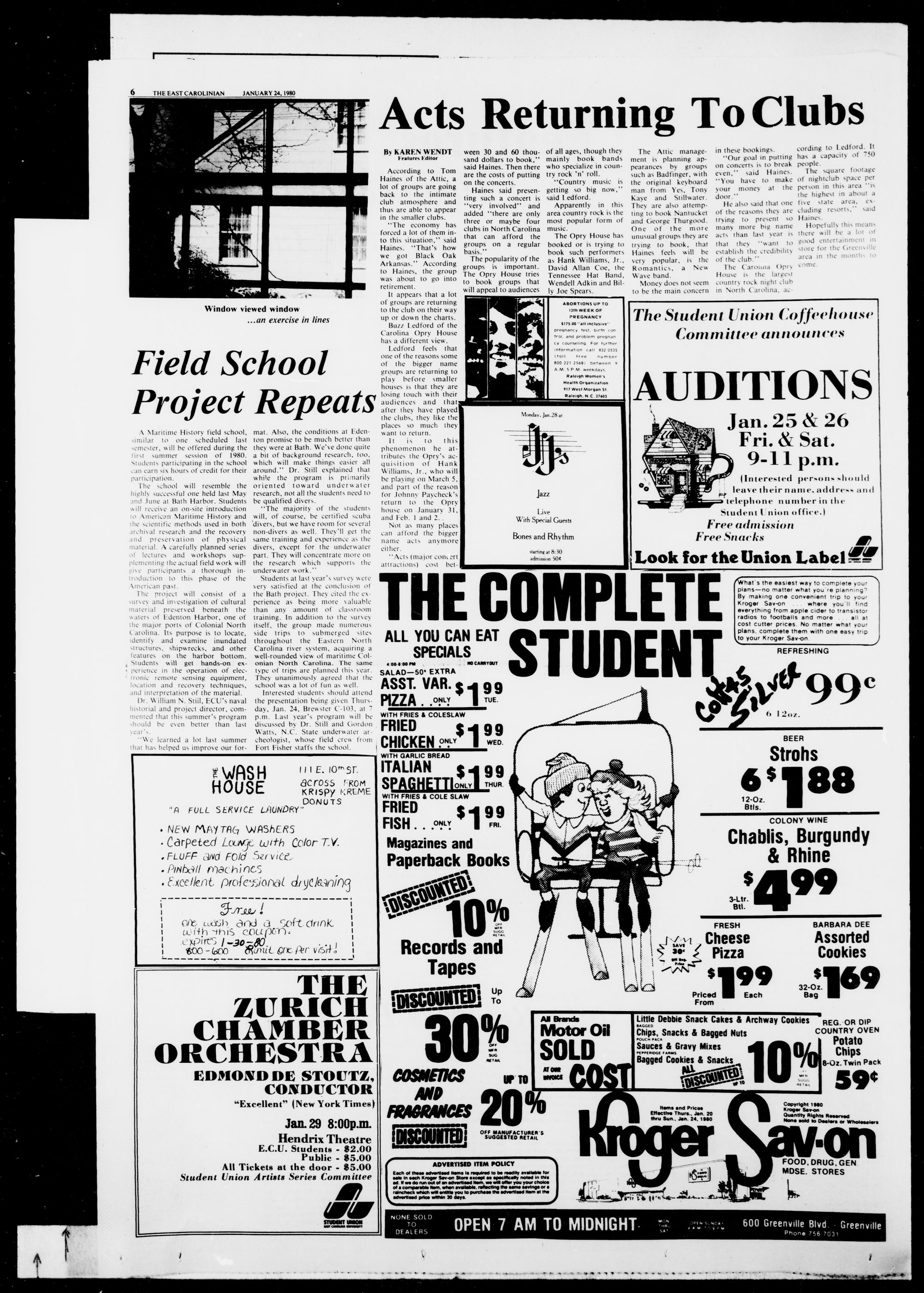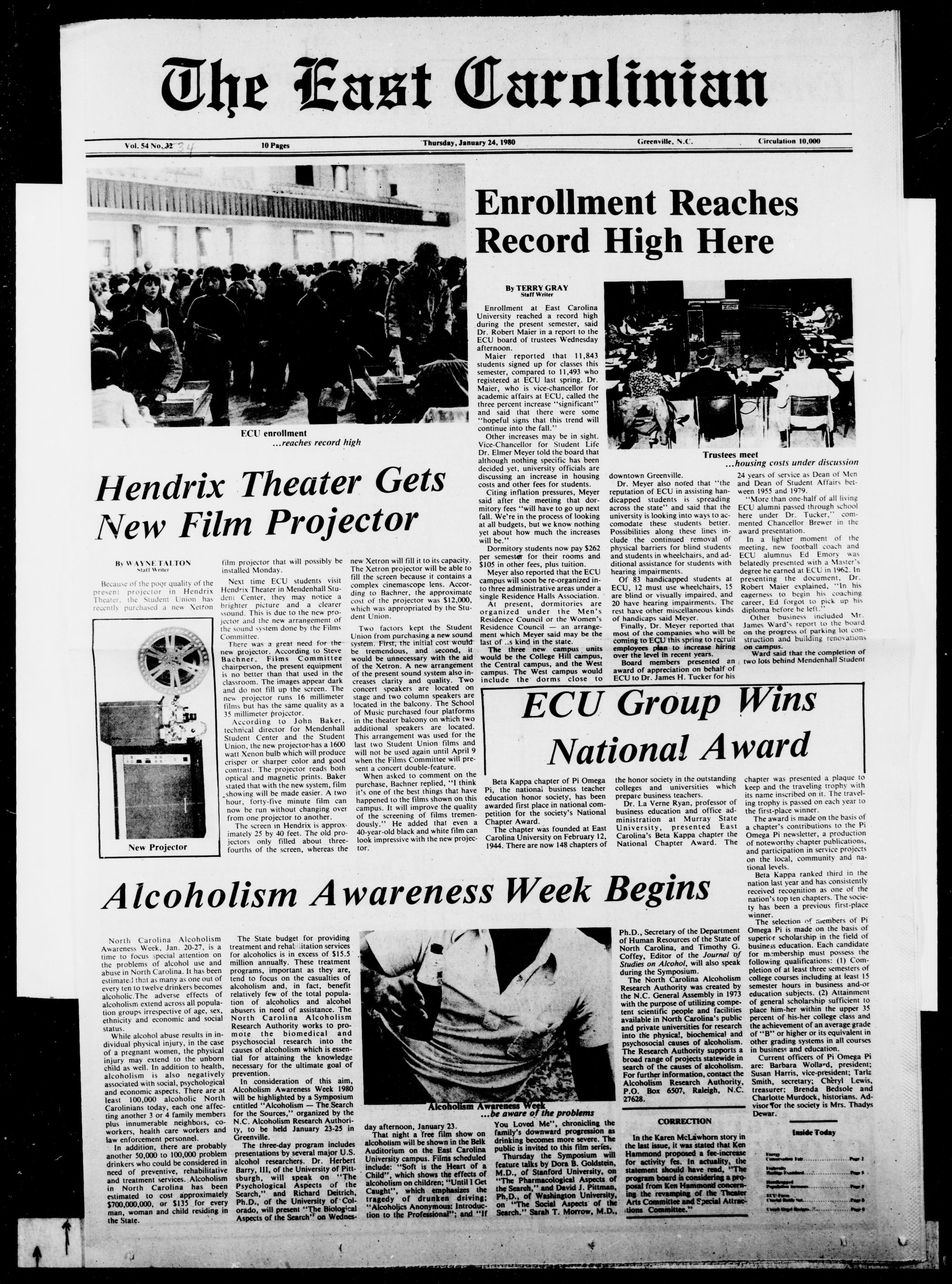 East Carolina's student-run campus newspaper was first published in 1923 as the East Carolina Teachers College News (1923-1925). It has been re-named as The Teco Echo (1925, 1926-1952), East Carolinian (1952-1969), Fountainhead (1969-1979), and The East Carolinian (1969, 1979-present). It includes local, state, national, and international stories with a focus on campus events.