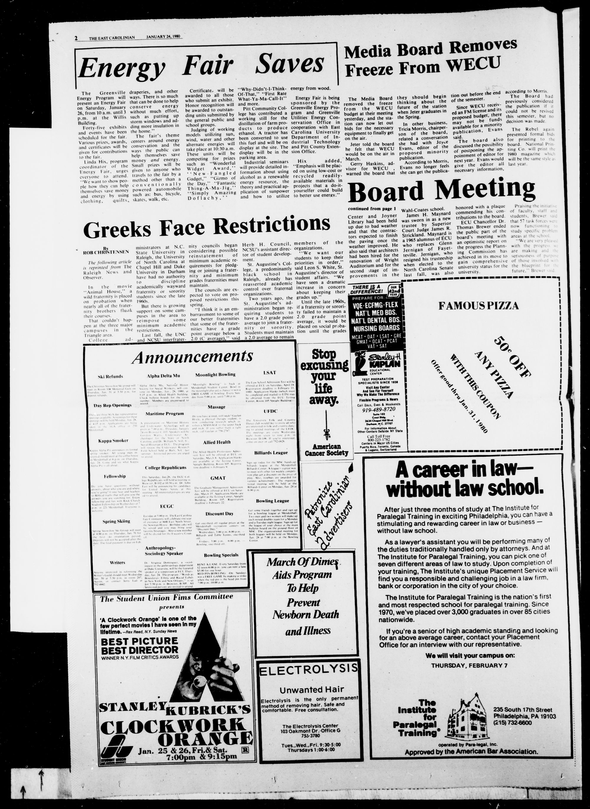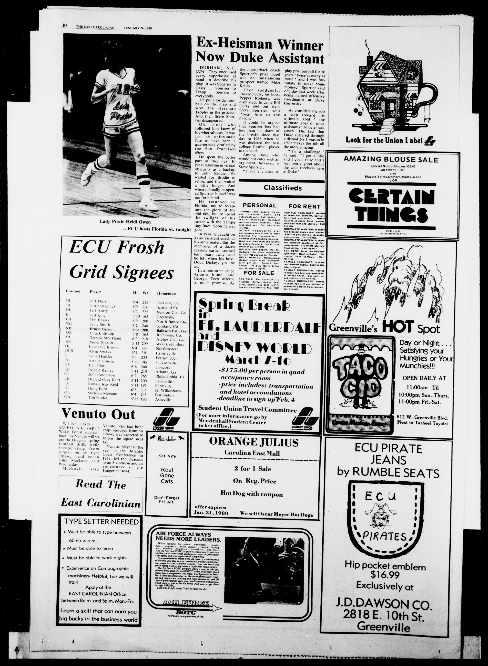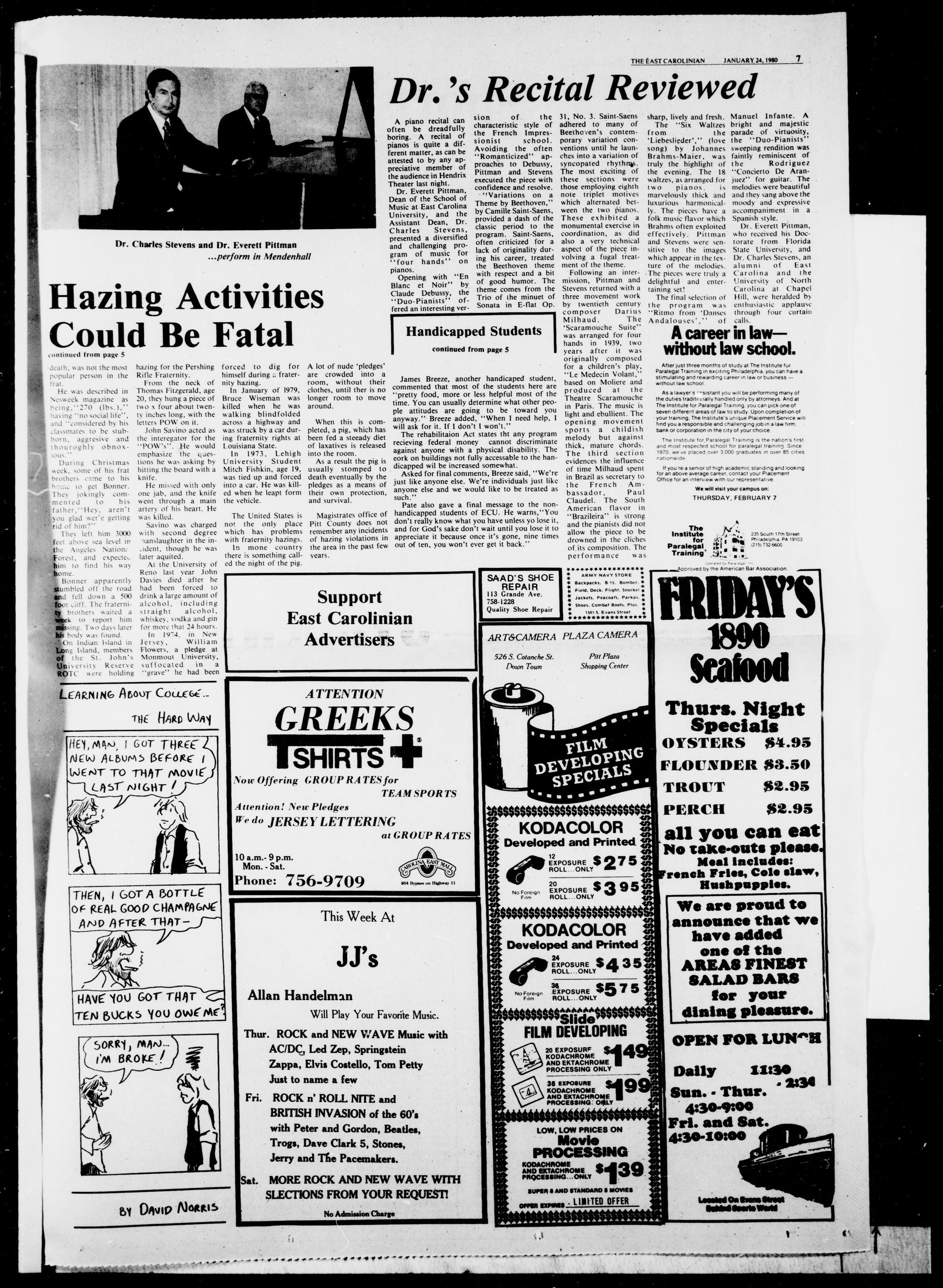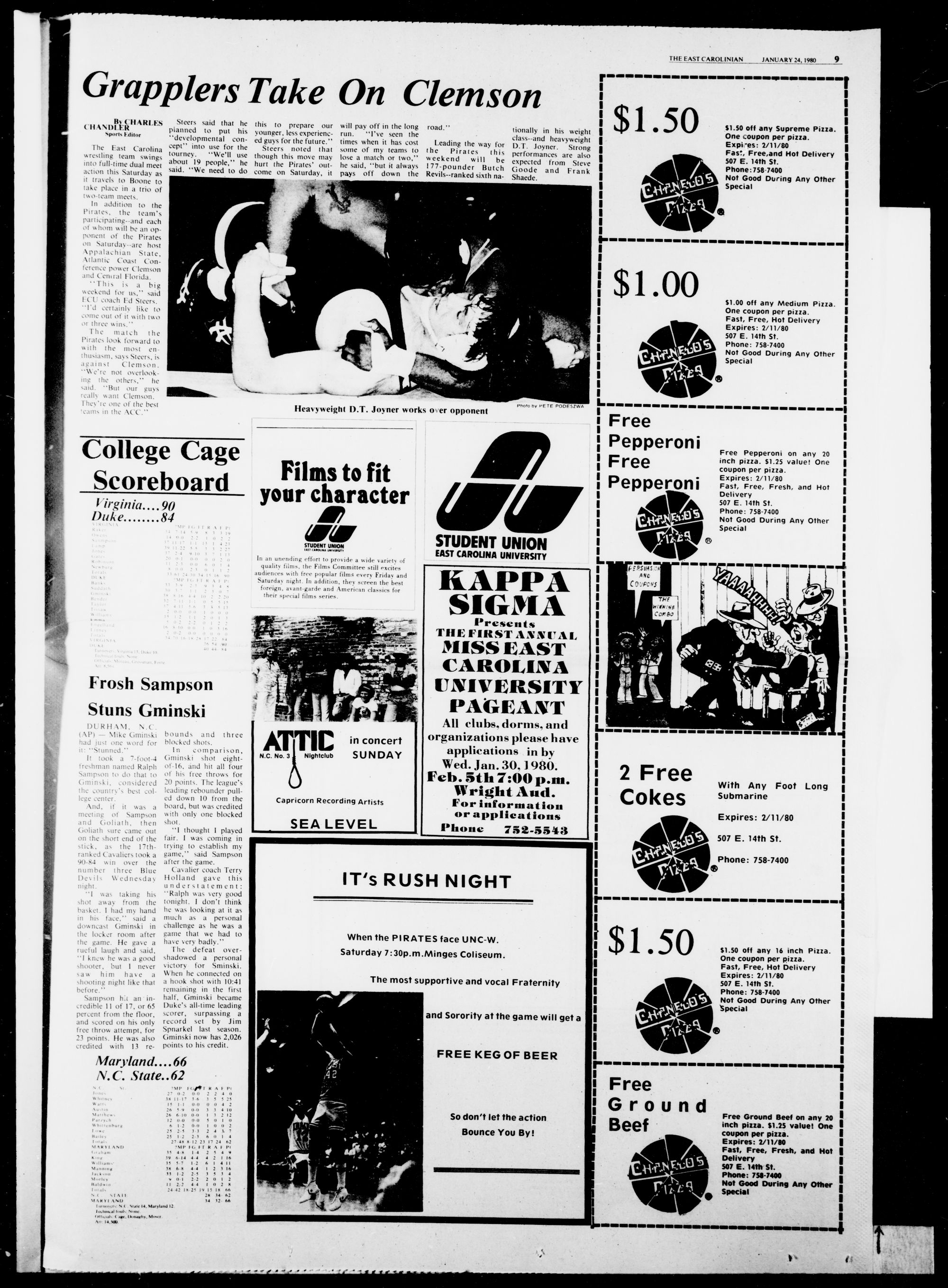 East Carolina's student-run campus newspaper was first published in 1923 as the East Carolina Teachers College News (1923-1925). It has been re-named as The Teco Echo (1925, 1926-1952), East Carolinian (1952-1969), Fountainhead (1969-1979), and The East Carolinian (1969, 1979-present). It includes local, state, national, and international stories with a focus on campus events.