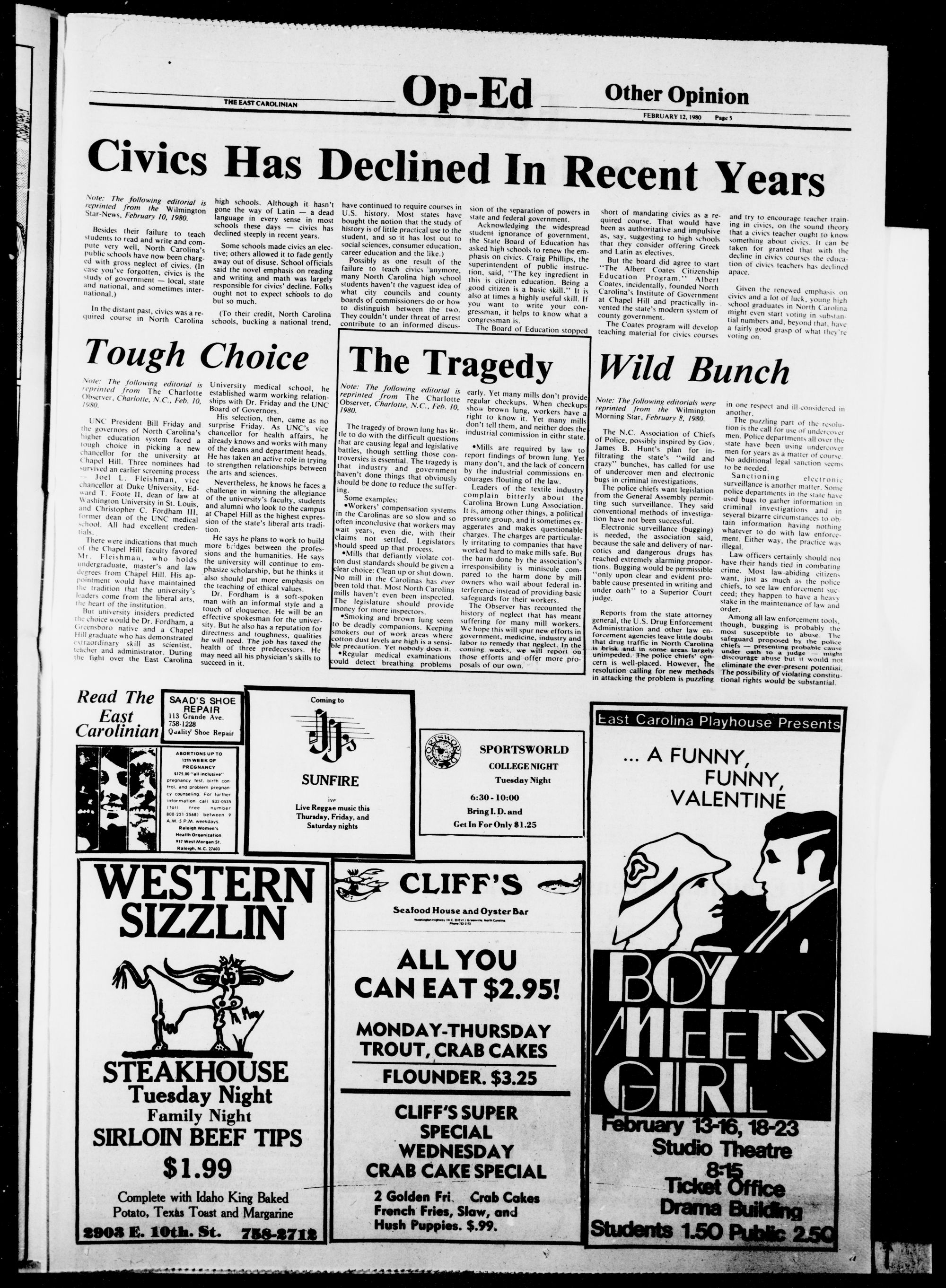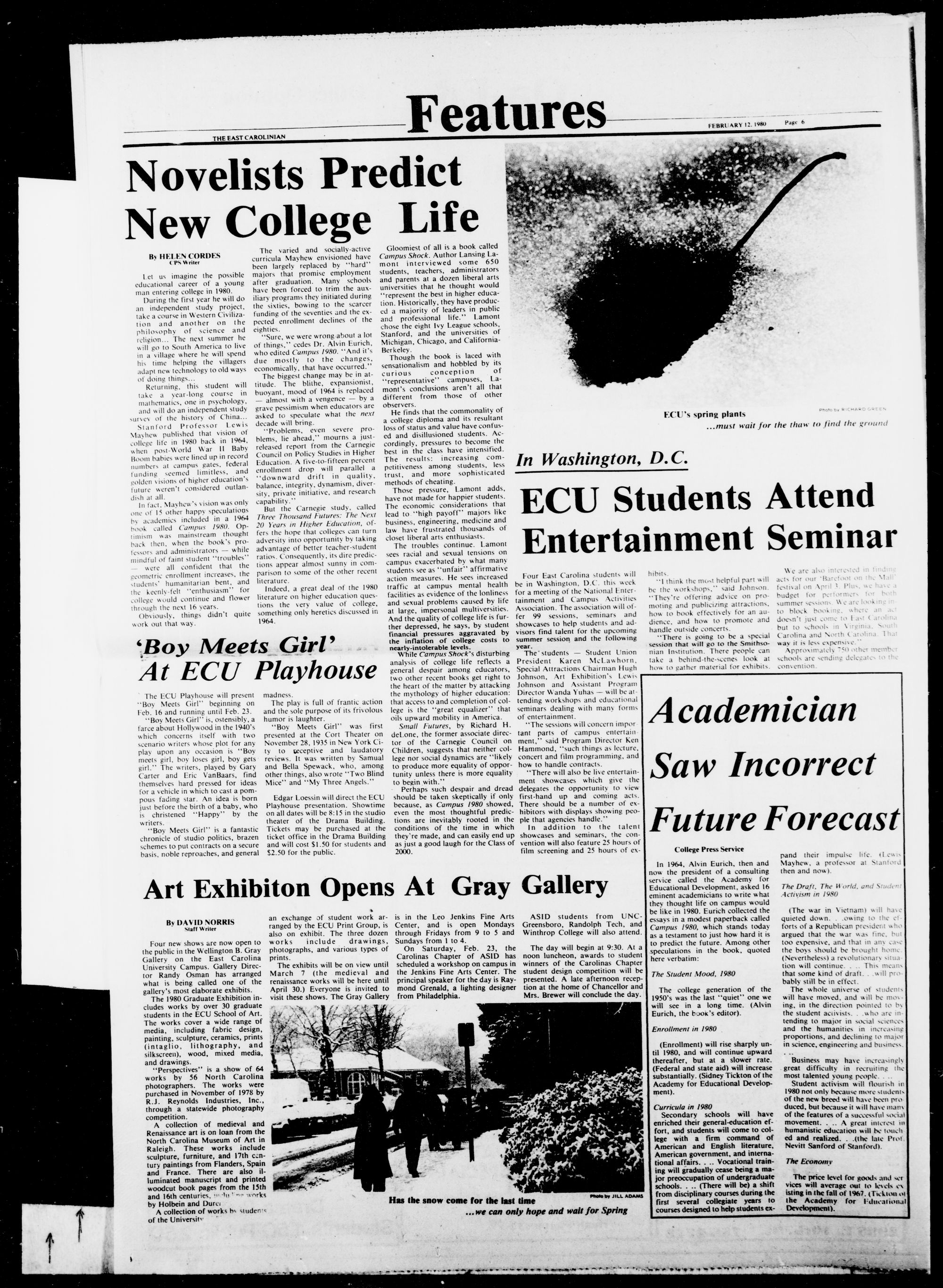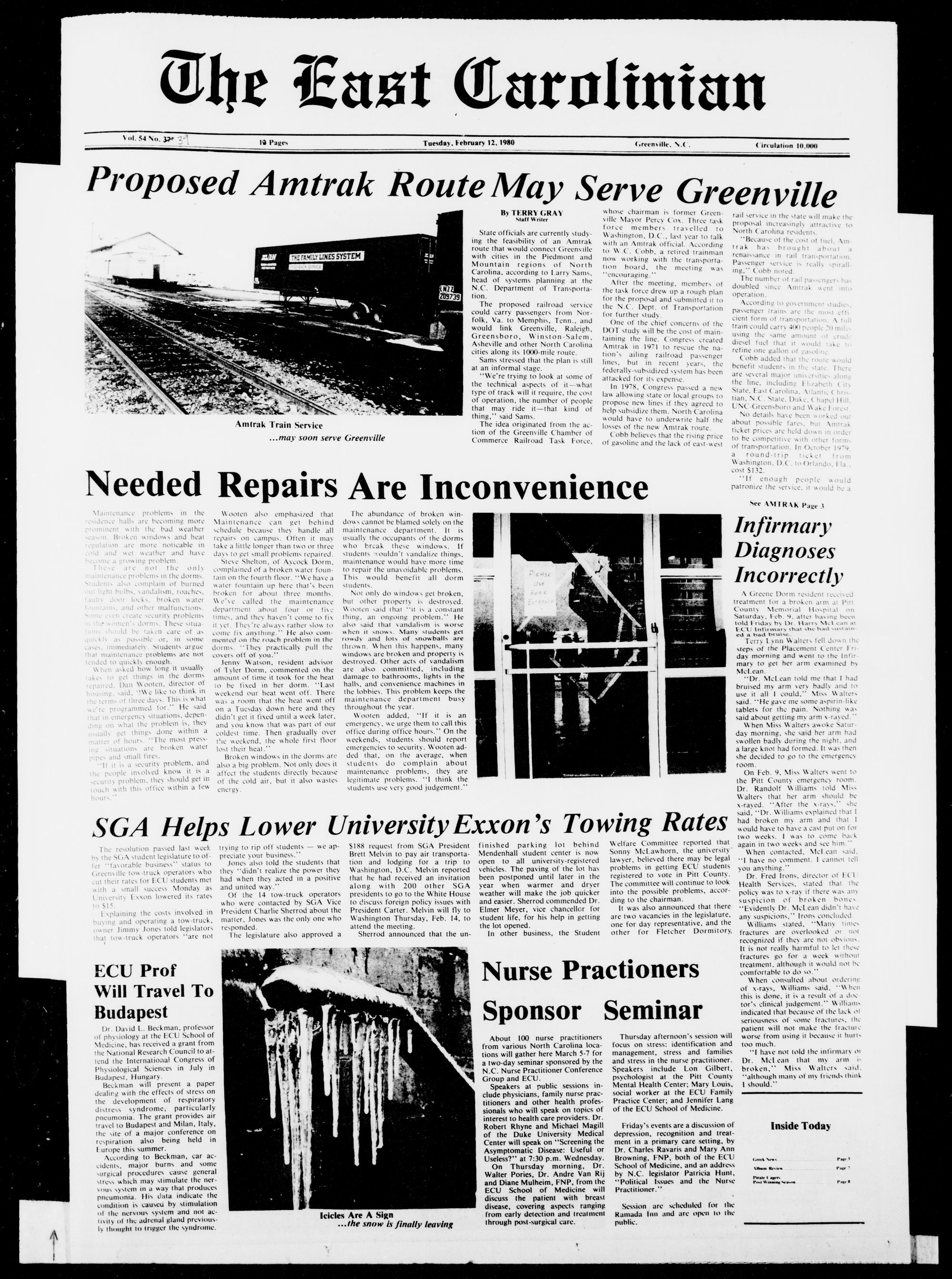 East Carolina's student-run campus newspaper was first published in 1923 as the East Carolina Teachers College News (1923-1925). It has been re-named as The Teco Echo (1925, 1926-1952), East Carolinian (1952-1969), Fountainhead (1969-1979), and The East Carolinian (1969, 1979-present). It includes local, state, national, and international stories with a focus on campus events.