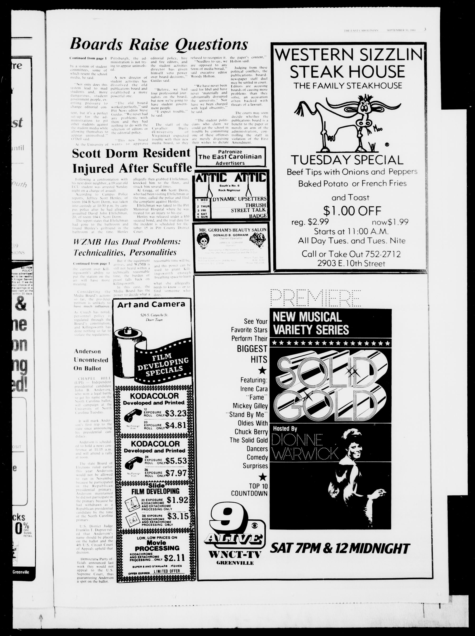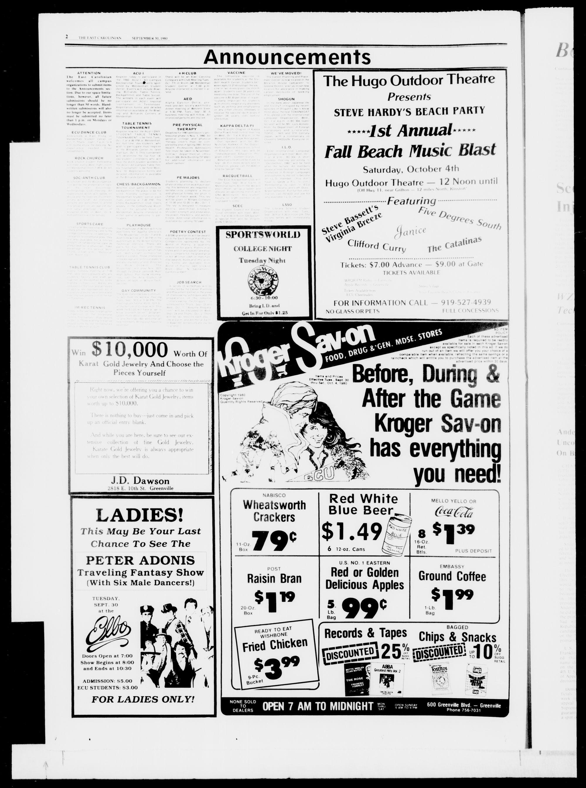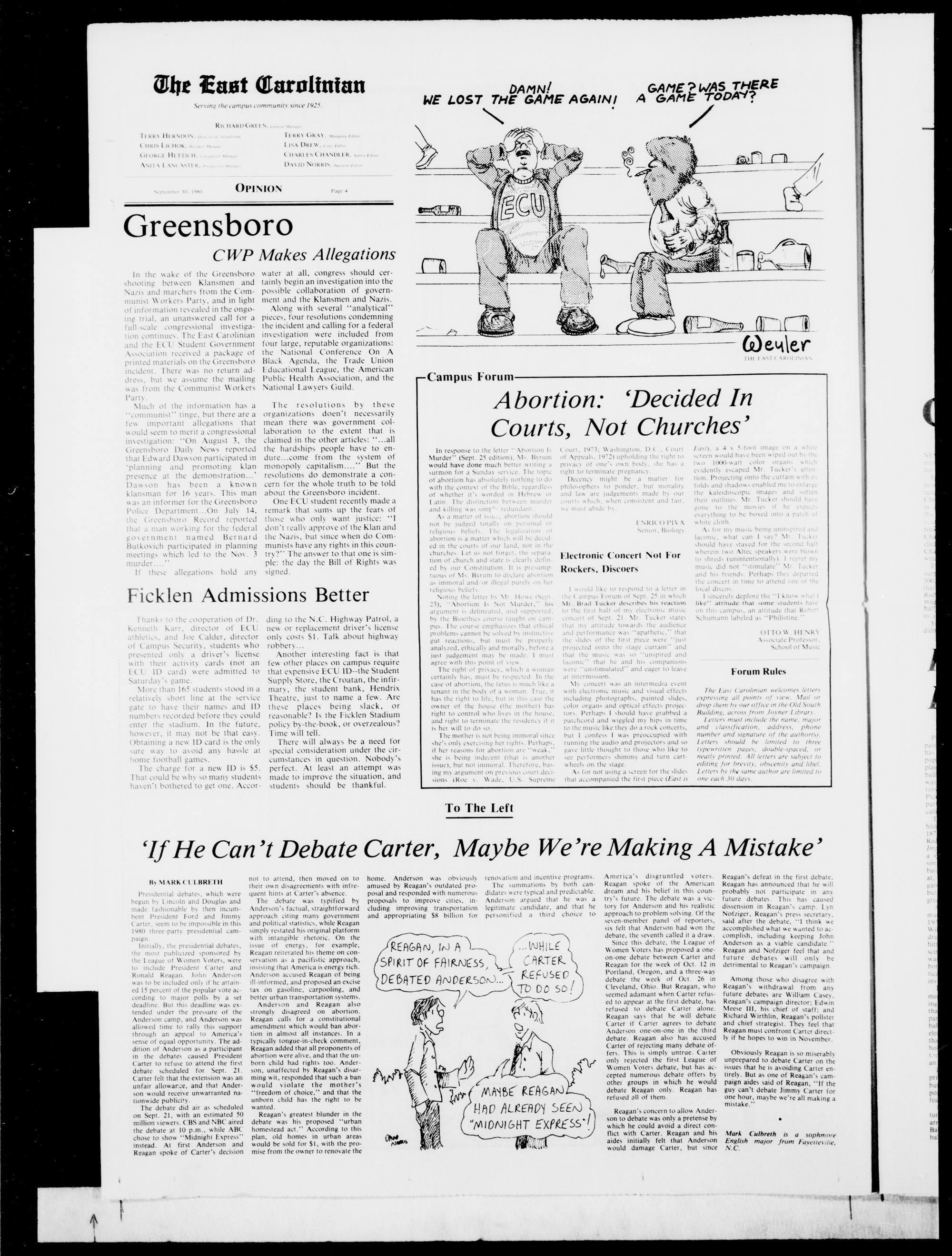 East Carolina's student-run campus newspaper was first published in 1923 as the East Carolina Teachers College News (1923-1925). It has been re-named as The Teco Echo (1925, 1926-1952), East Carolinian (1952-1969), Fountainhead (1969-1979), and The East Carolinian (1969, 1979-present). It includes local, state, national, and international stories with a focus on campus events.