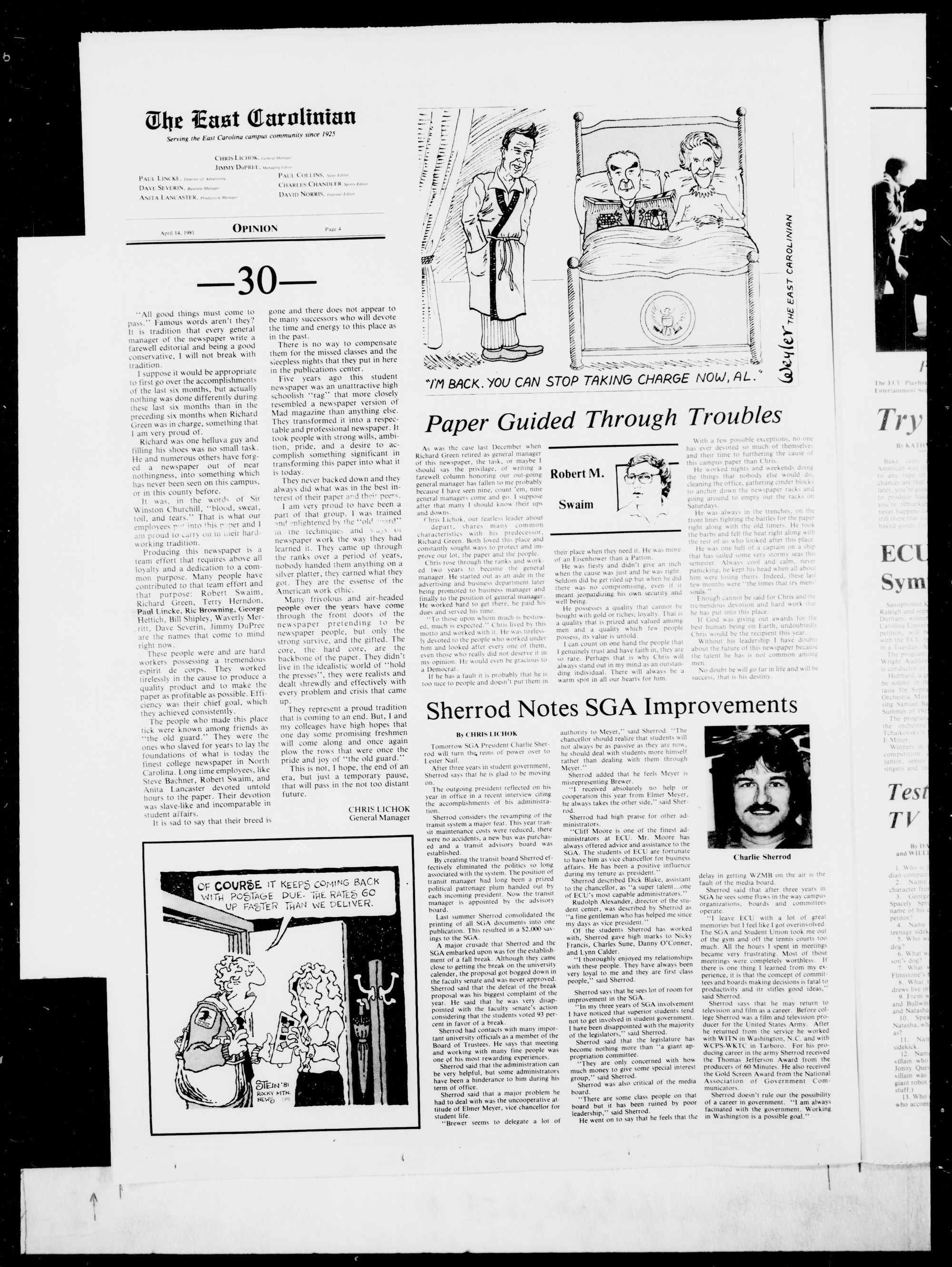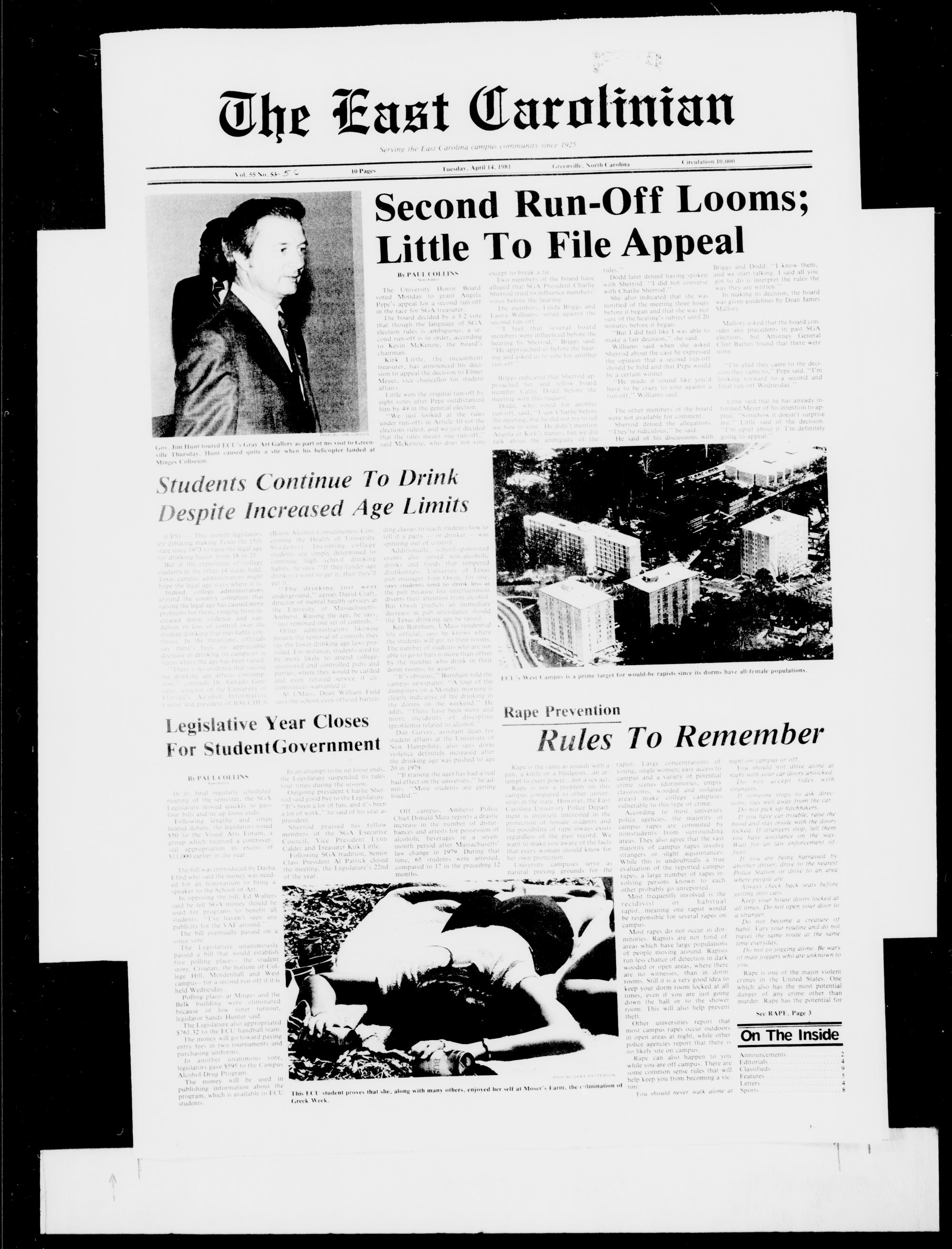 East Carolina's student-run campus newspaper was first published in 1923 as the East Carolina Teachers College News (1923-1925). It has been re-named as The Teco Echo (1925, 1926-1952), East Carolinian (1952-1969), Fountainhead (1969-1979), and The East Carolinian (1969, 1979-present). It includes local, state, national, and international stories with a focus on campus events.