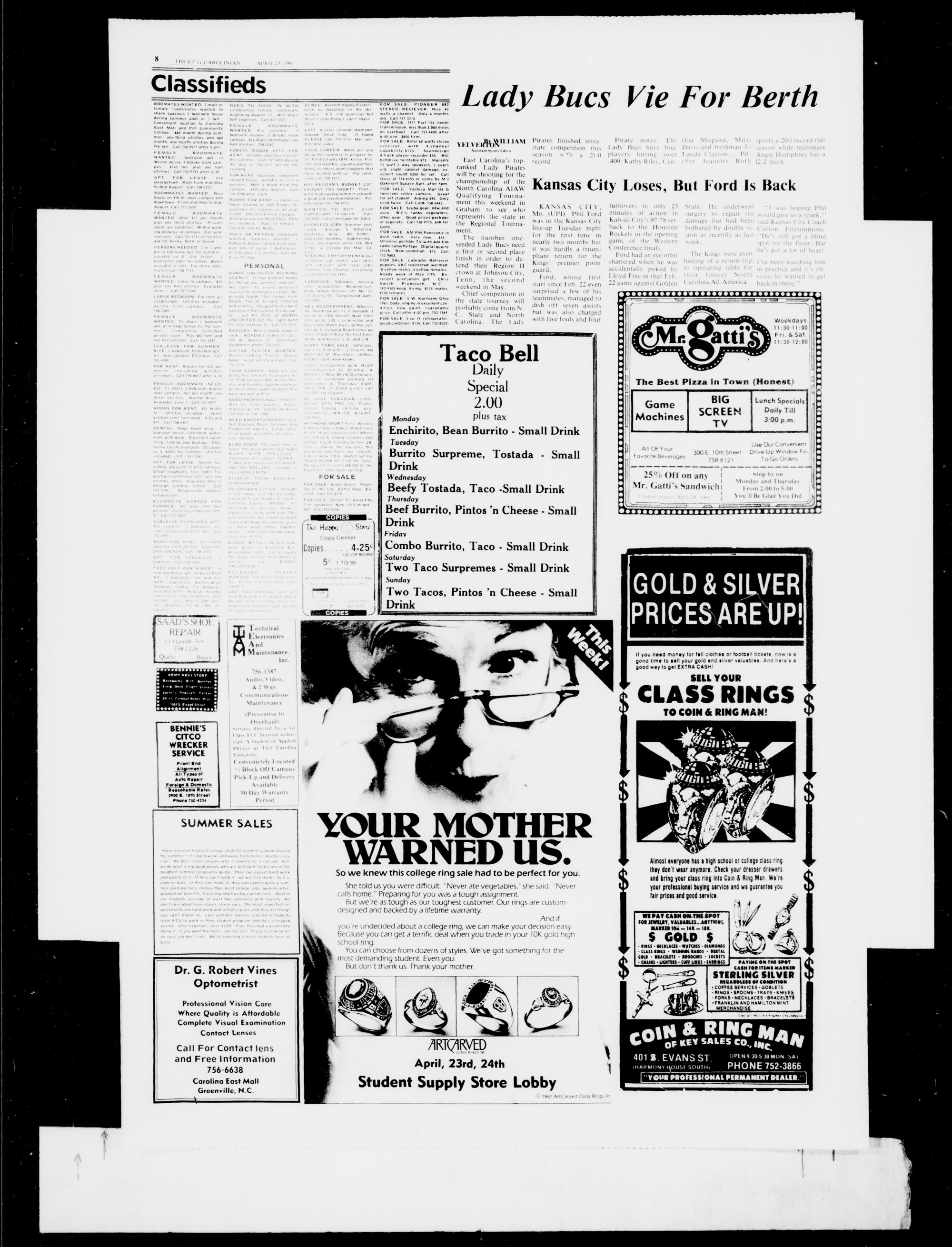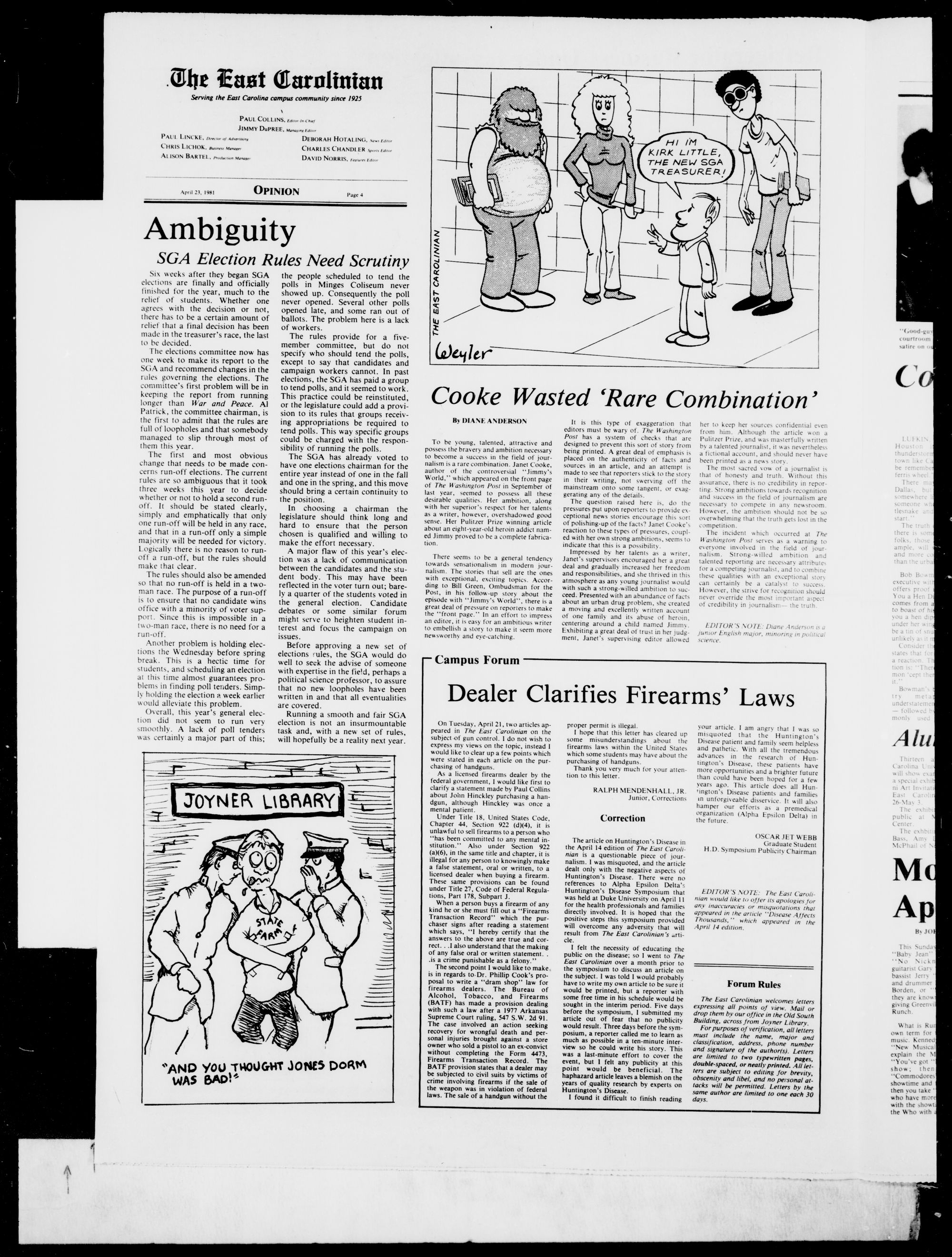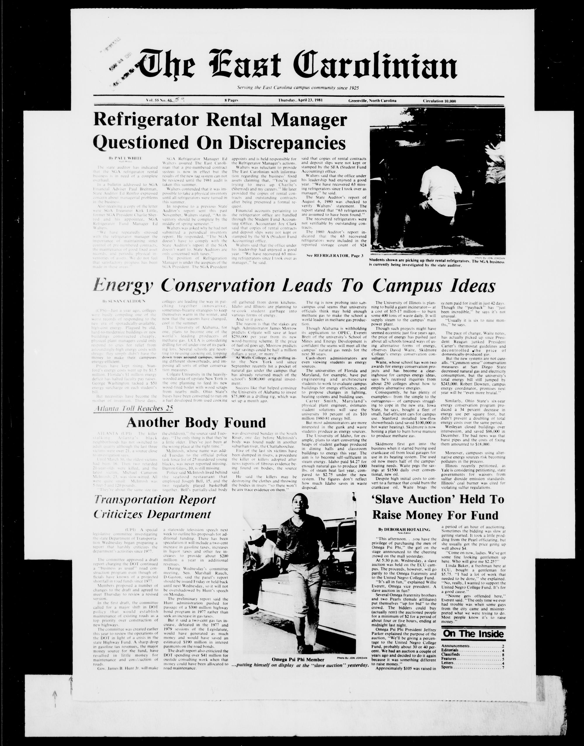 East Carolina's student-run campus newspaper was first published in 1923 as the East Carolina Teachers College News (1923-1925). It has been re-named as The Teco Echo (1925, 1926-1952), East Carolinian (1952-1969), Fountainhead (1969-1979), and The East Carolinian (1969, 1979-present). It includes local, state, national, and international stories with a focus on campus events.