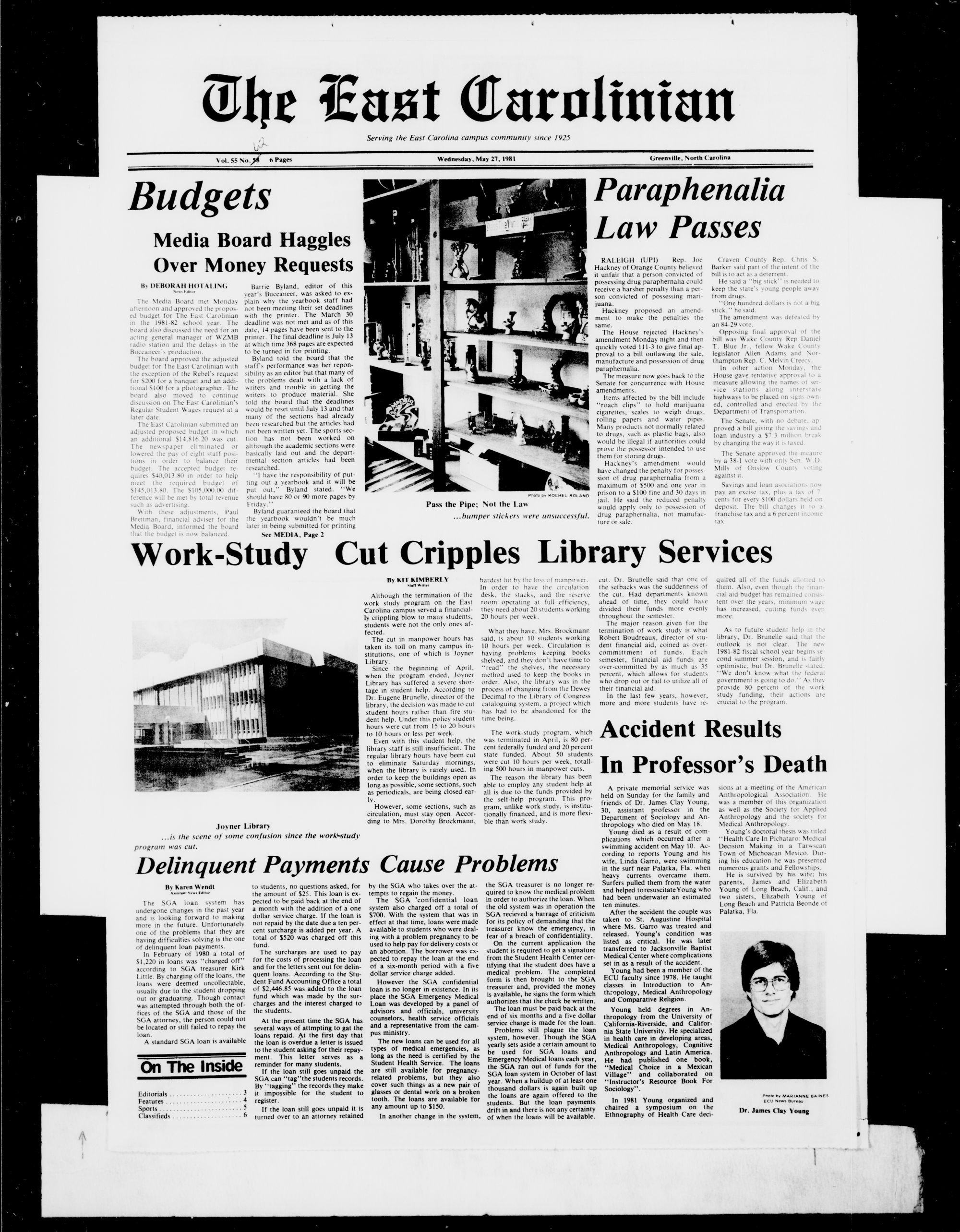 East Carolina's student-run campus newspaper was first published in 1923 as the East Carolina Teachers College News (1923-1925). It has been re-named as The Teco Echo (1925, 1926-1952), East Carolinian (1952-1969), Fountainhead (1969-1979), and The East Carolinian (1969, 1979-present). It includes local, state, national, and international stories with a focus on campus events.
