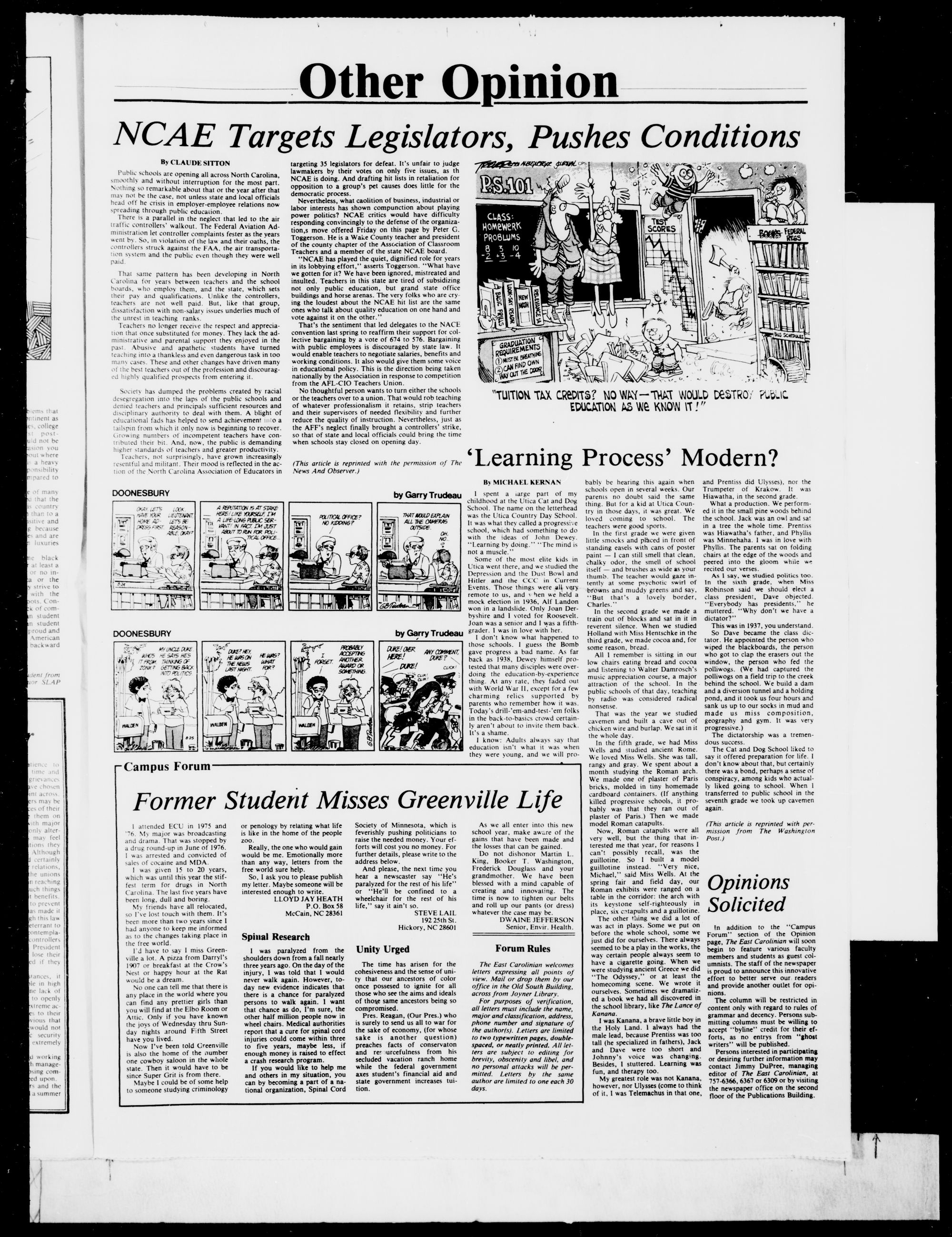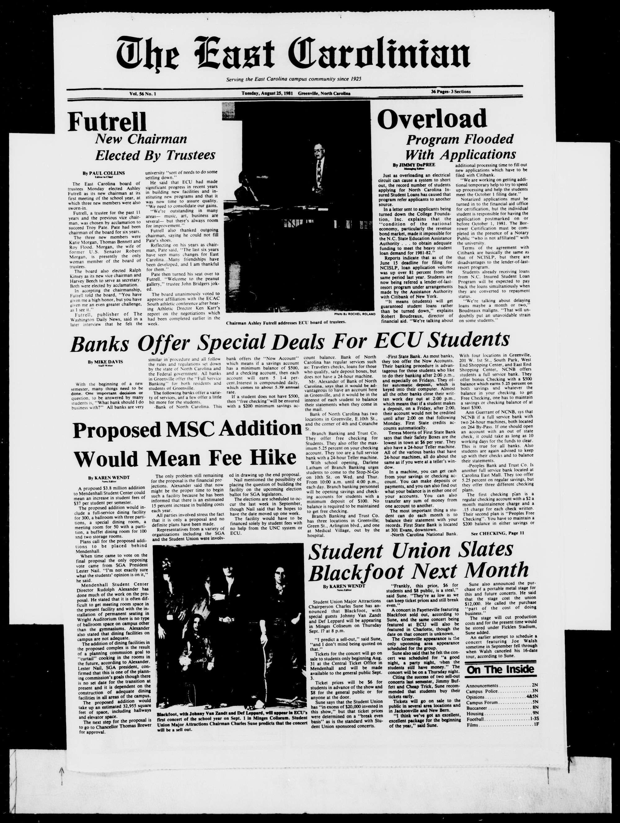 East Carolina's student-run campus newspaper was first published in 1923 as the East Carolina Teachers College News (1923-1925). It has been re-named as The Teco Echo (1925, 1926-1952), East Carolinian (1952-1969), Fountainhead (1969-1979), and The East Carolinian (1969, 1979-present). It includes local, state, national, and international stories with a focus on campus events.