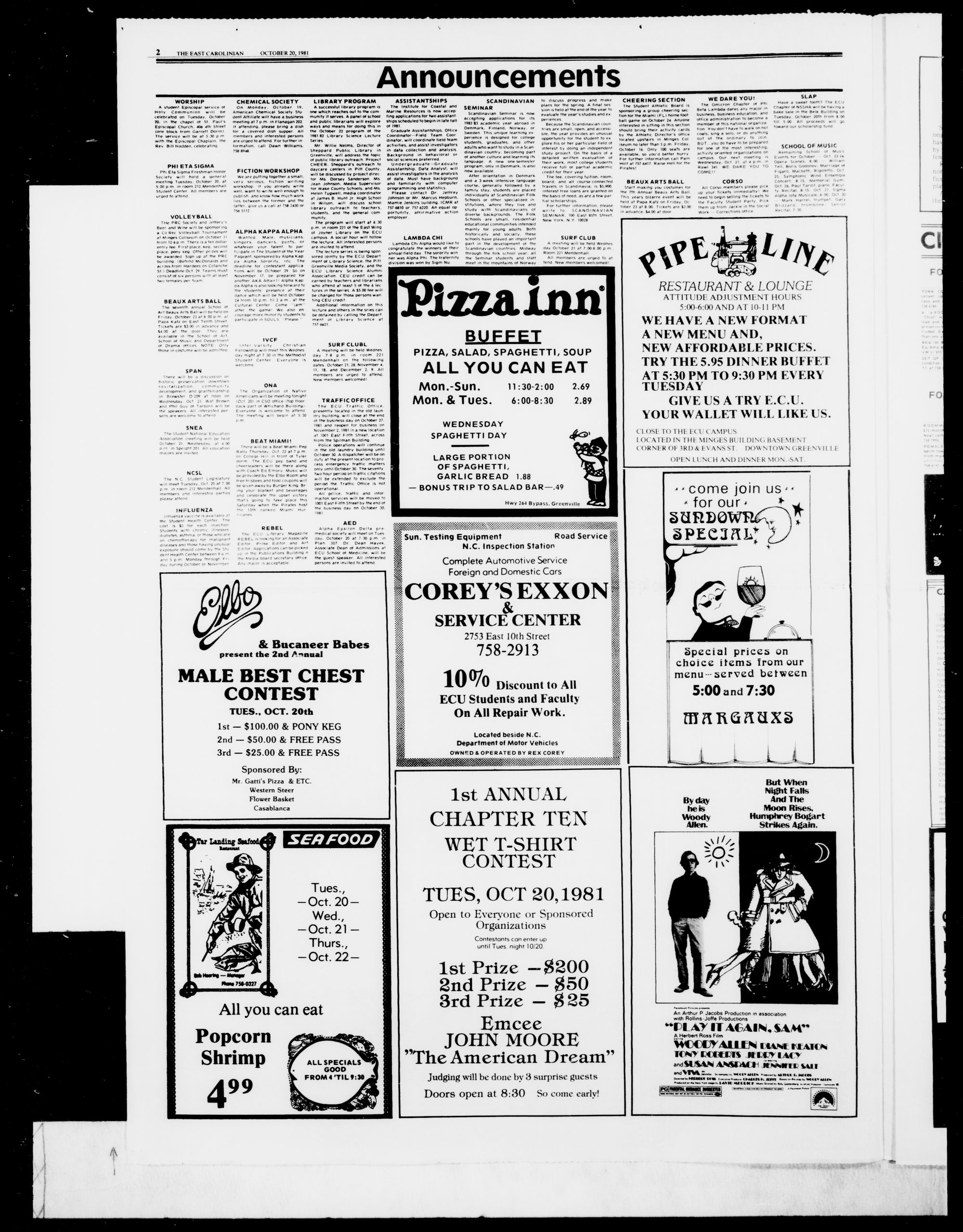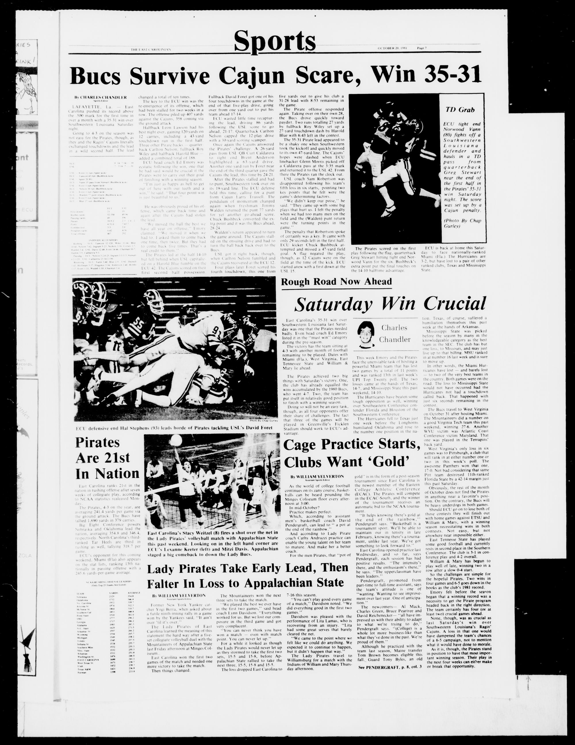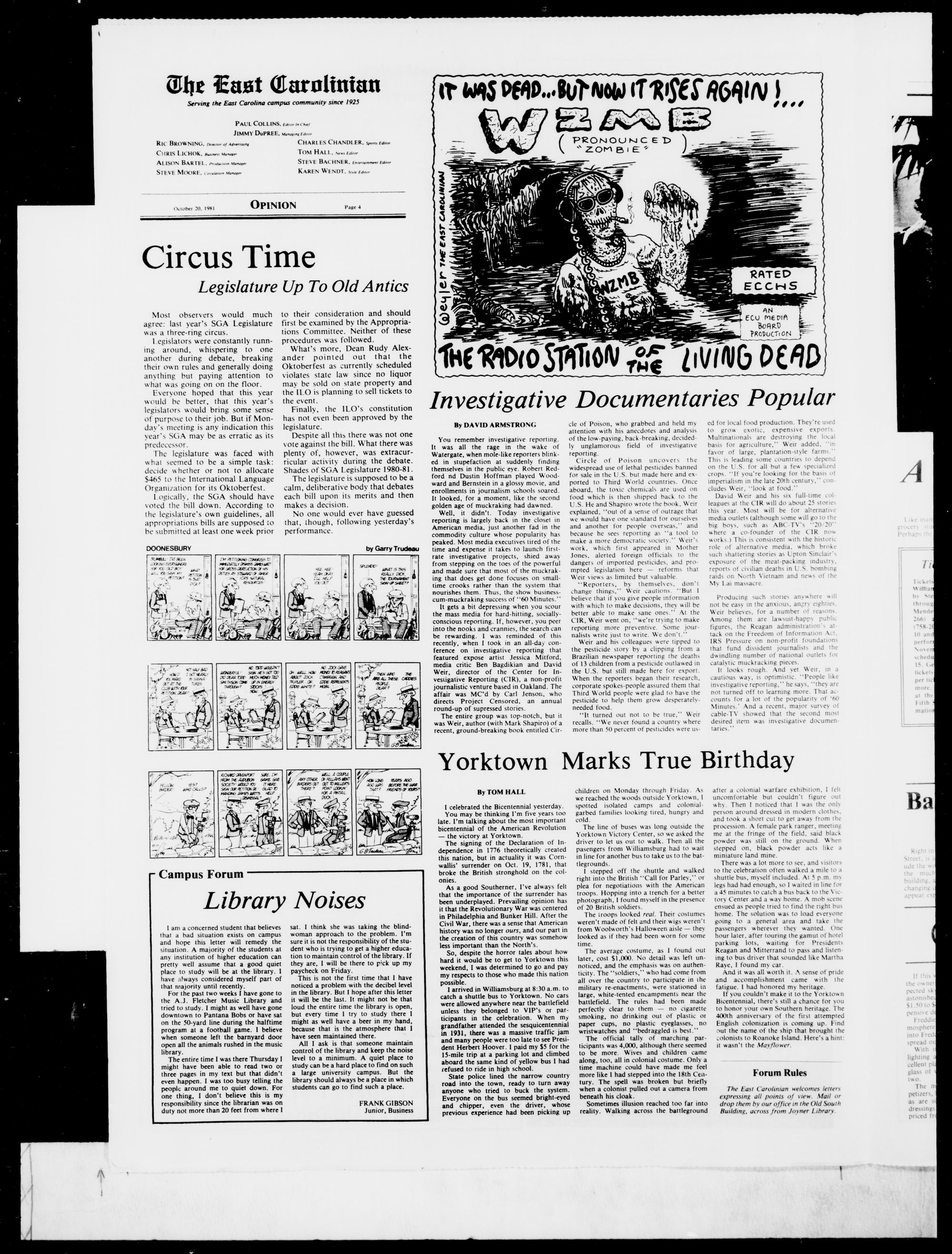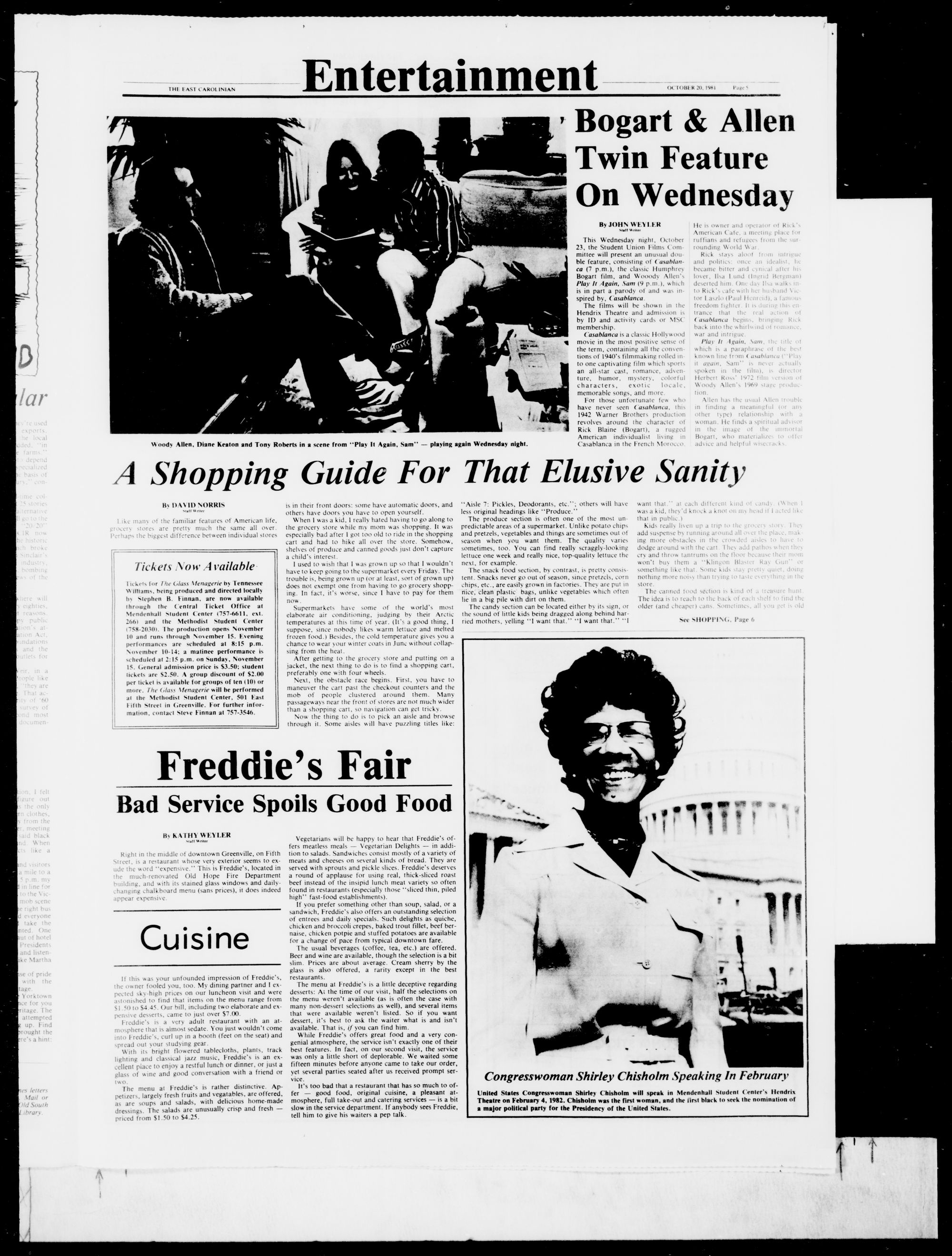 East Carolina's student-run campus newspaper was first published in 1923 as the East Carolina Teachers College News (1923-1925). It has been re-named as The Teco Echo (1925, 1926-1952), East Carolinian (1952-1969), Fountainhead (1969-1979), and The East Carolinian (1969, 1979-present). It includes local, state, national, and international stories with a focus on campus events.