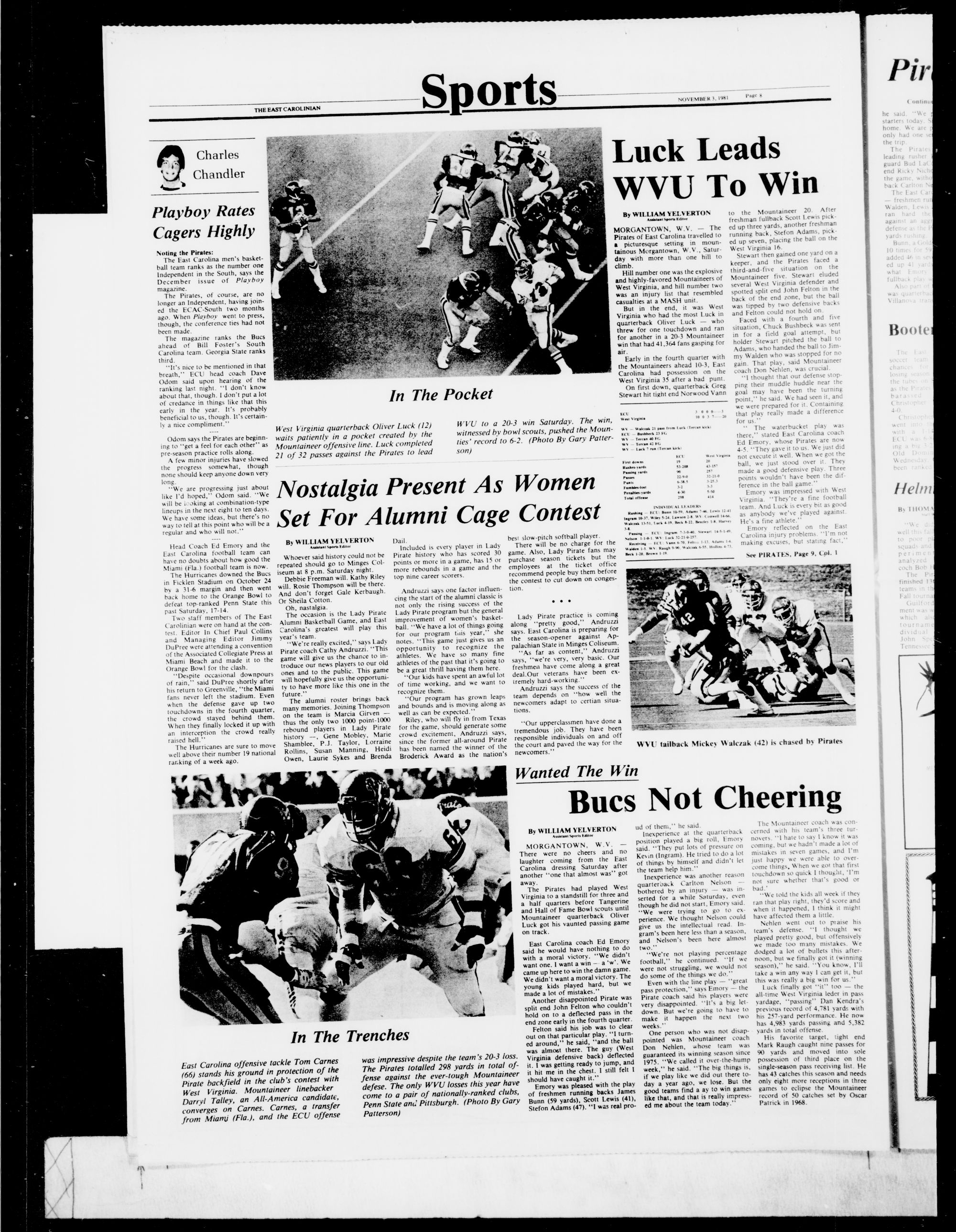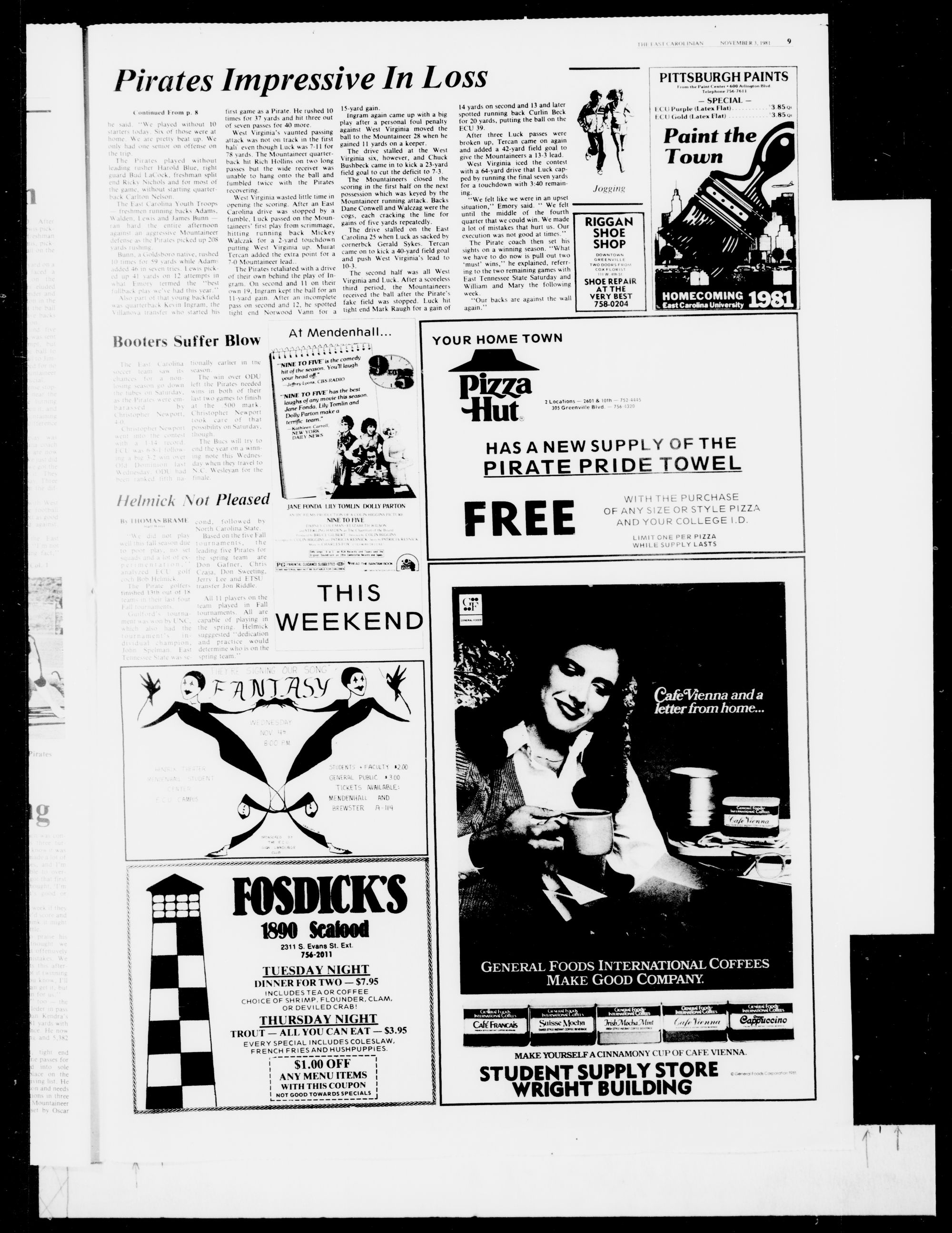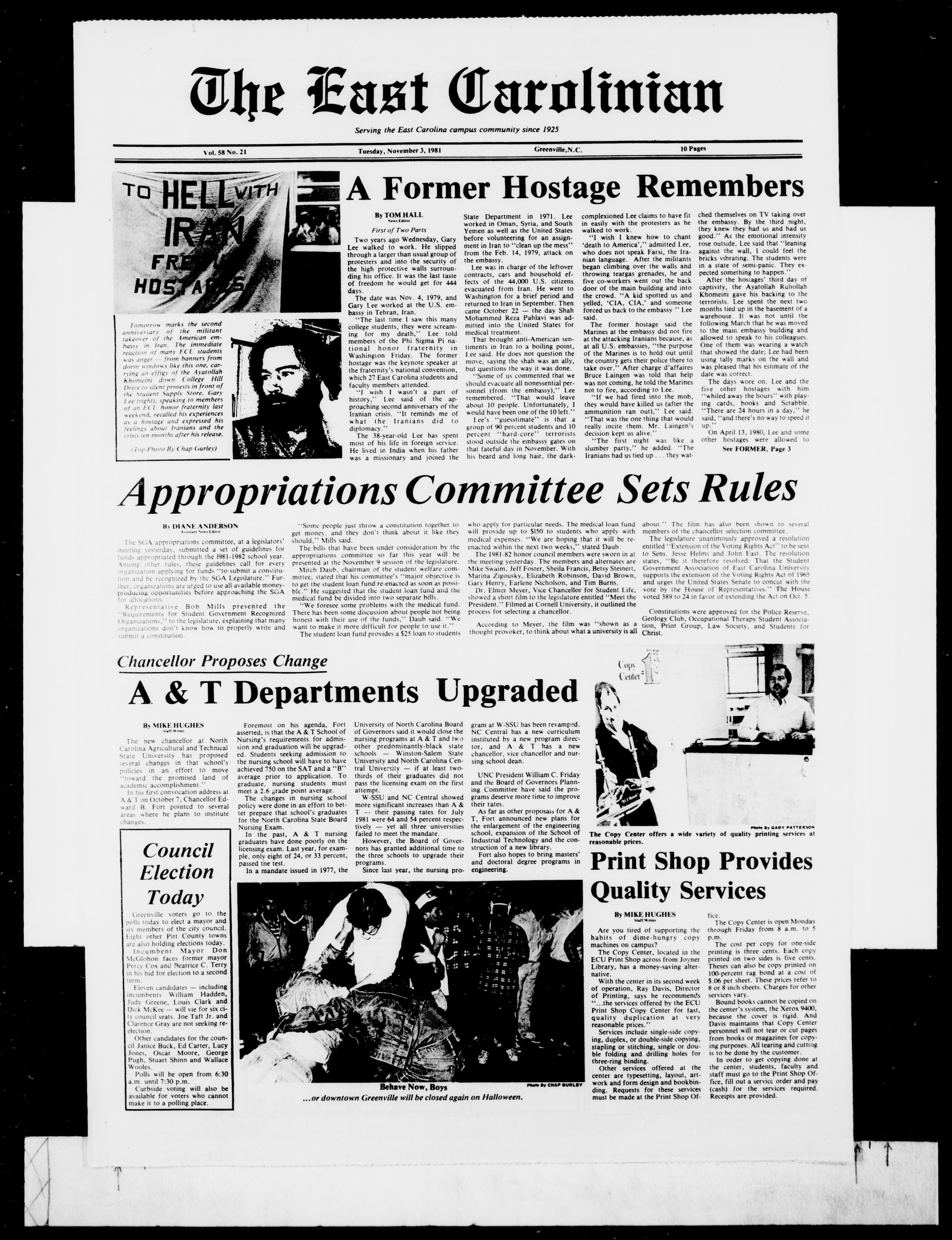 East Carolina's student-run campus newspaper was first published in 1923 as the East Carolina Teachers College News (1923-1925). It has been re-named as The Teco Echo (1925, 1926-1952), East Carolinian (1952-1969), Fountainhead (1969-1979), and The East Carolinian (1969, 1979-present). It includes local, state, national, and international stories with a focus on campus events.