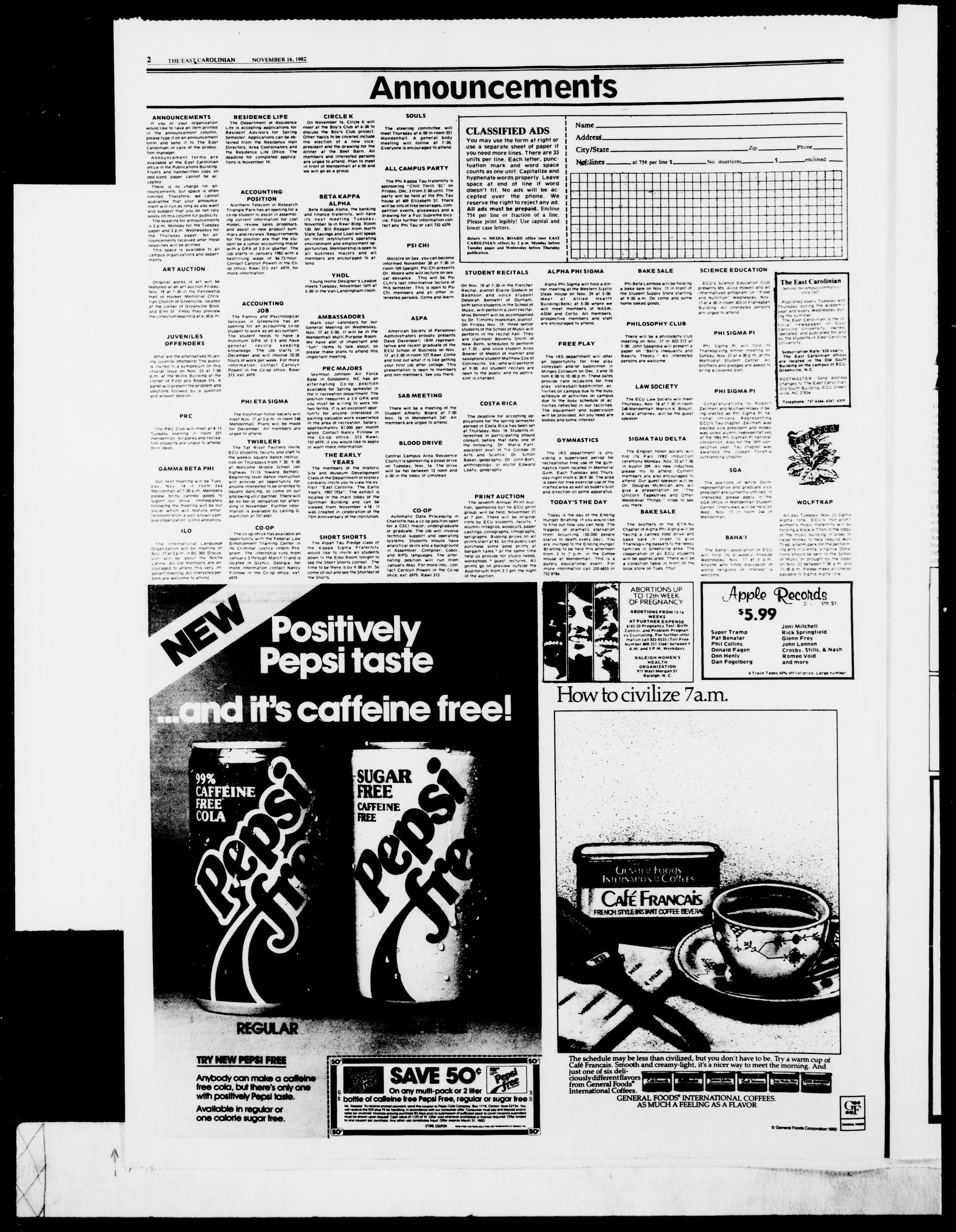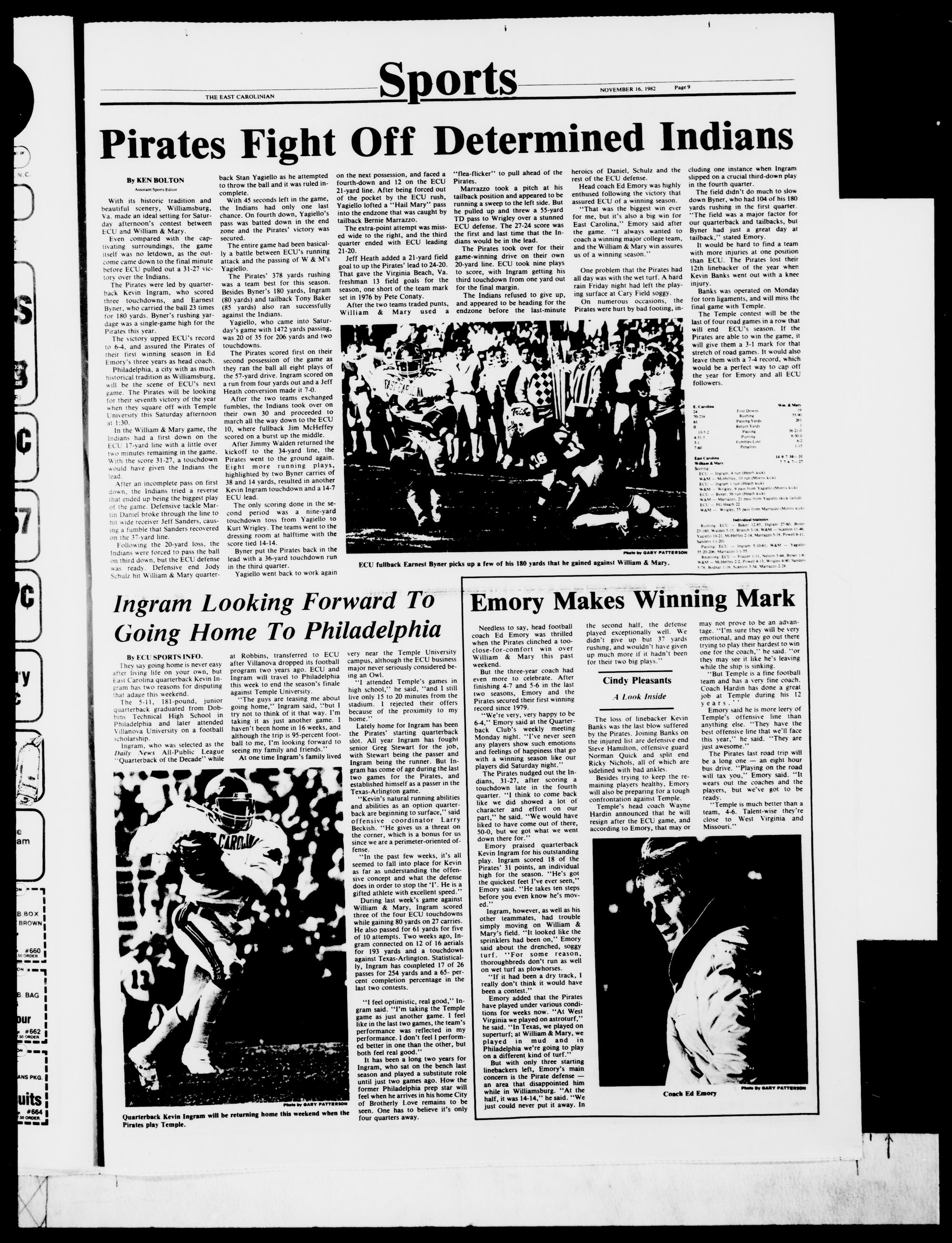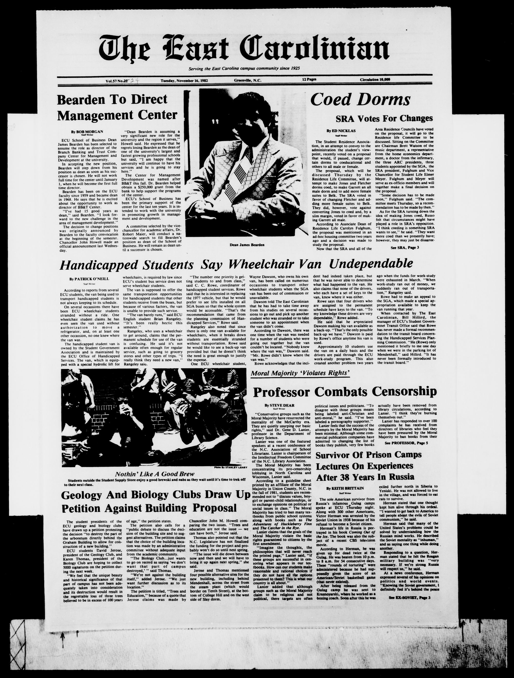 East Carolina's student-run campus newspaper was first published in 1923 as the East Carolina Teachers College News (1923-1925). It has been re-named as The Teco Echo (1925, 1926-1952), East Carolinian (1952-1969), Fountainhead (1969-1979), and The East Carolinian (1969, 1979-present). It includes local, state, national, and international stories with a focus on campus events.