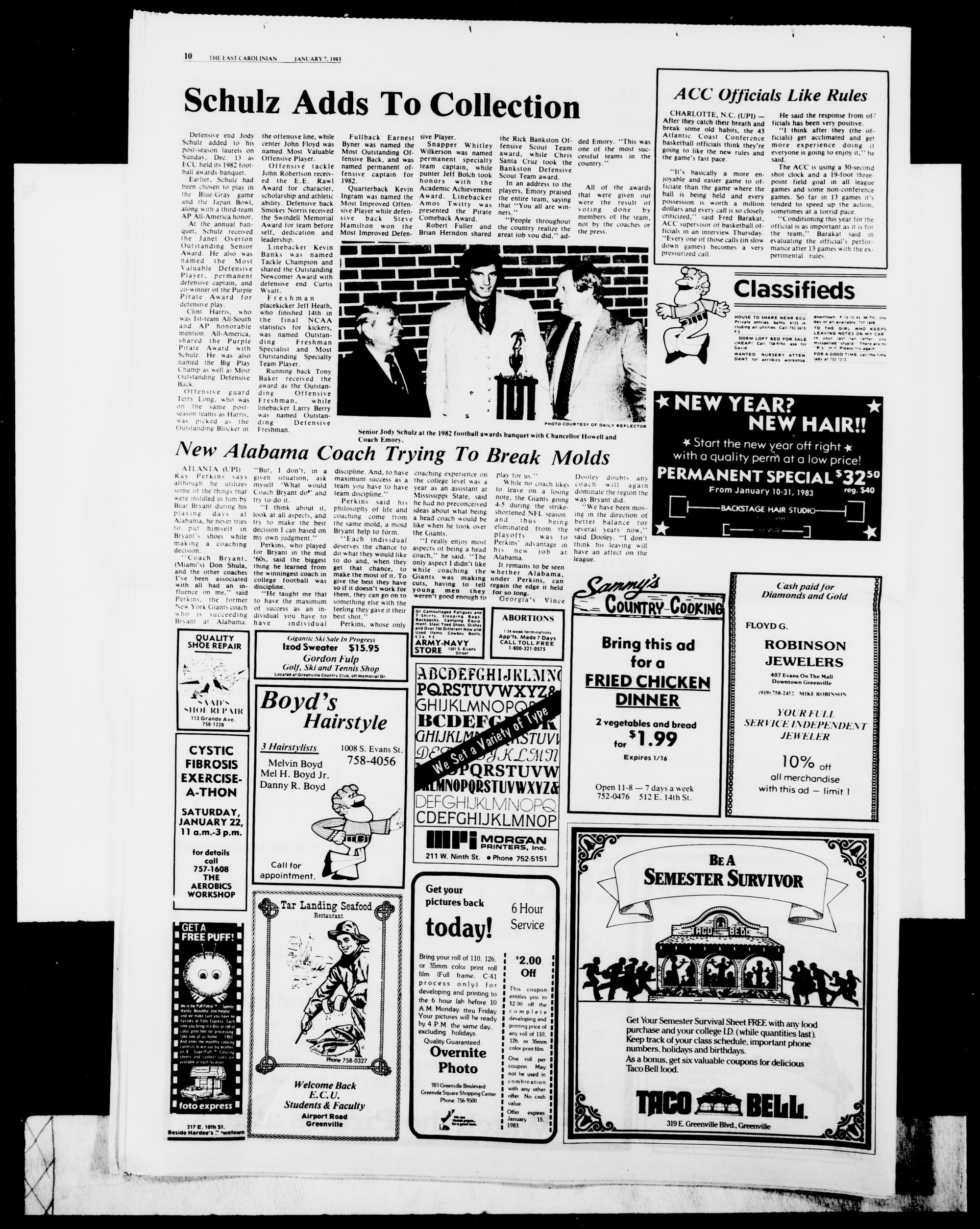 Senior Jody Schulz at the 1982 football awards banquet with Chancellor Howell and