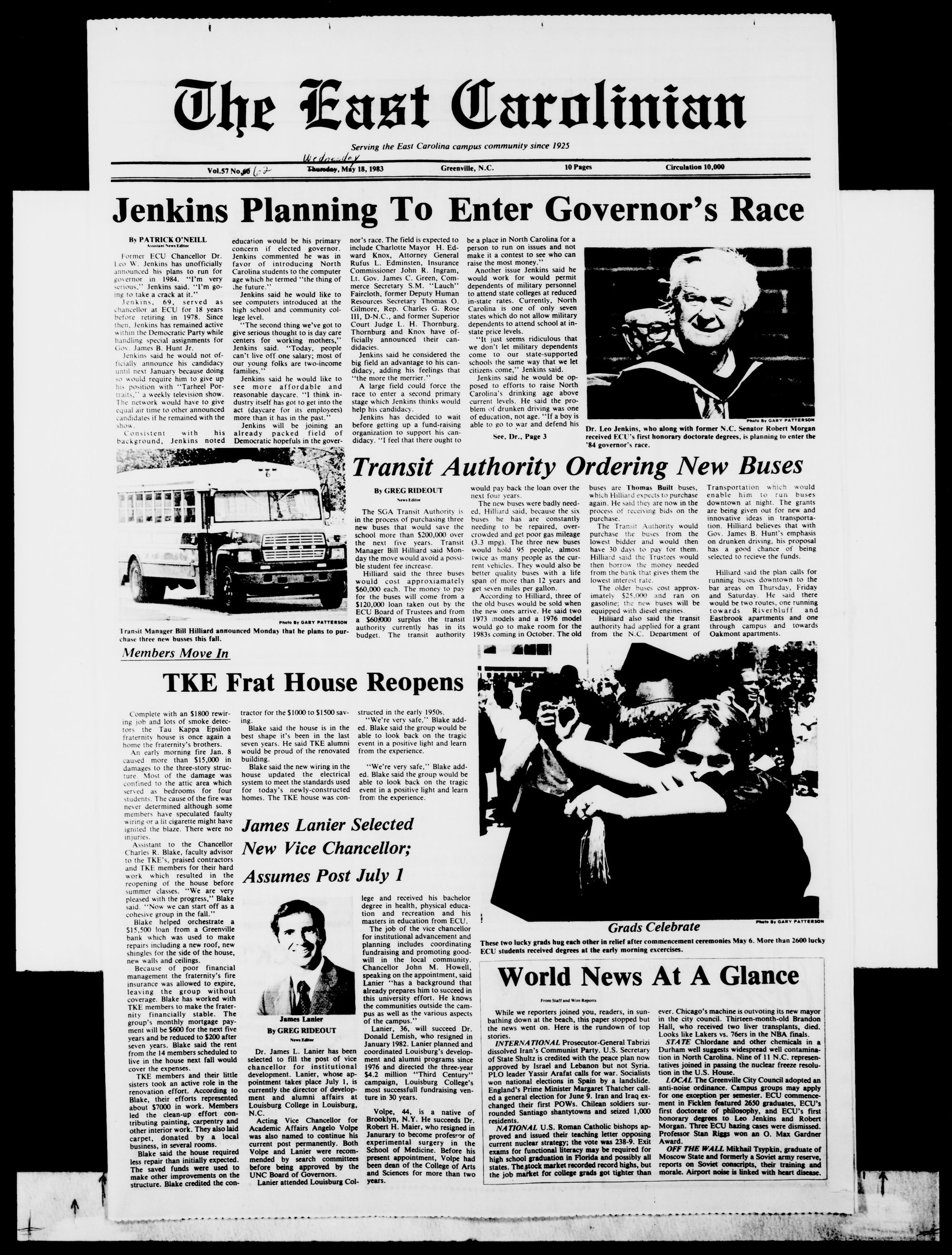 East Carolina's student-run campus newspaper was first published in 1923 as the East Carolina Teachers College News (1923-1925). It has been re-named as The Teco Echo (1925, 1926-1952), East Carolinian (1952-1969), Fountainhead (1969-1979), and The East Carolinian (1969, 1979-present). It includes local, state, national, and international stories with a focus on campus events.