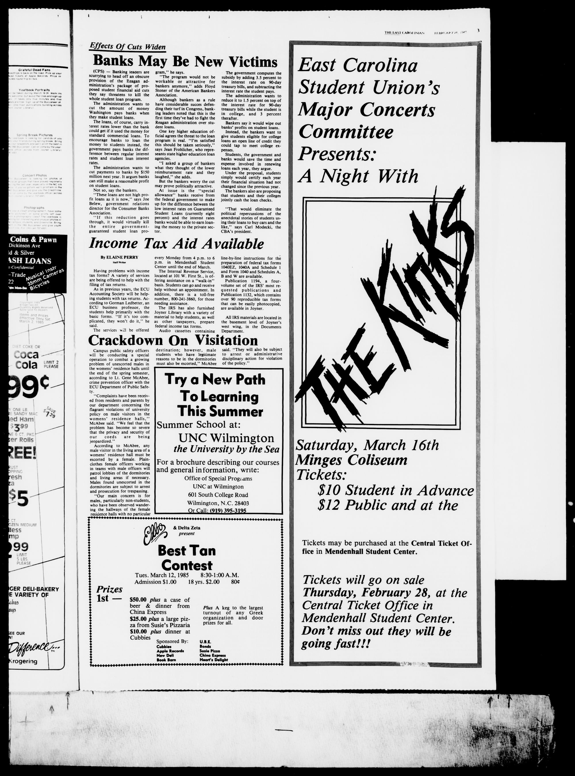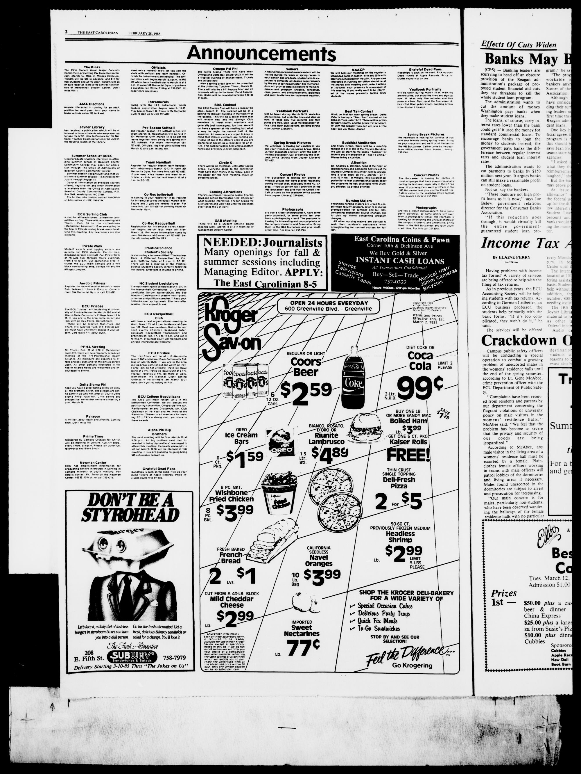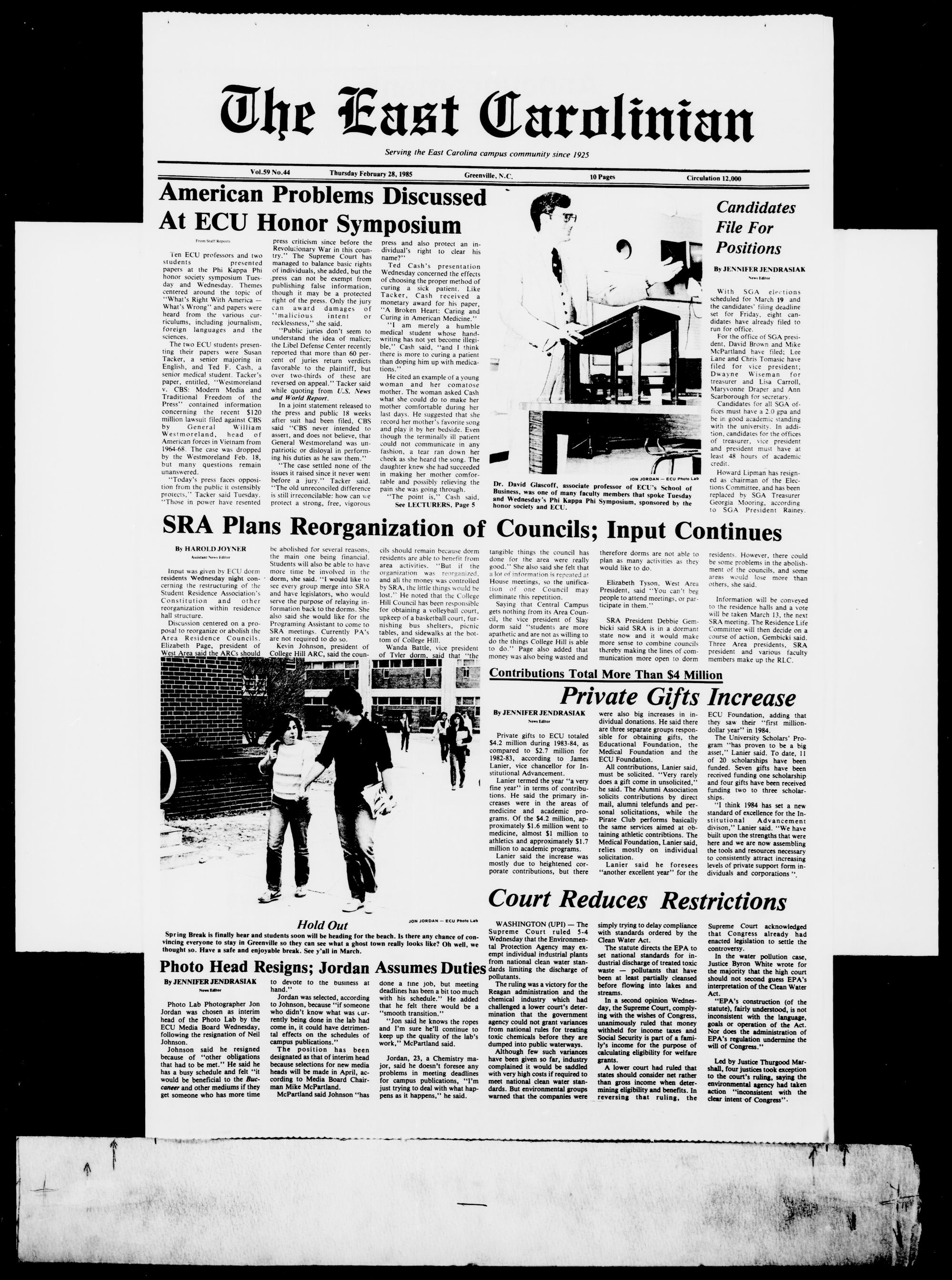East Carolina's student-run campus newspaper was first published in 1923 as the East Carolina Teachers College News (1923-1925). It has been re-named as The Teco Echo (1925, 1926-1952), East Carolinian (1952-1969), Fountainhead (1969-1979), and The East Carolinian (1969, 1979-present). It includes local, state, national, and international stories with a focus on campus events.