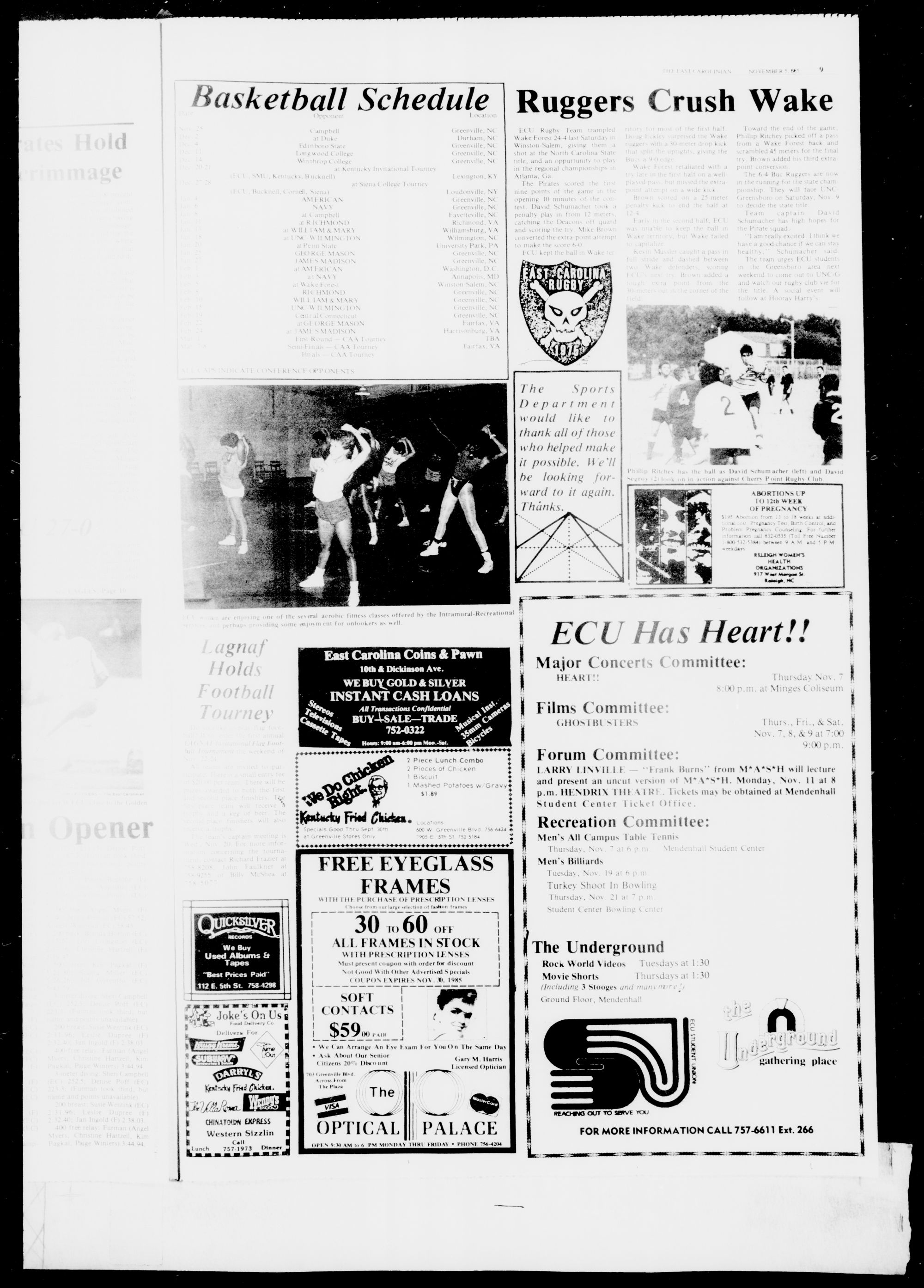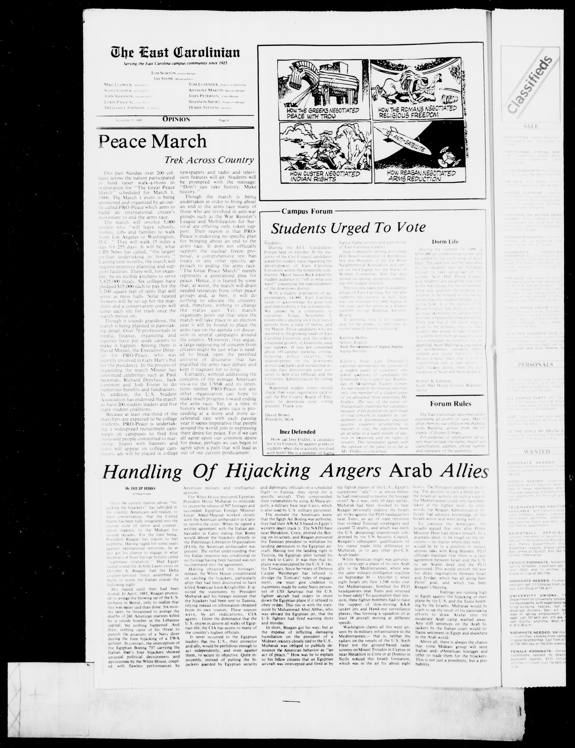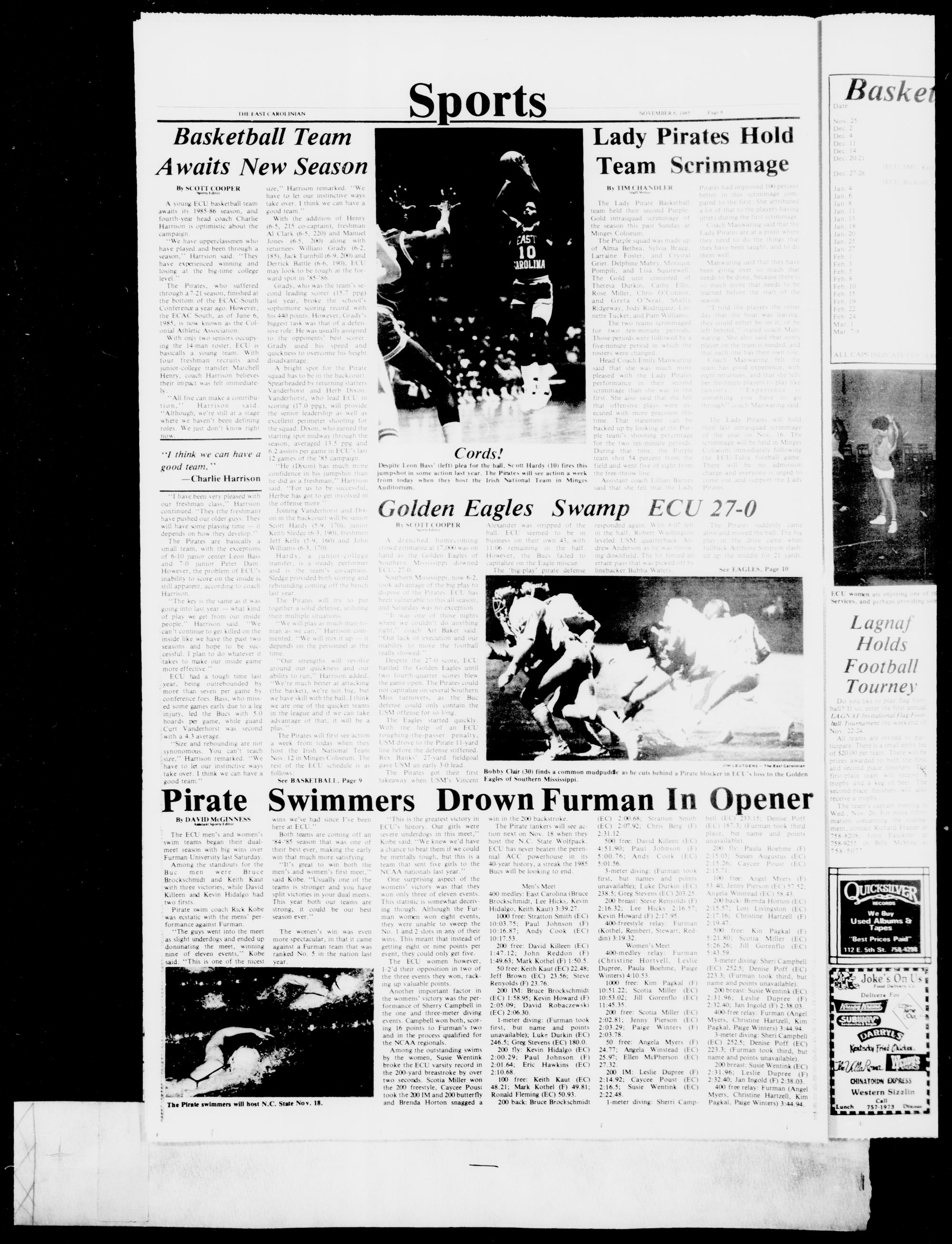 East Carolina's student-run campus newspaper was first published in 1923 as the East Carolina Teachers College News (1923-1925). It has been re-named as The Teco Echo (1925, 1926-1952), East Carolinian (1952-1969), Fountainhead (1969-1979), and The East Carolinian (1969, 1979-present). It includes local, state, national, and international stories with a focus on campus events.