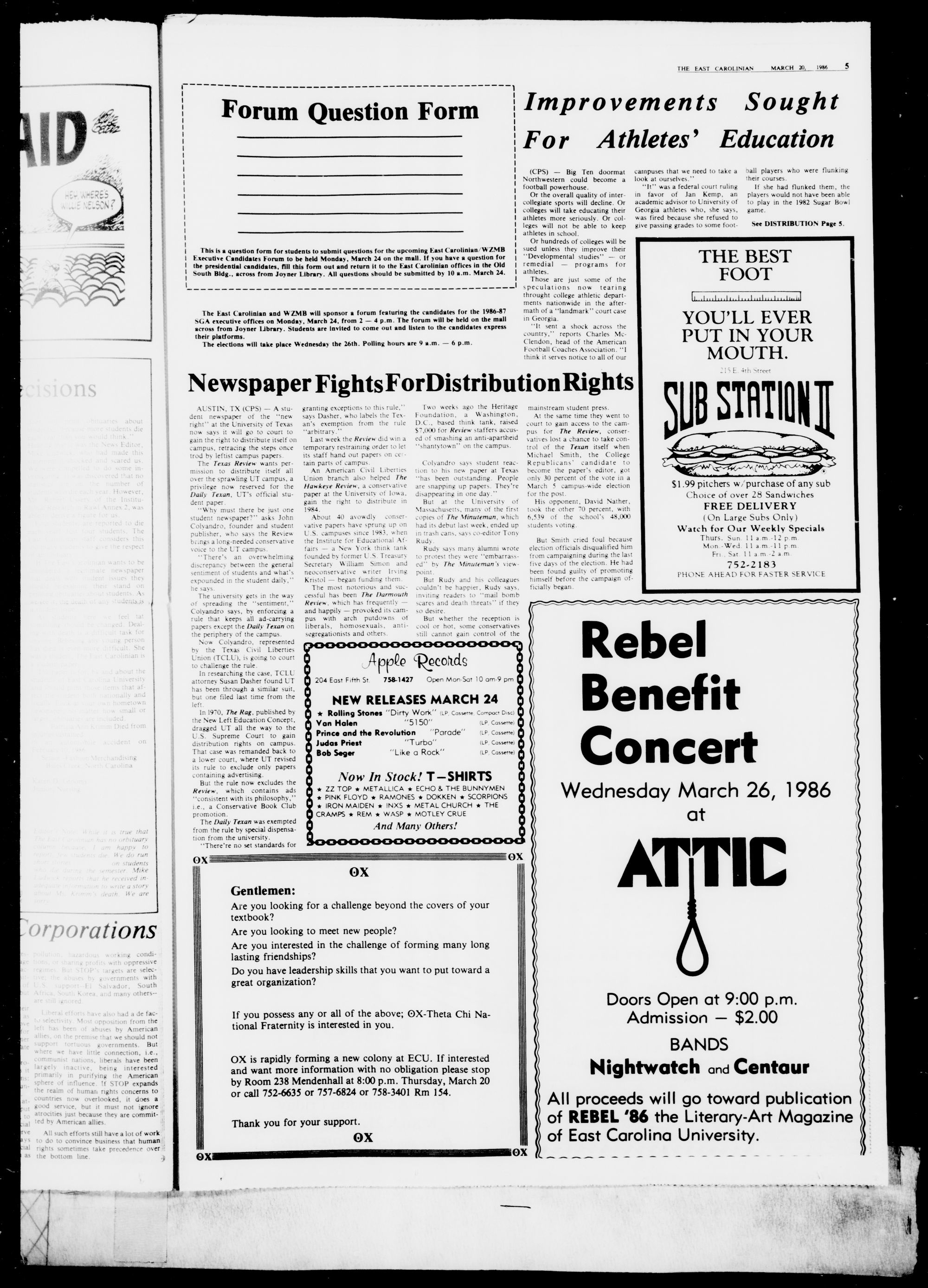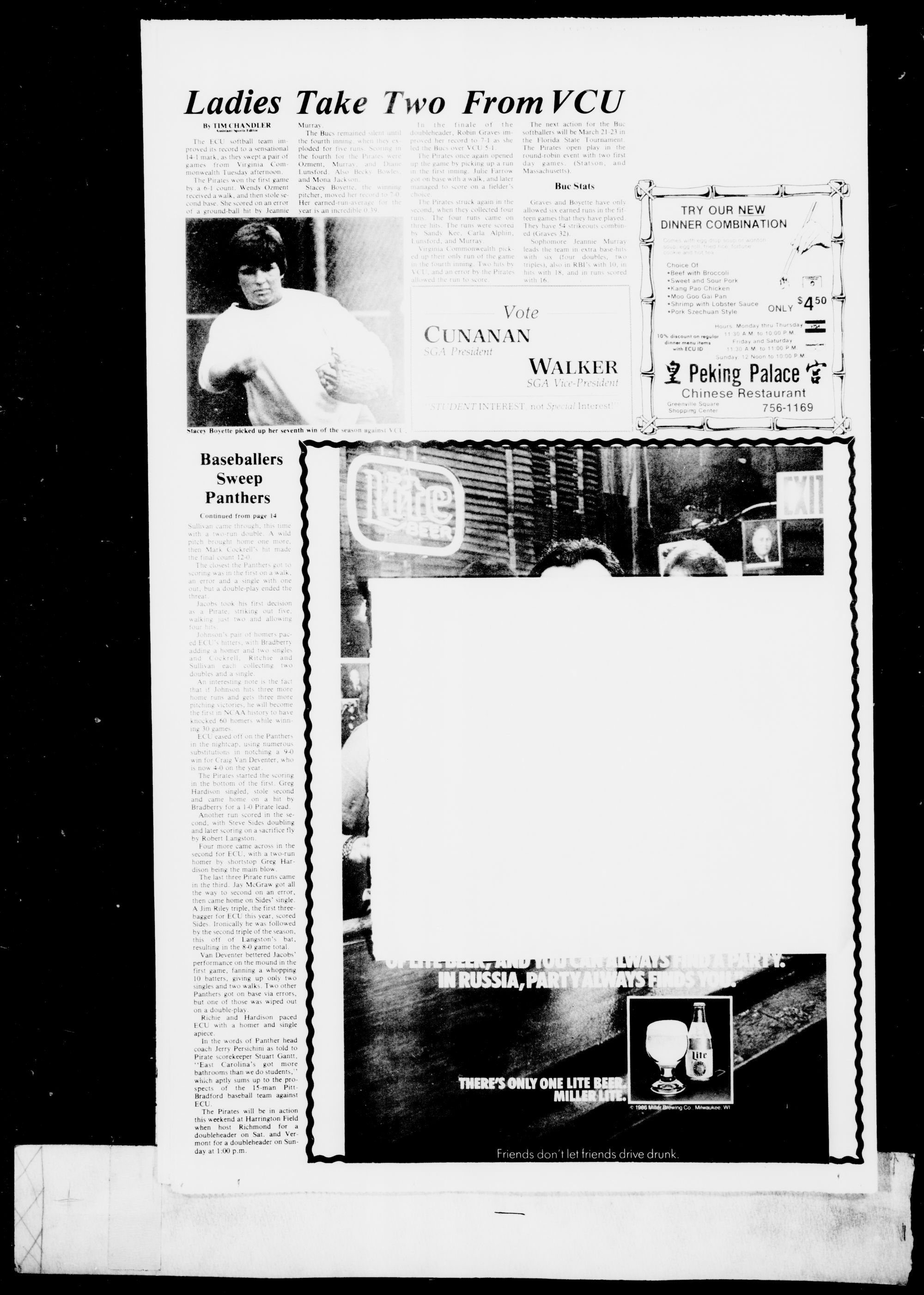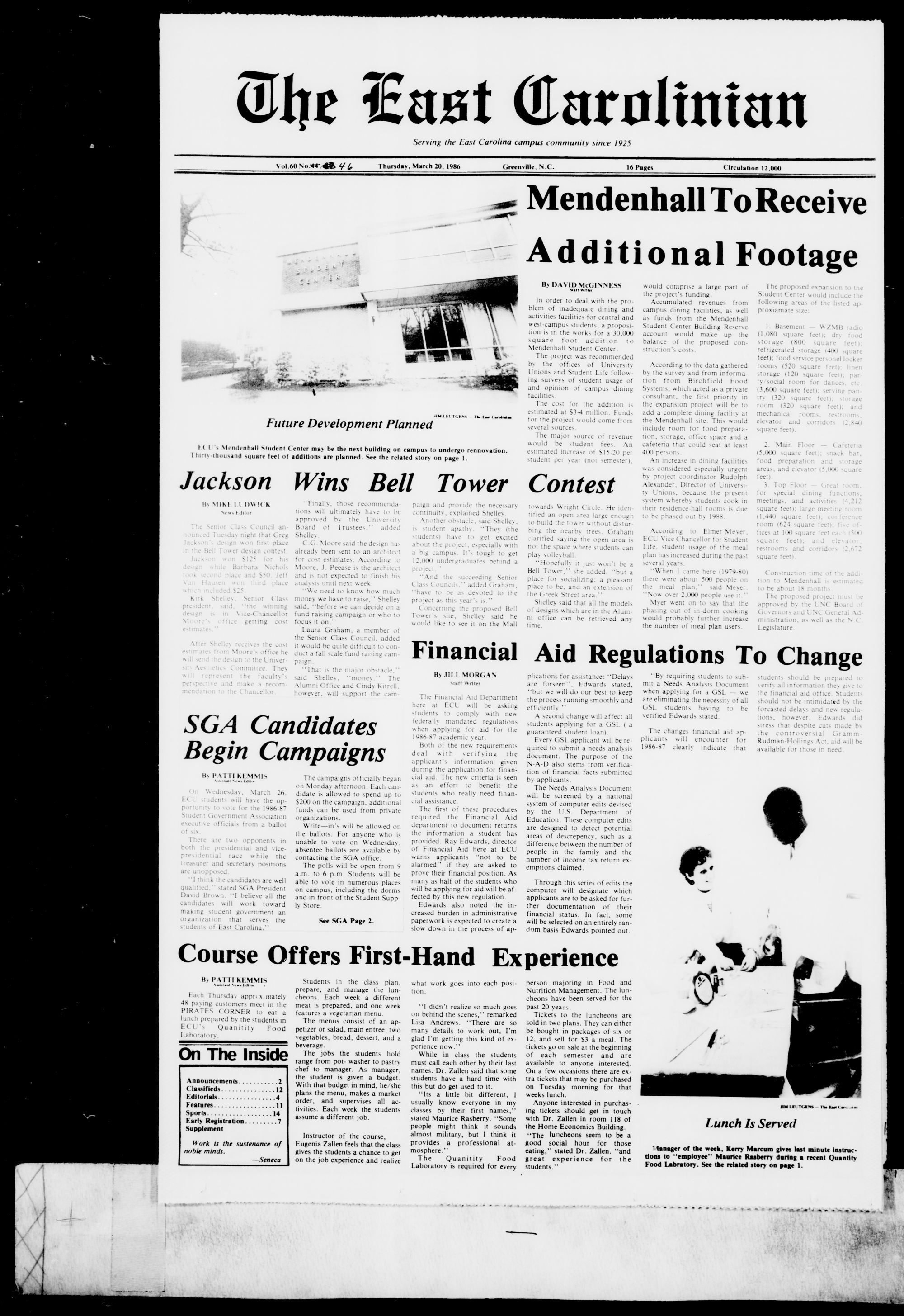 East Carolina's student-run campus newspaper was first published in 1923 as the East Carolina Teachers College News (1923-1925). It has been re-named as The Teco Echo (1925, 1926-1952), East Carolinian (1952-1969), Fountainhead (1969-1979), and The East Carolinian (1969, 1979-present). It includes local, state, national, and international stories with a focus on campus events.