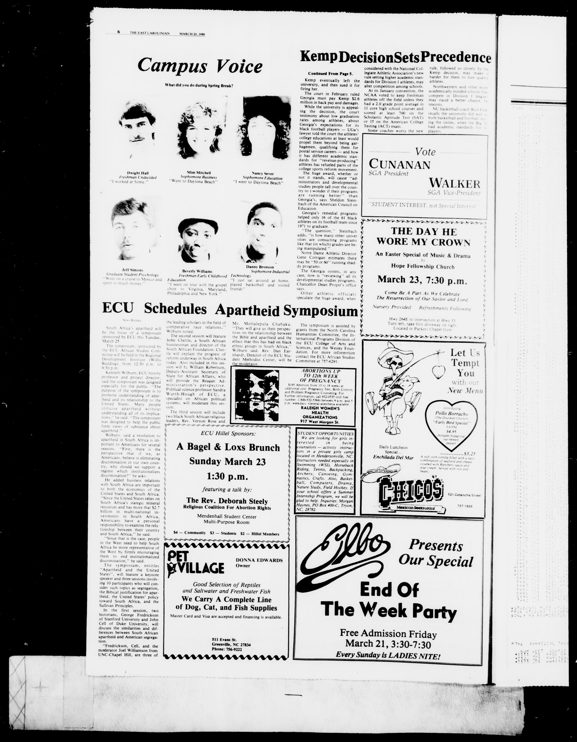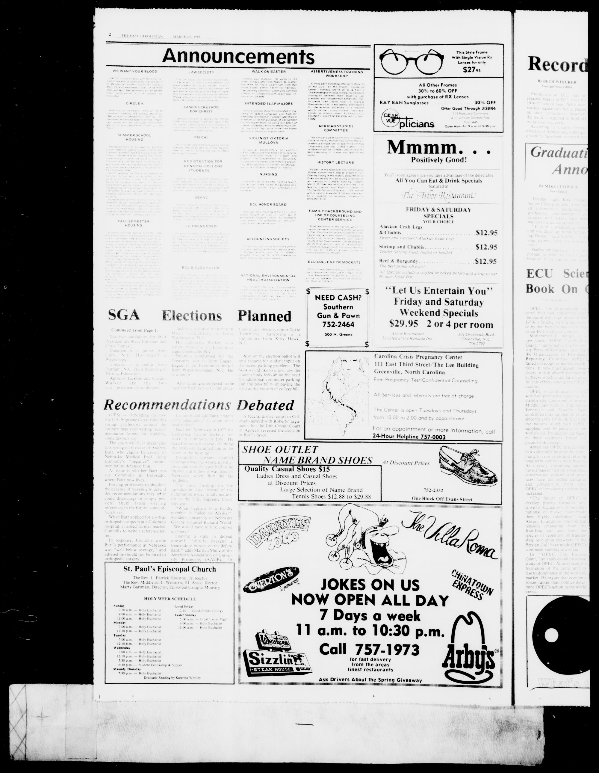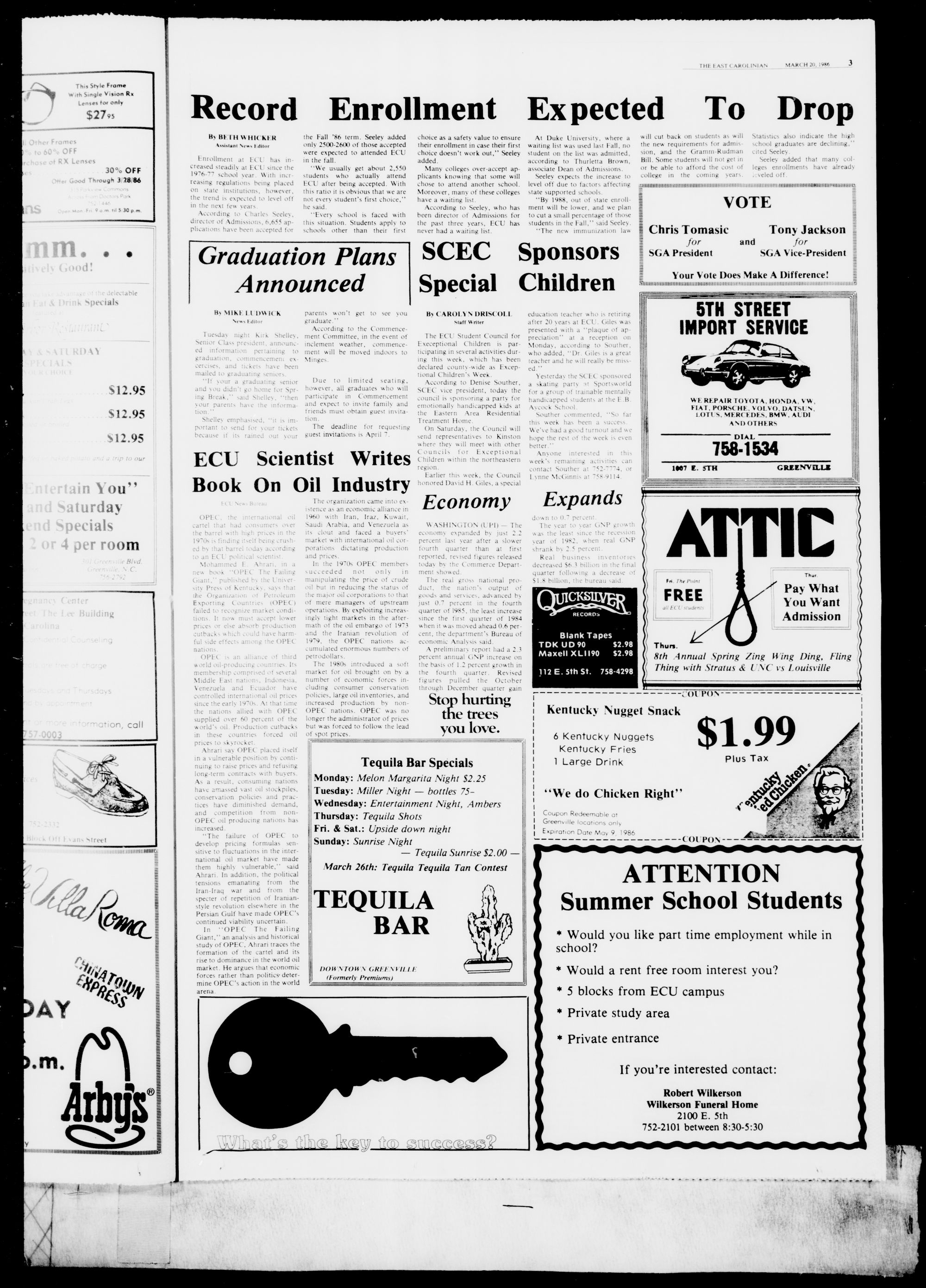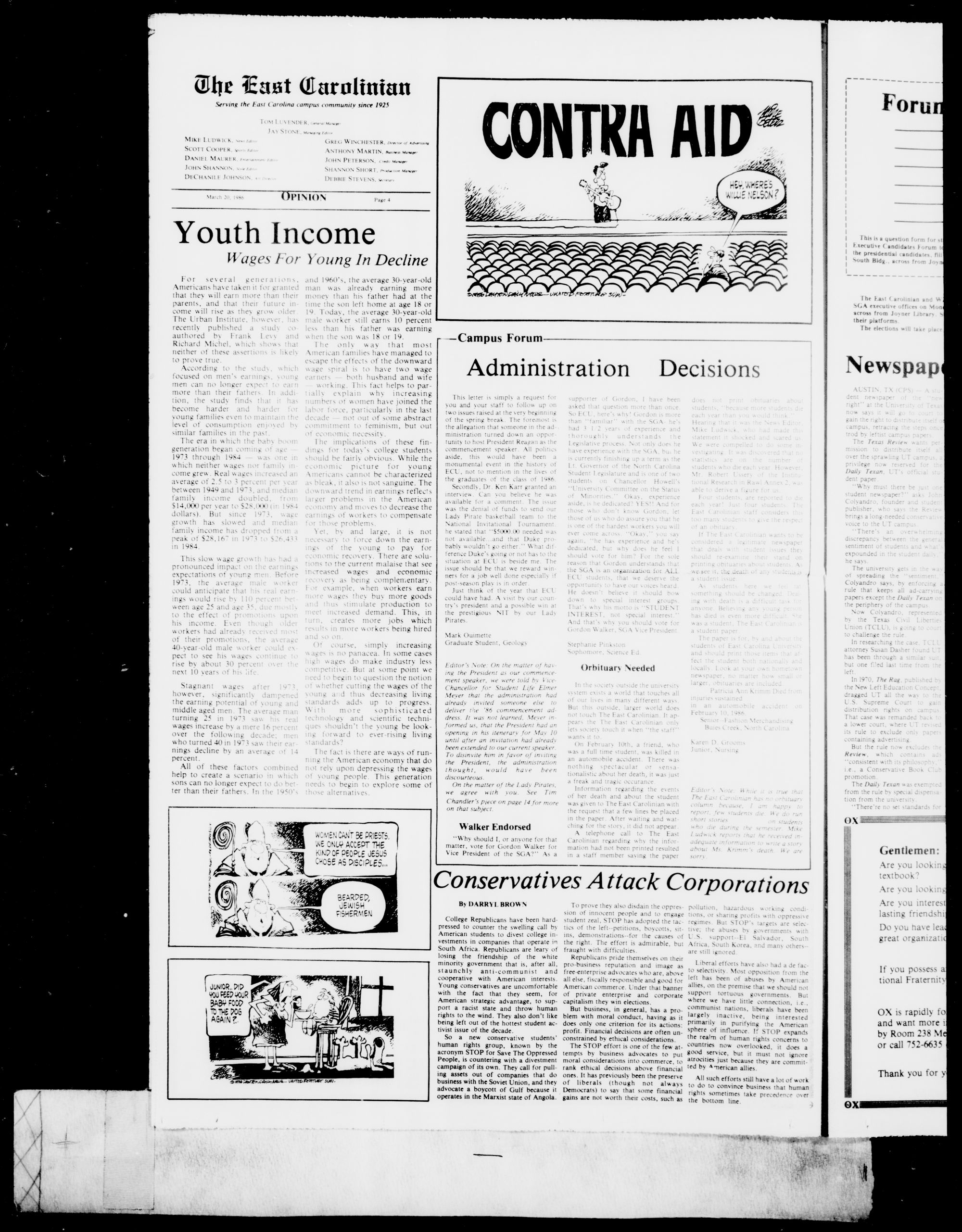 East Carolina's student-run campus newspaper was first published in 1923 as the East Carolina Teachers College News (1923-1925). It has been re-named as The Teco Echo (1925, 1926-1952), East Carolinian (1952-1969), Fountainhead (1969-1979), and The East Carolinian (1969, 1979-present). It includes local, state, national, and international stories with a focus on campus events.