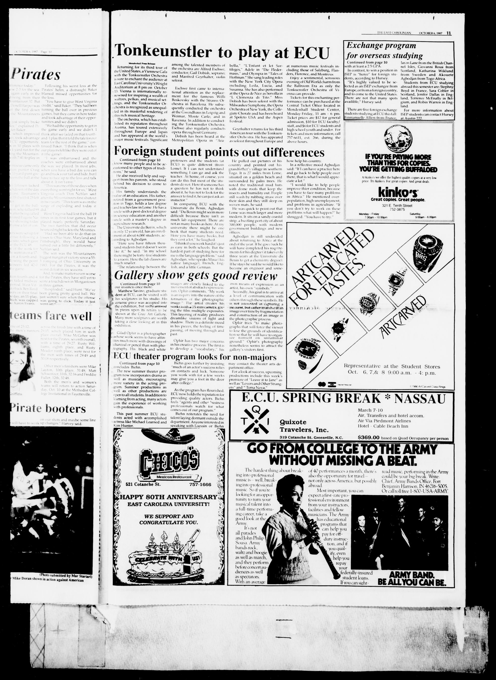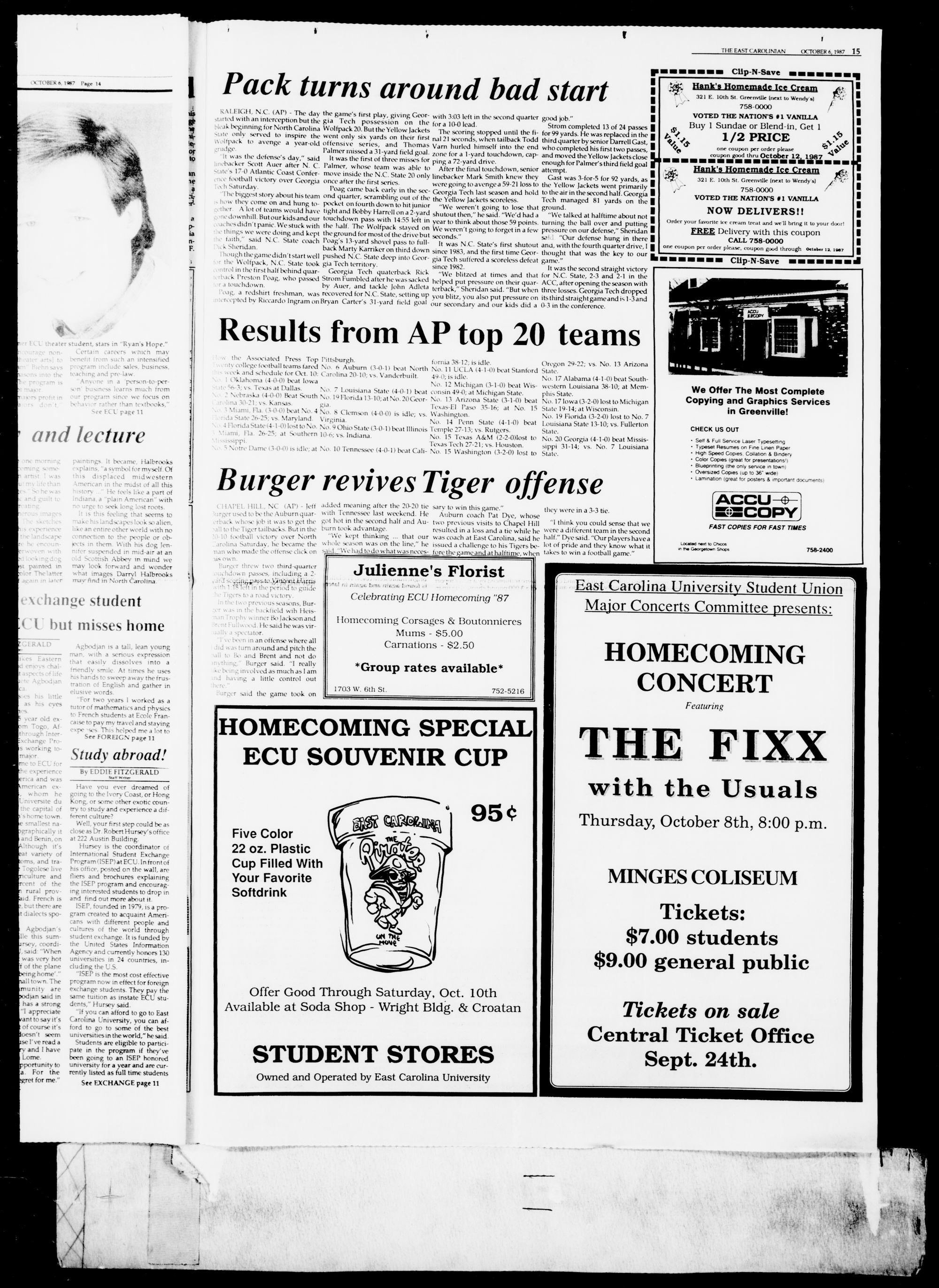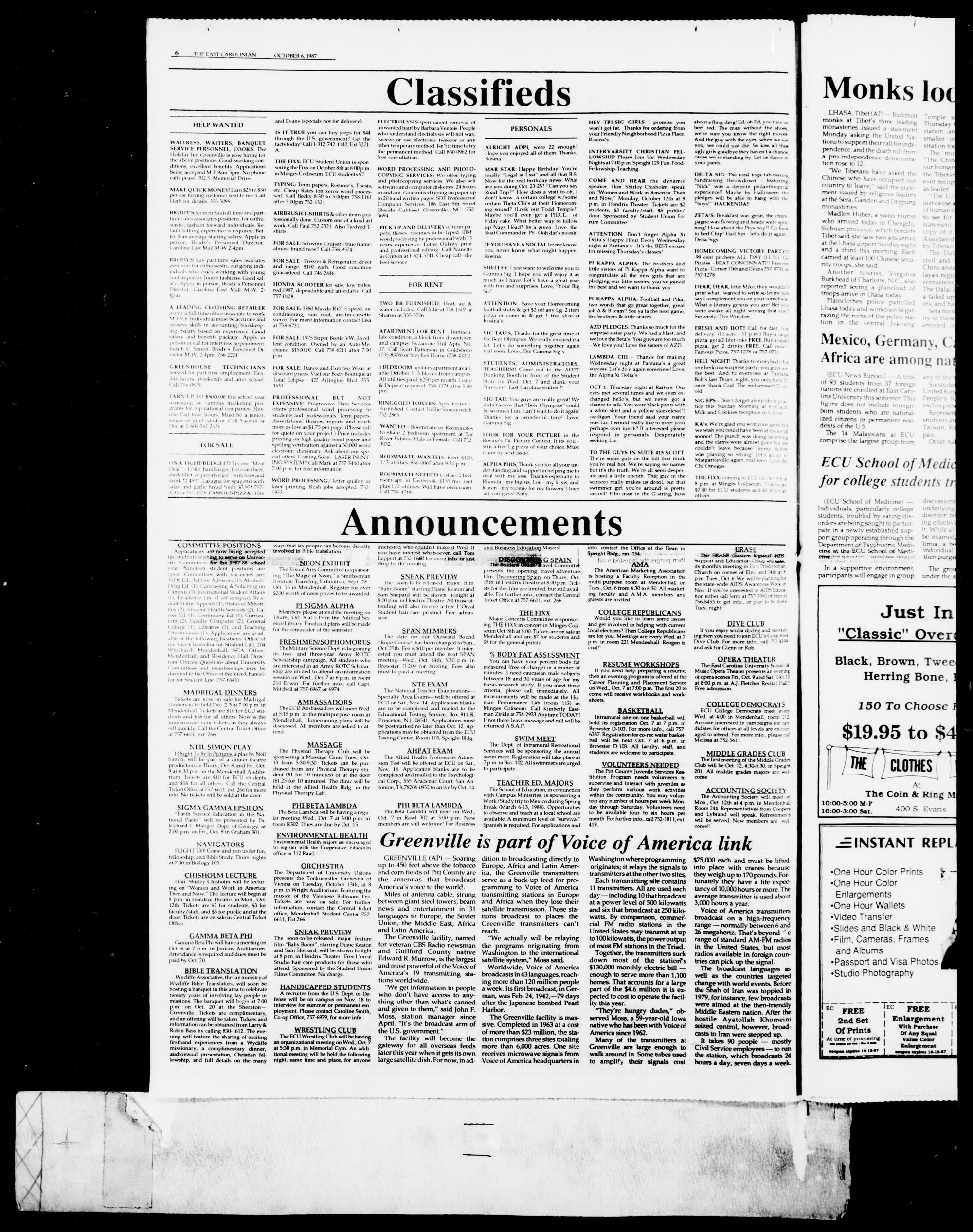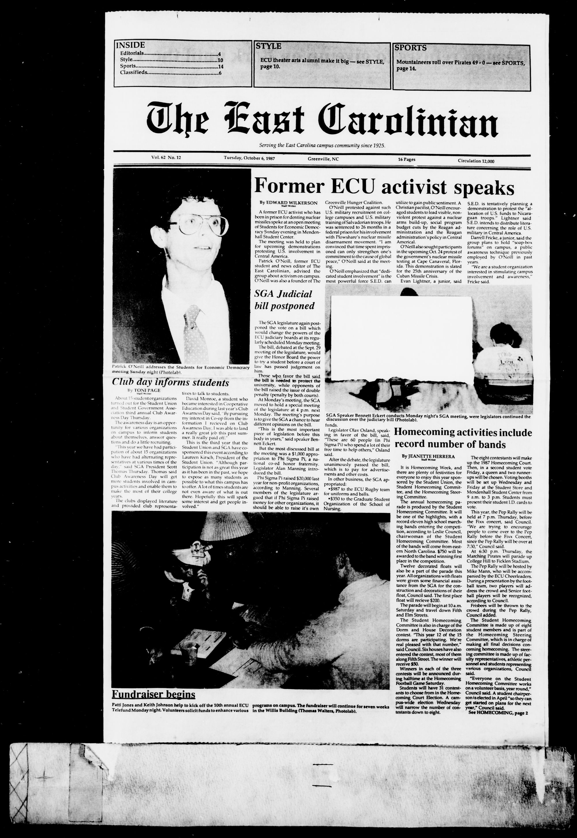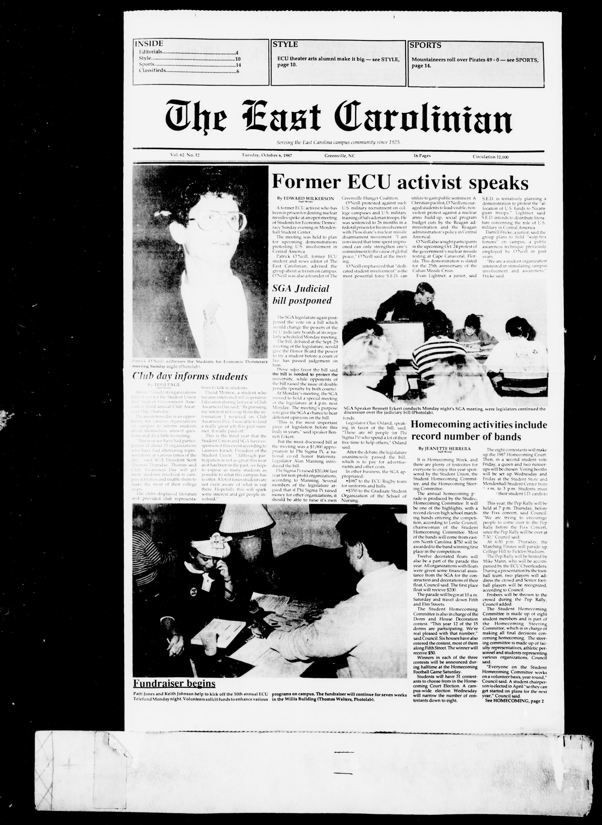 East Carolina's student-run campus newspaper was first published in 1923 as the East Carolina Teachers College News (1923-1925). It has been re-named as The Teco Echo (1925, 1926-1952), East Carolinian (1952-1969), Fountainhead (1969-1979), and The East Carolinian (1969, 1979-present). It includes local, state, national, and international stories with a focus on campus events.