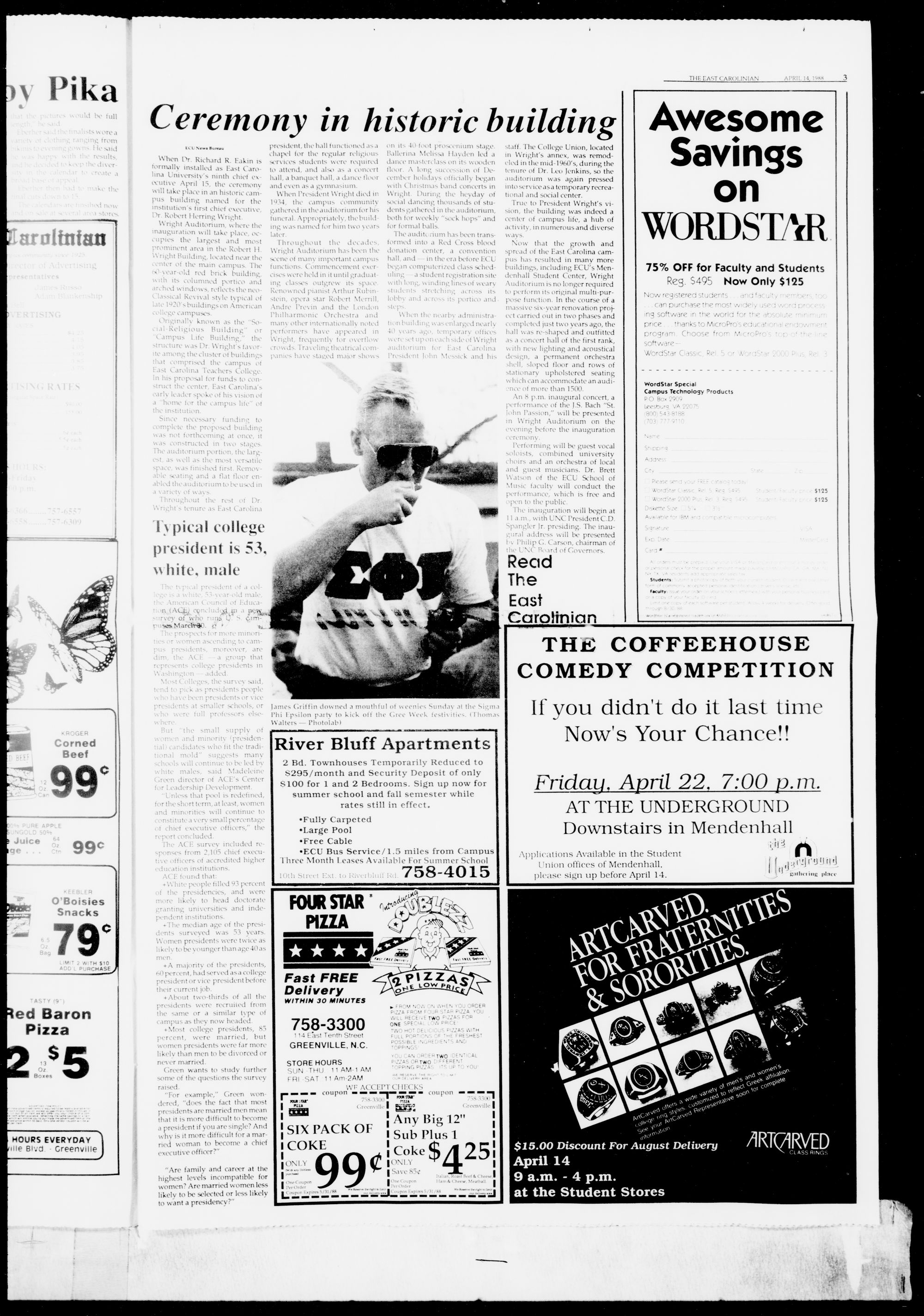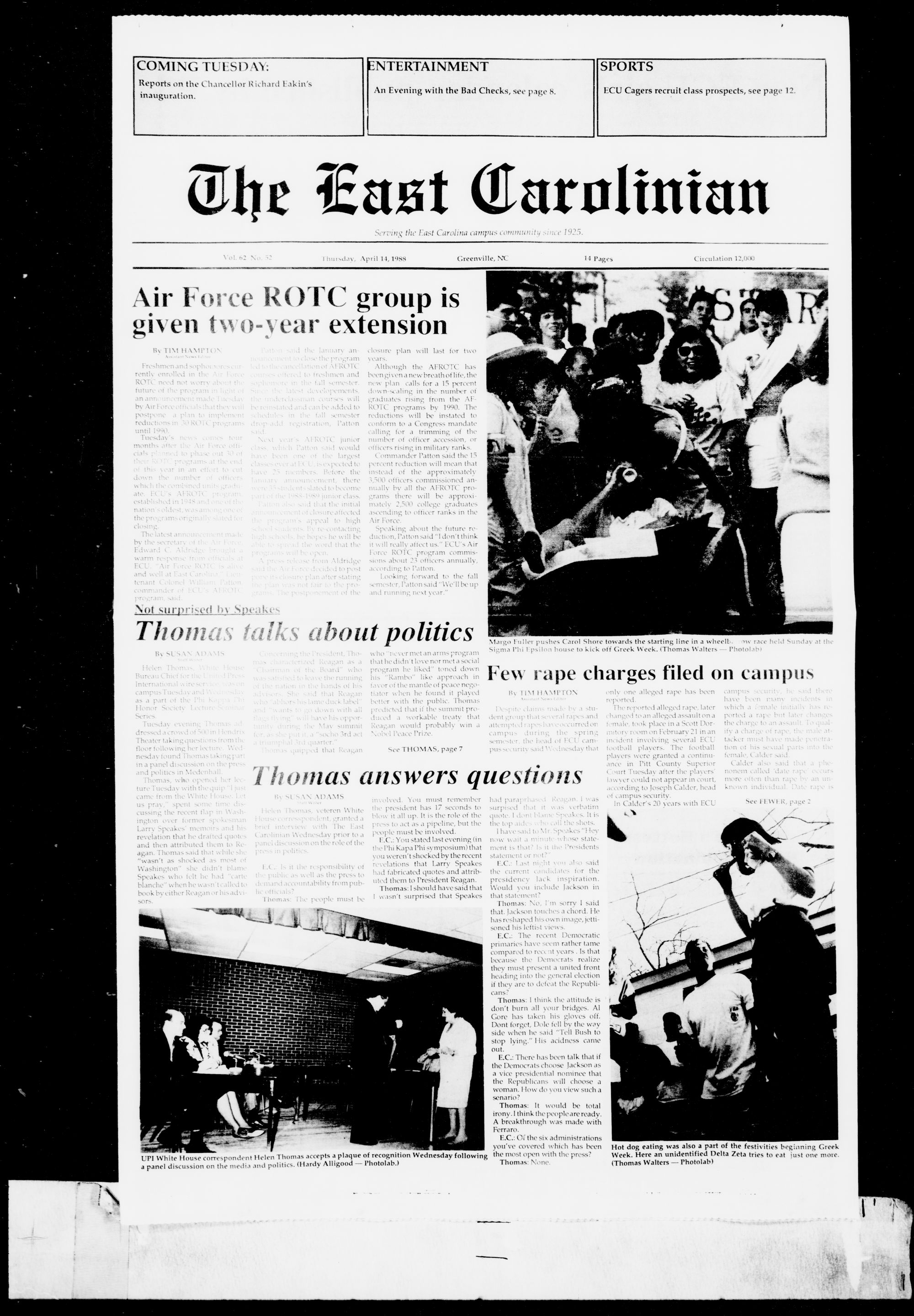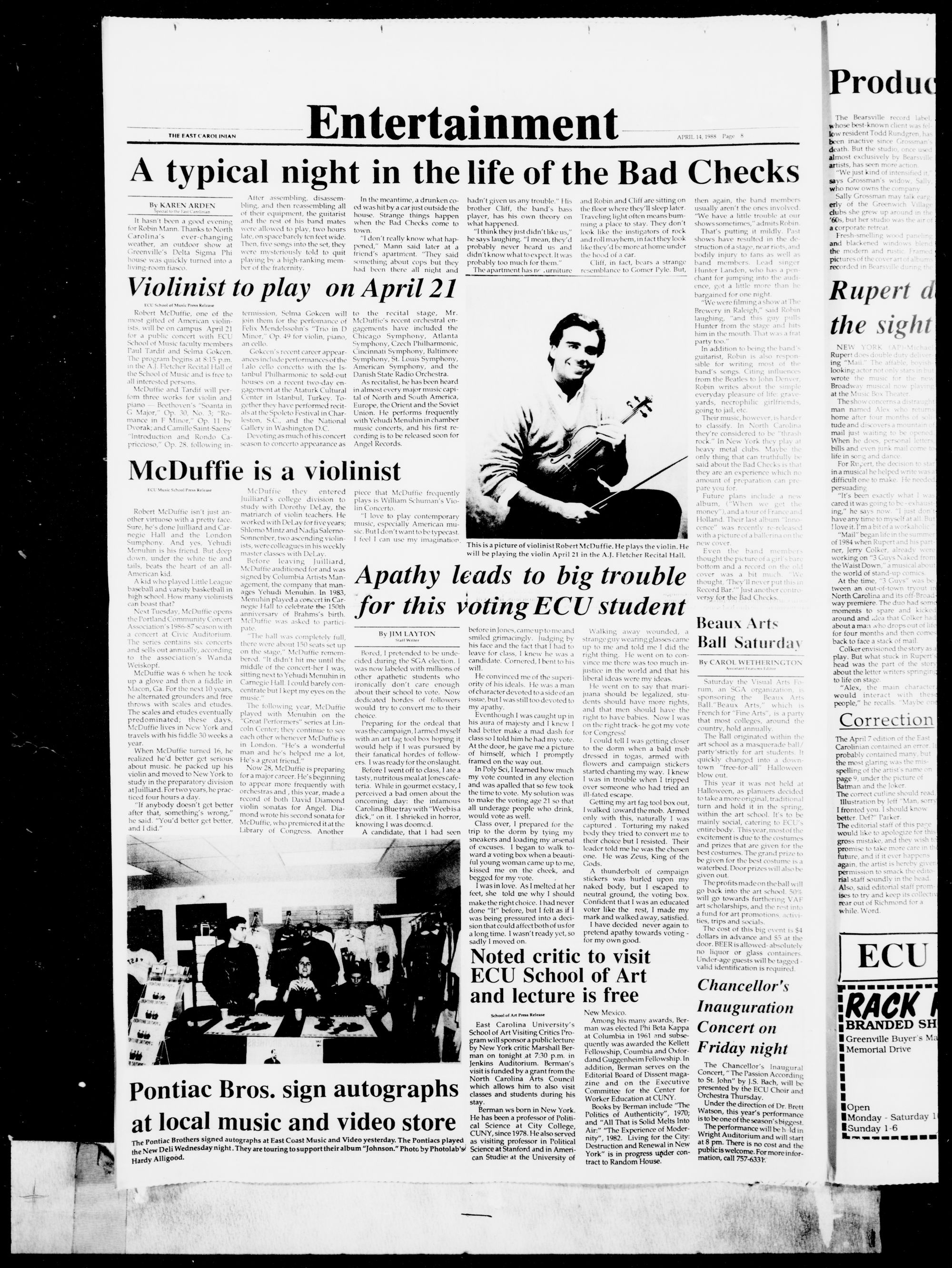 COMING TUESDAY: Reports on the Chancellor Richard Eakin's inauguration.ENTERTAINMENT An Evening with the Bad Checks, see page 8.SPORTS ECU Cagers recruit class prospects, see page 12. t