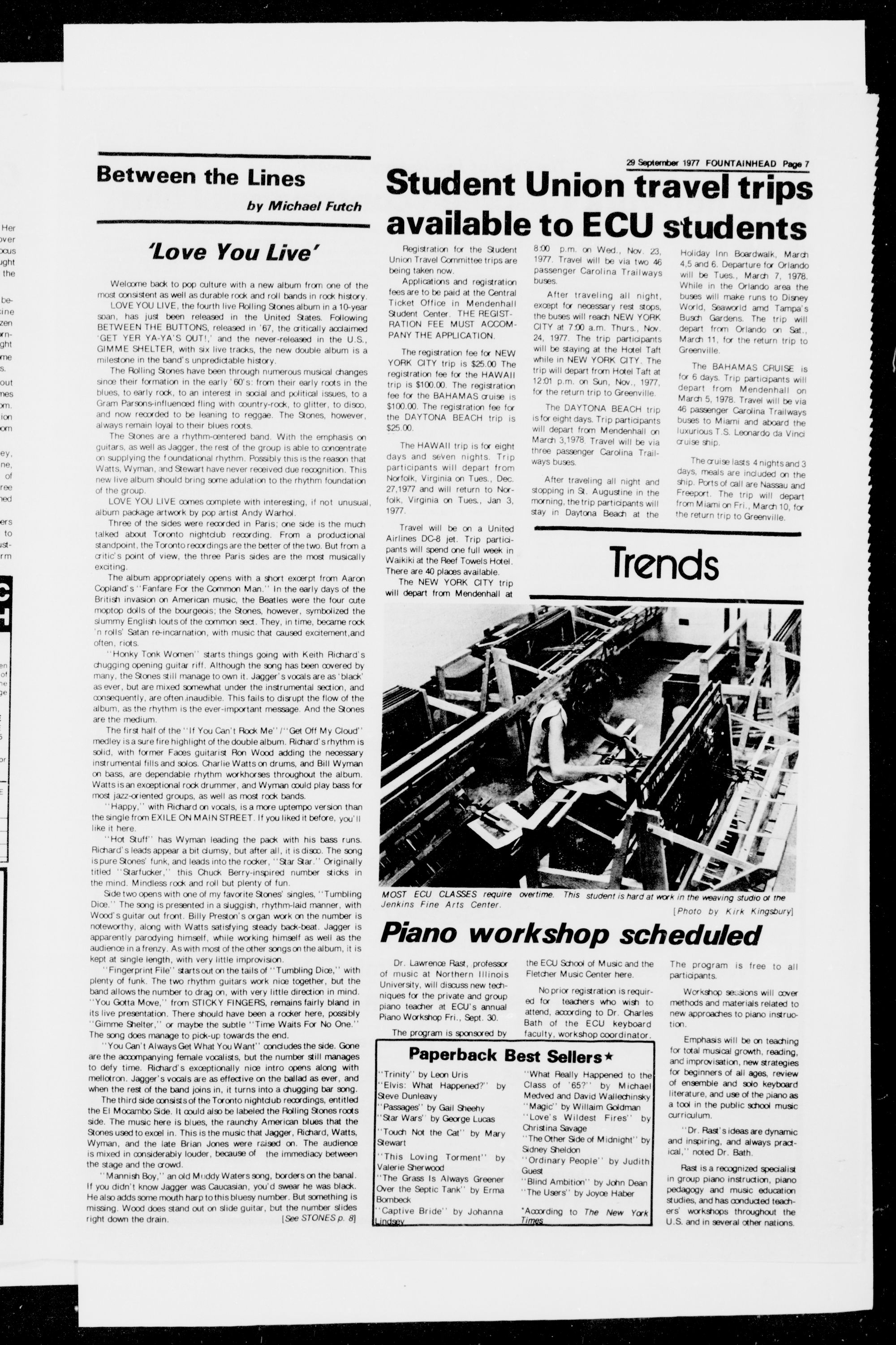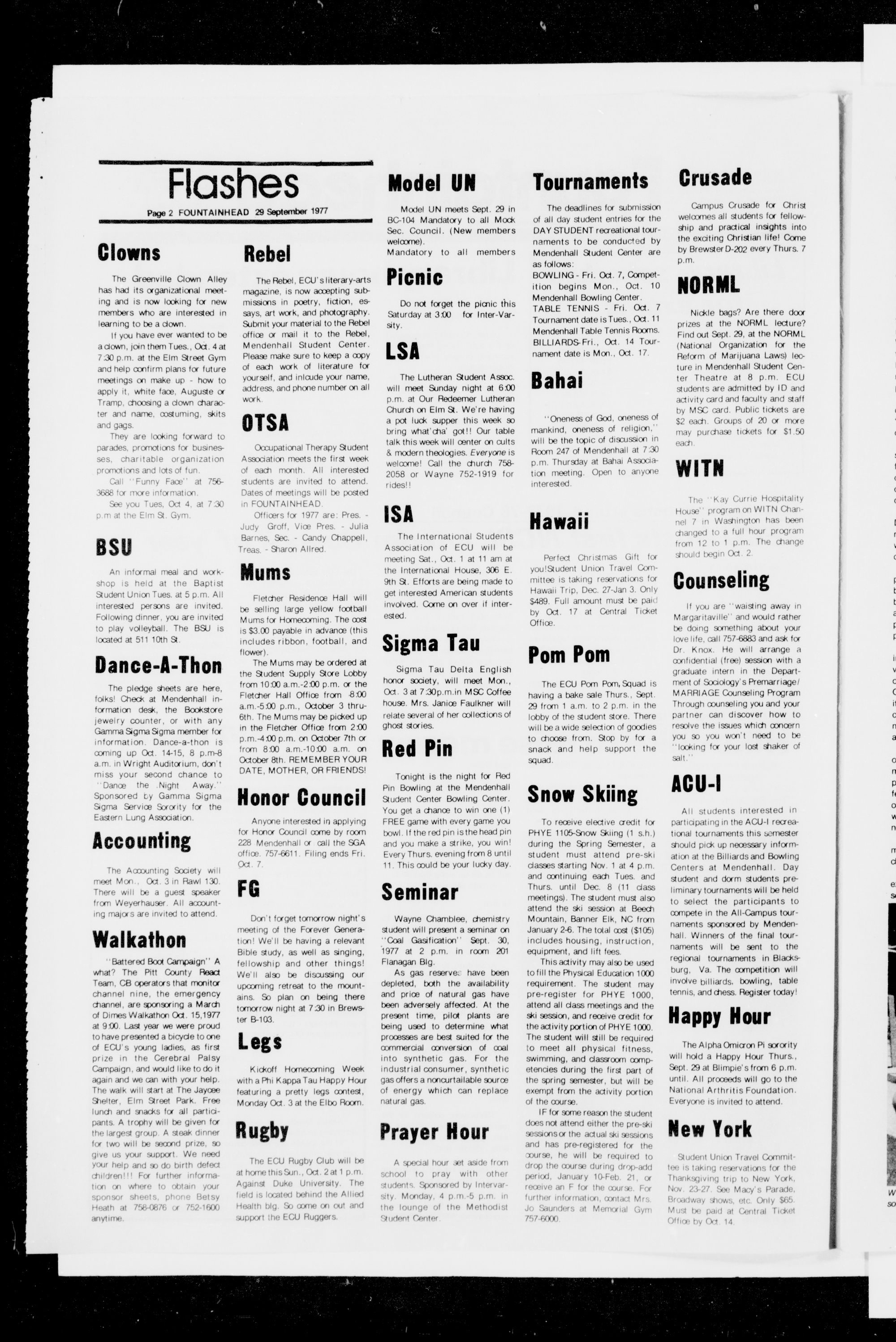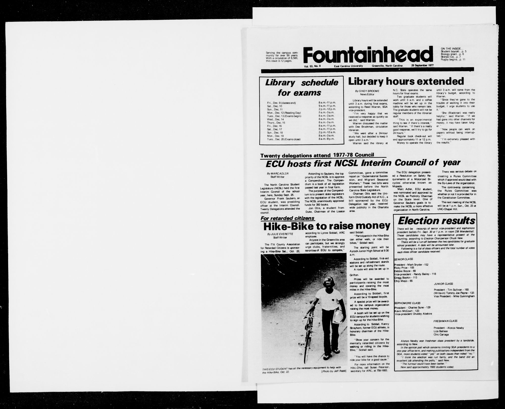 East Carolina's student-run campus newspaper was first published in 1923 as the East Carolina Teachers College News (1923-1925). It has been re-named as The Teco Echo (1925, 1926-1952), East Carolinian (1952-1969), Fountainhead (1969-1979), and The East Carolinian (1969, 1979-present). It includes local, state, national, and international stories with a focus on campus events.