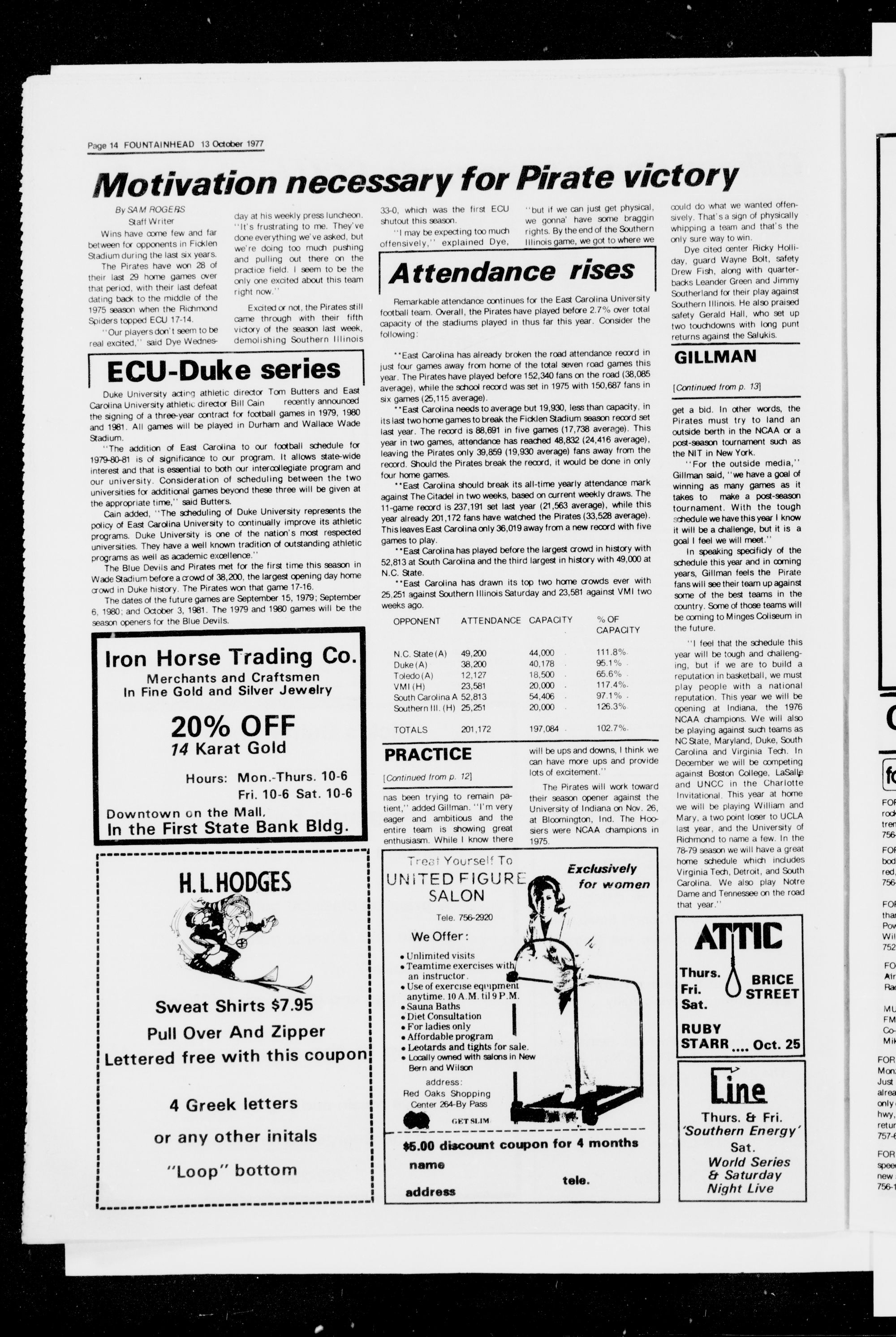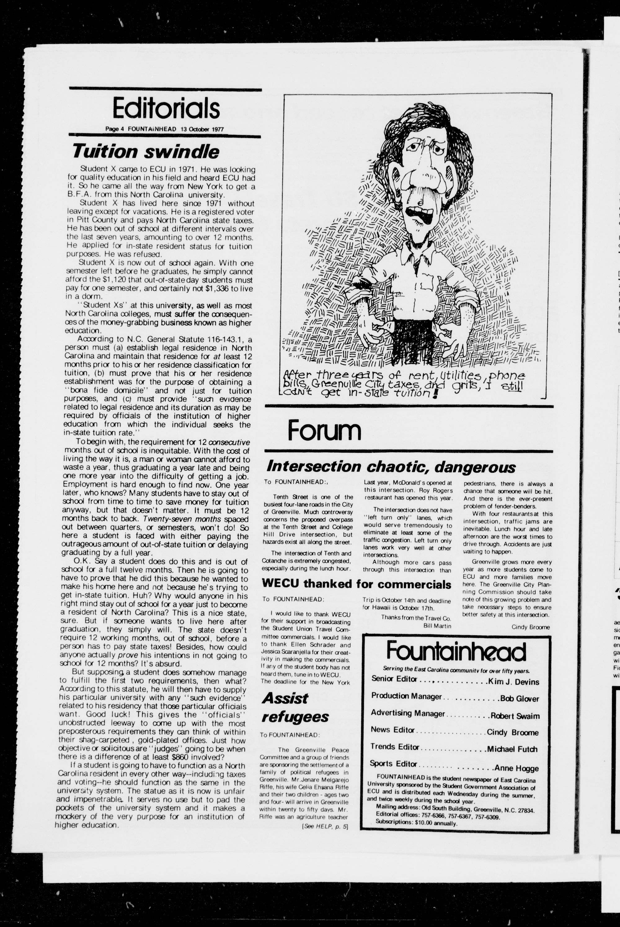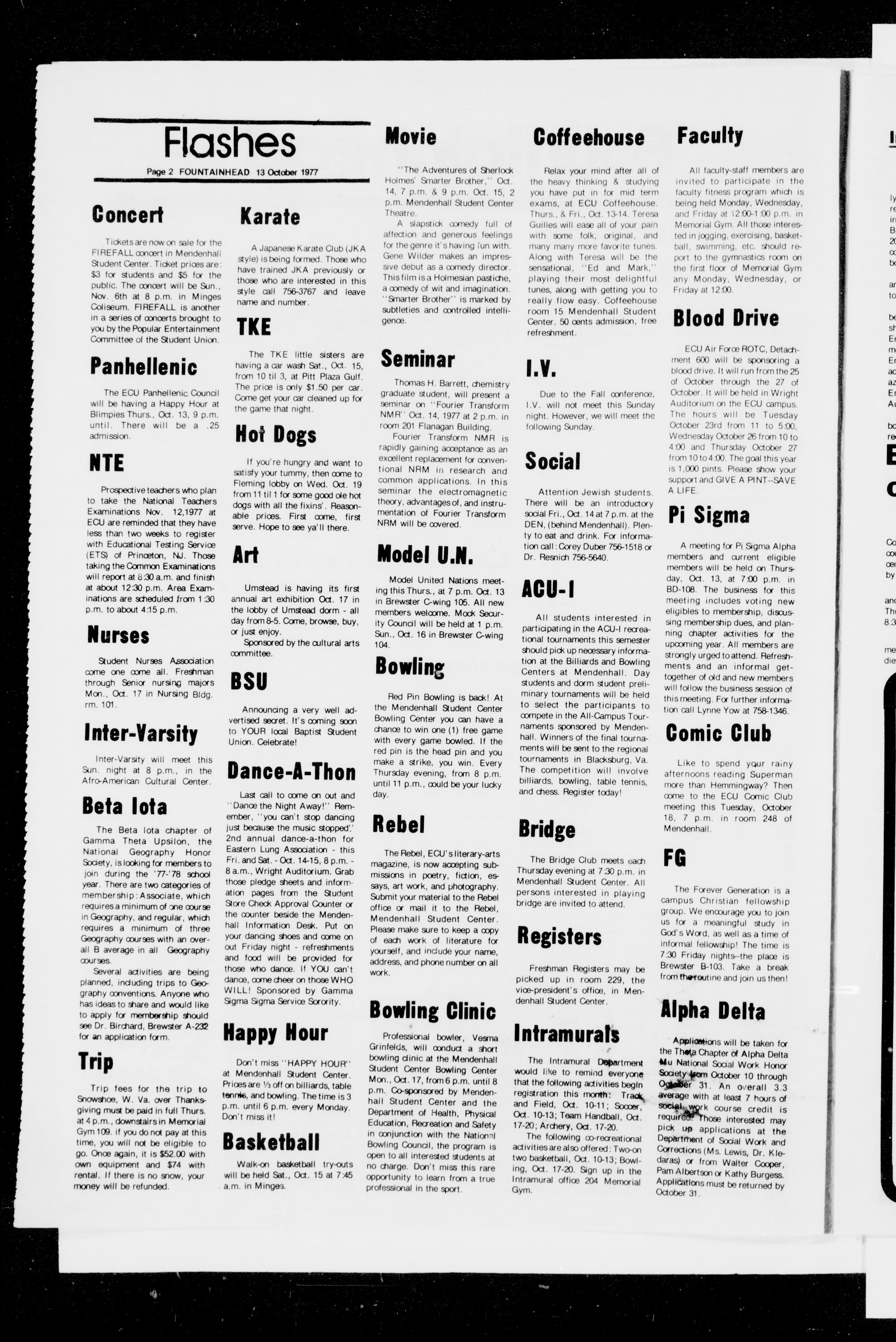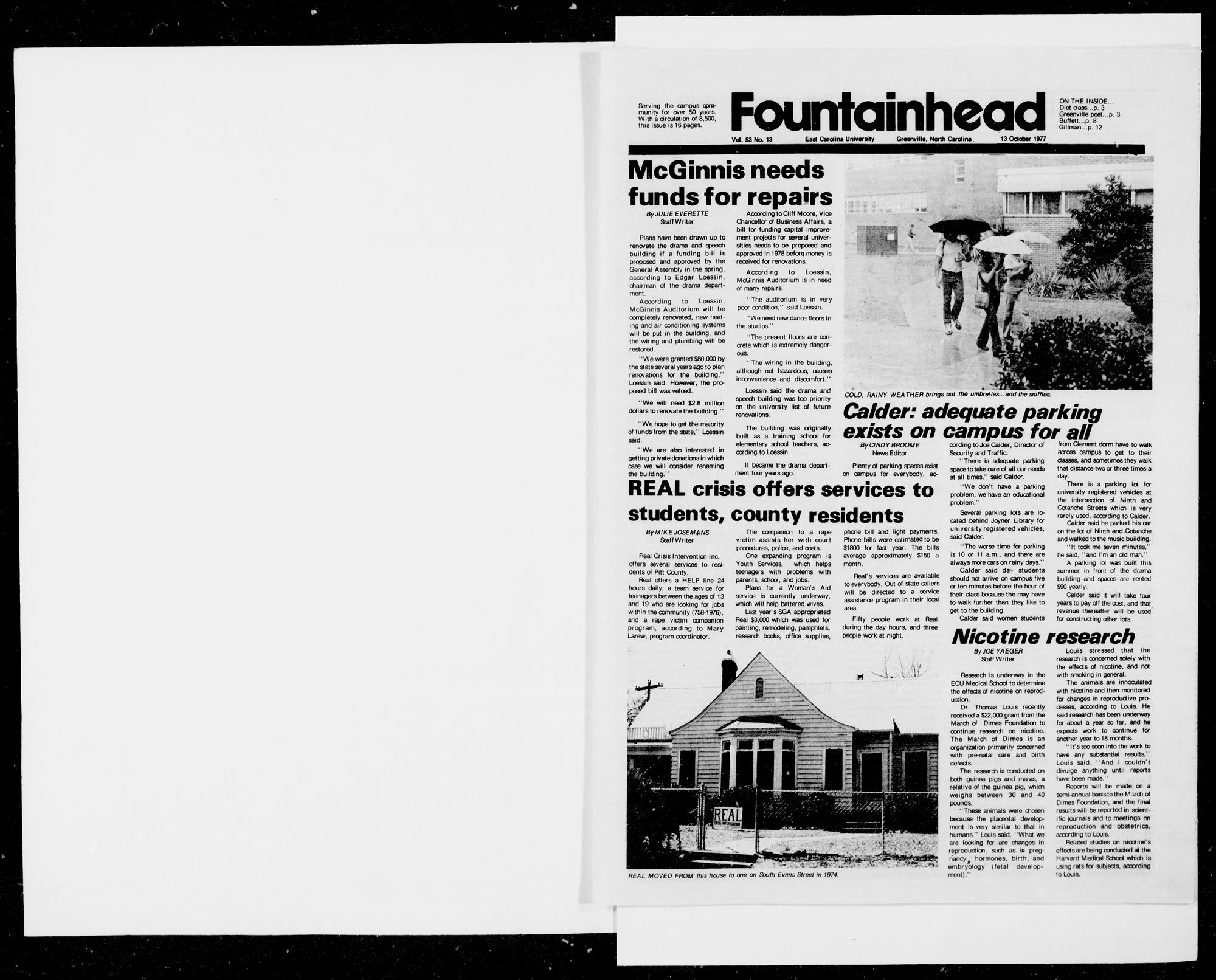 East Carolina's student-run campus newspaper was first published in 1923 as the East Carolina Teachers College News (1923-1925). It has been re-named as The Teco Echo (1925, 1926-1952), East Carolinian (1952-1969), Fountainhead (1969-1979), and The East Carolinian (1969, 1979-present). It includes local, state, national, and international stories with a focus on campus events.