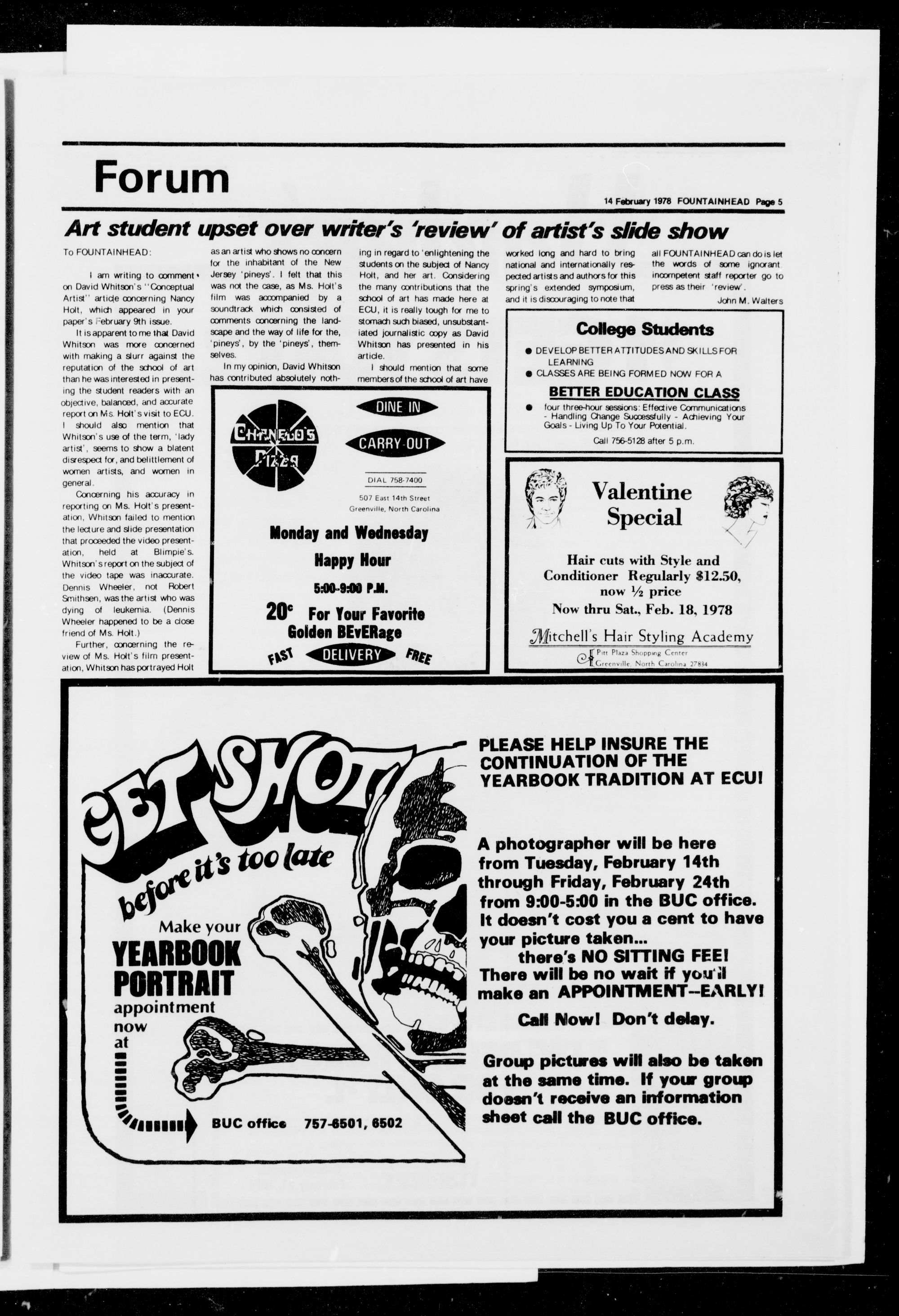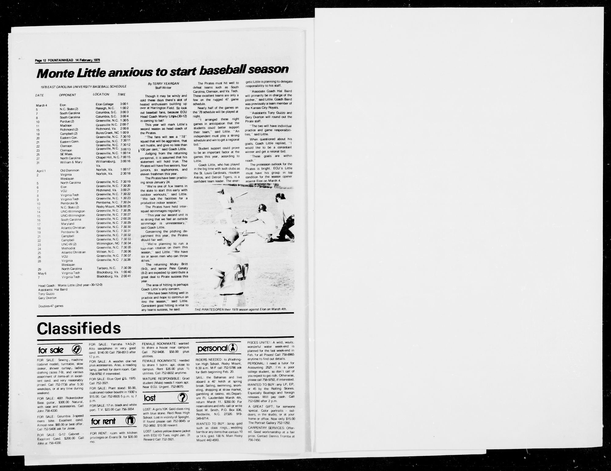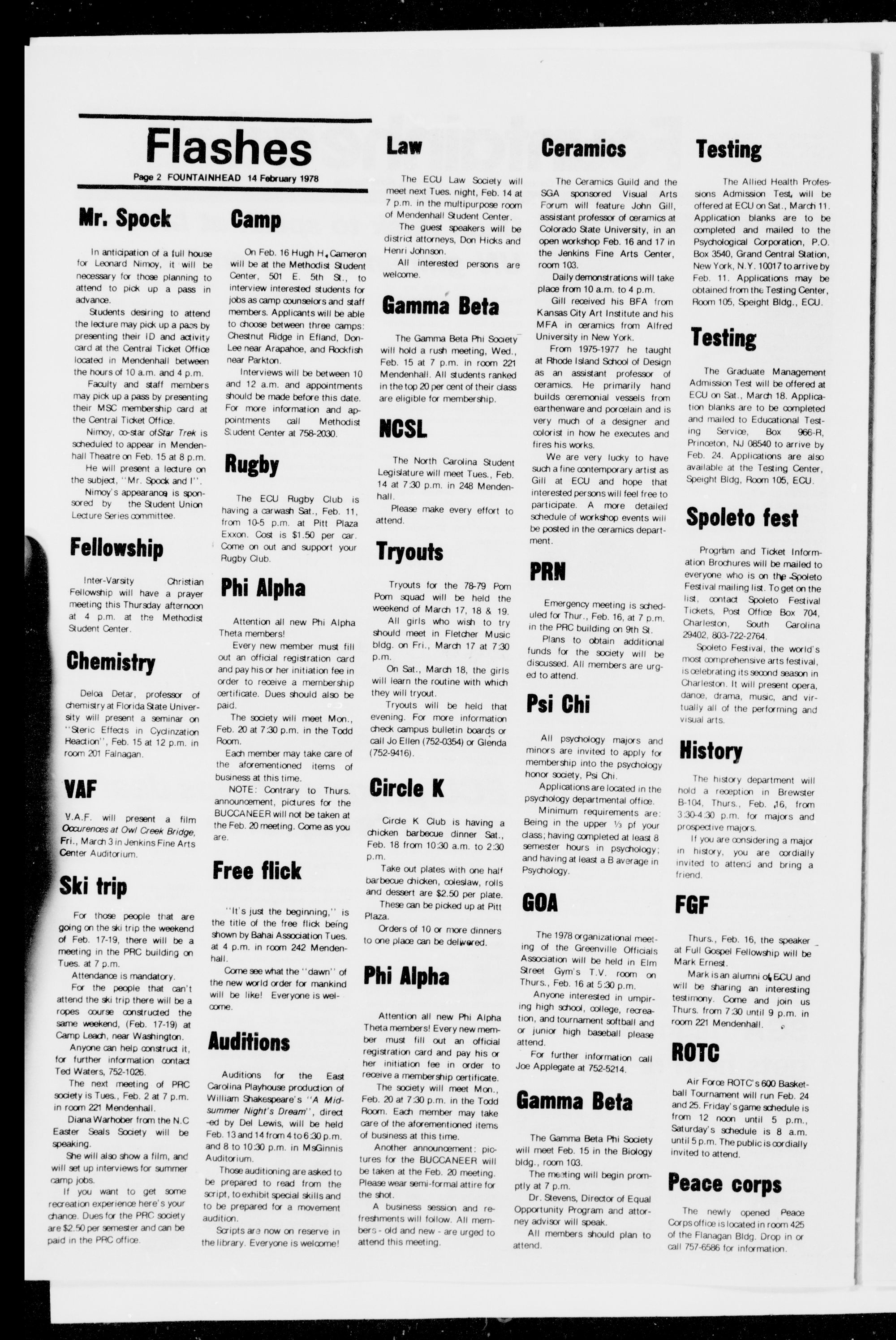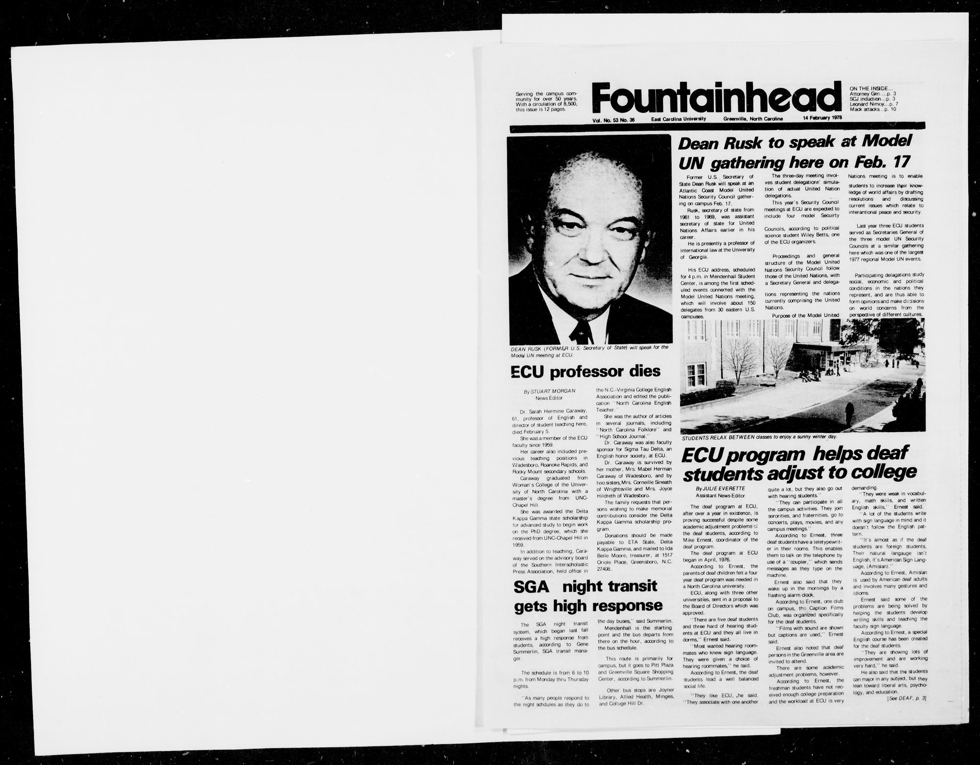 East Carolina's student-run campus newspaper was first published in 1923 as the East Carolina Teachers College News (1923-1925). It has been re-named as The Teco Echo (1925, 1926-1952), East Carolinian (1952-1969), Fountainhead (1969-1979), and The East Carolinian (1969, 1979-present). It includes local, state, national, and international stories with a focus on campus events.