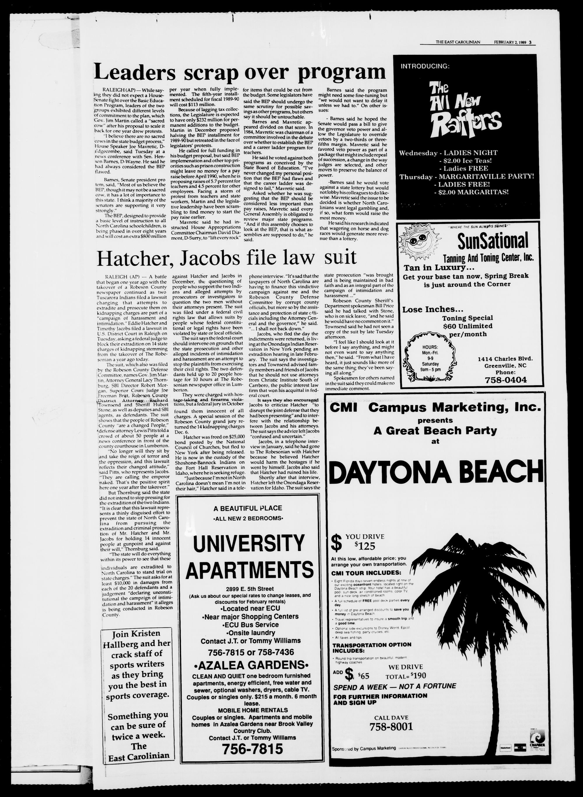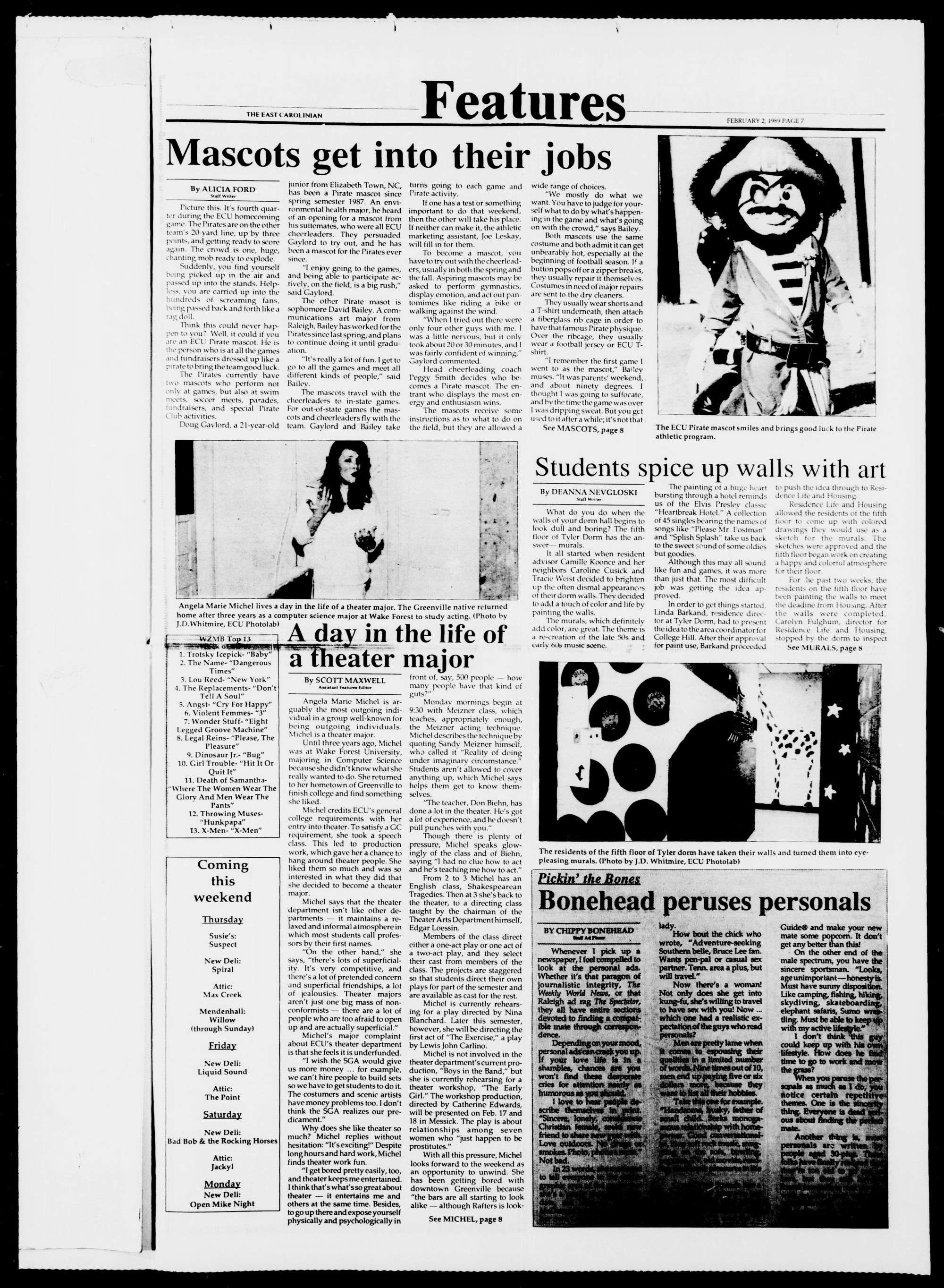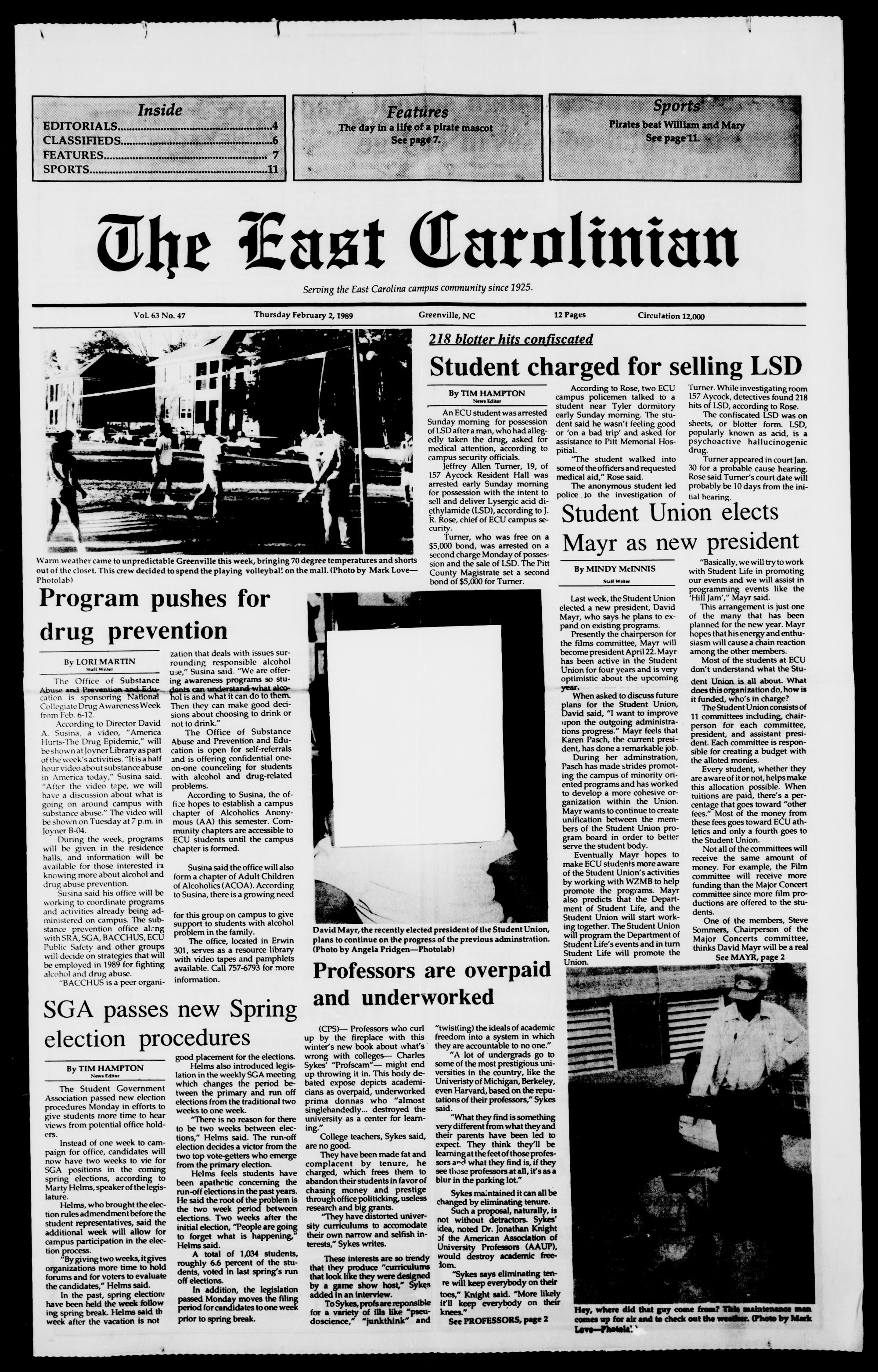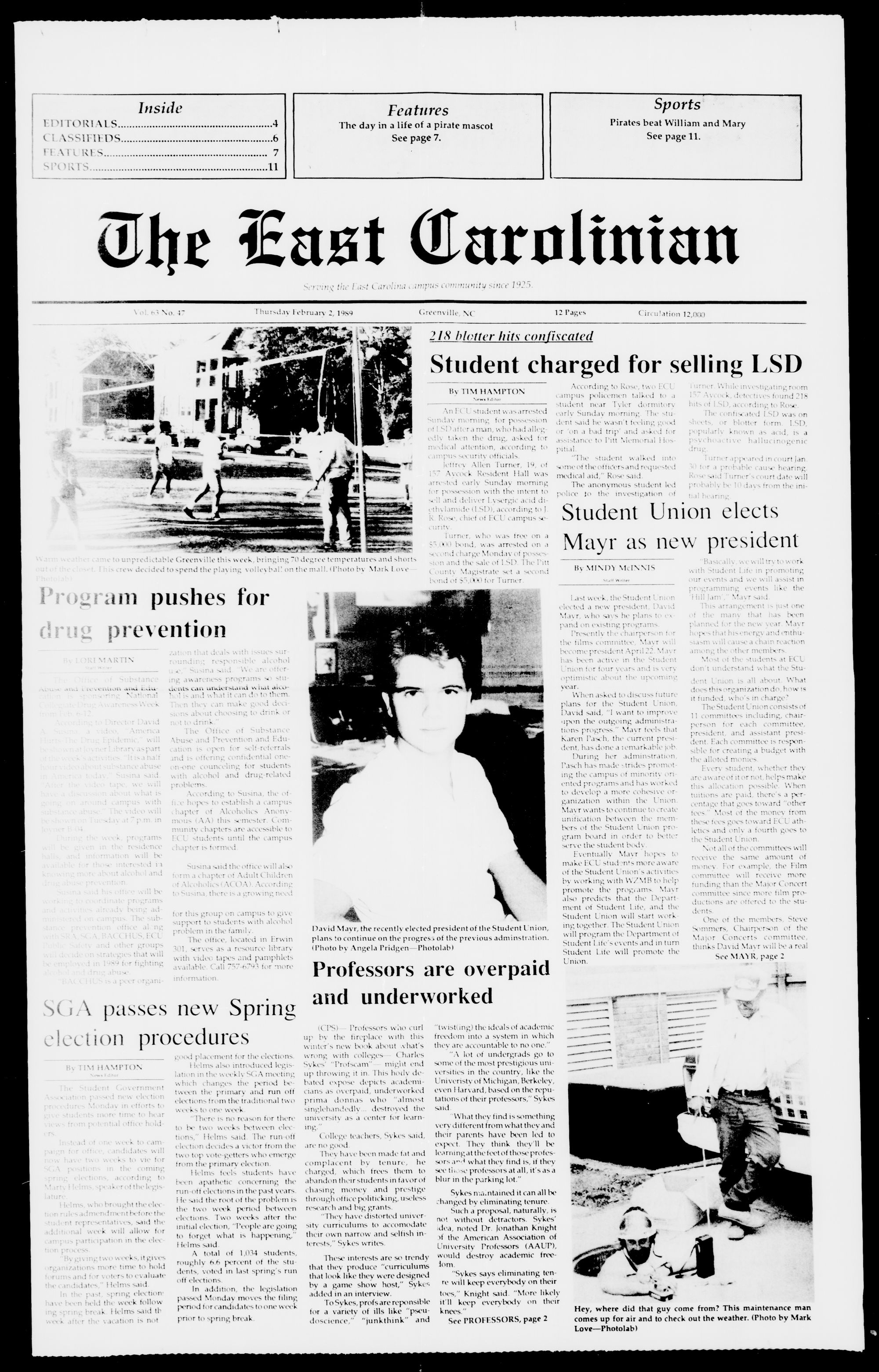 East Carolina's student-run campus newspaper was first published in 1923 as the East Carolina Teachers College News (1923-1925). It has been re-named as The Teco Echo (1925, 1926-1952), East Carolinian (1952-1969), Fountainhead (1969-1979), and The East Carolinian (1969, 1979-present). It includes local, state, national, and international stories with a focus on campus events.