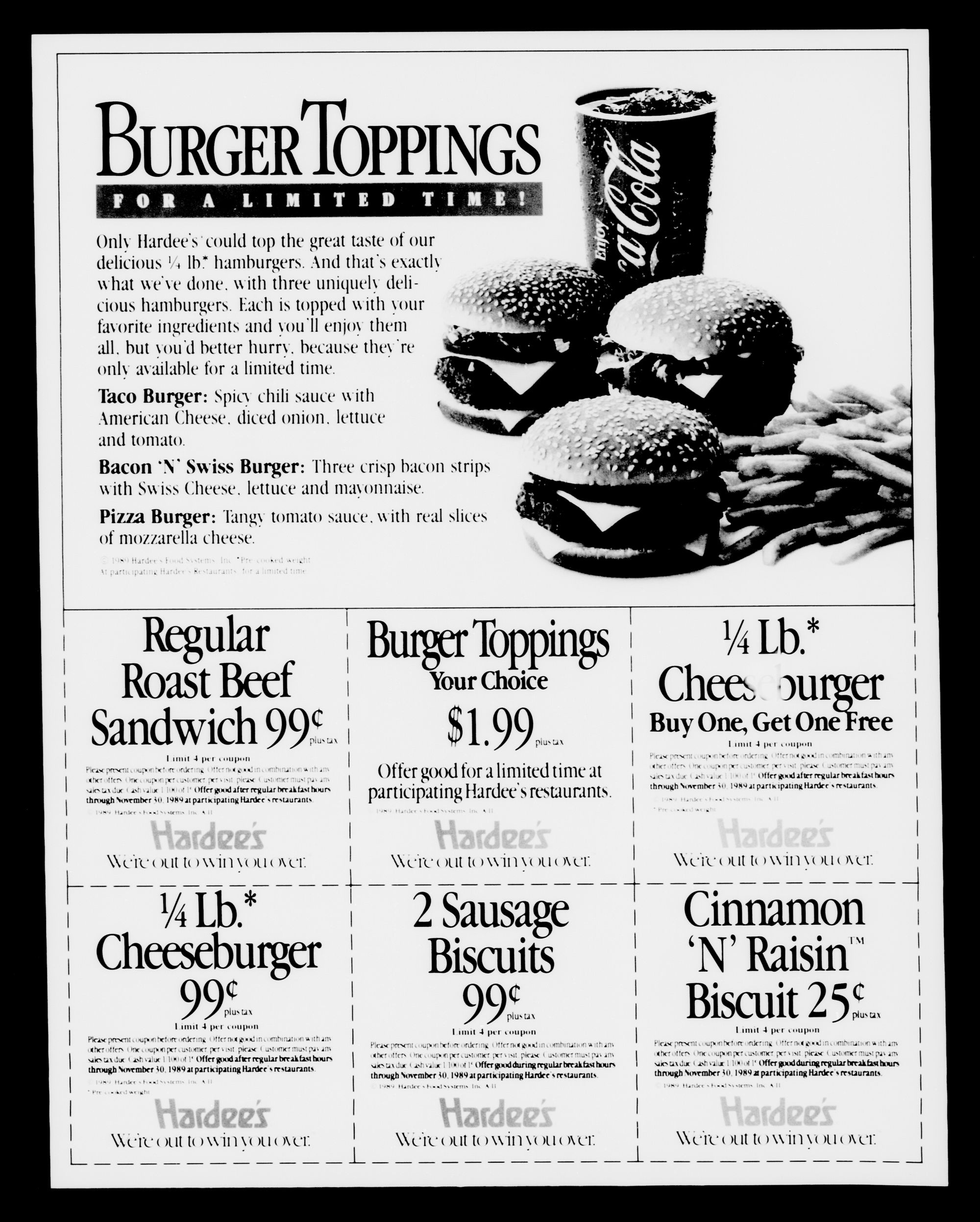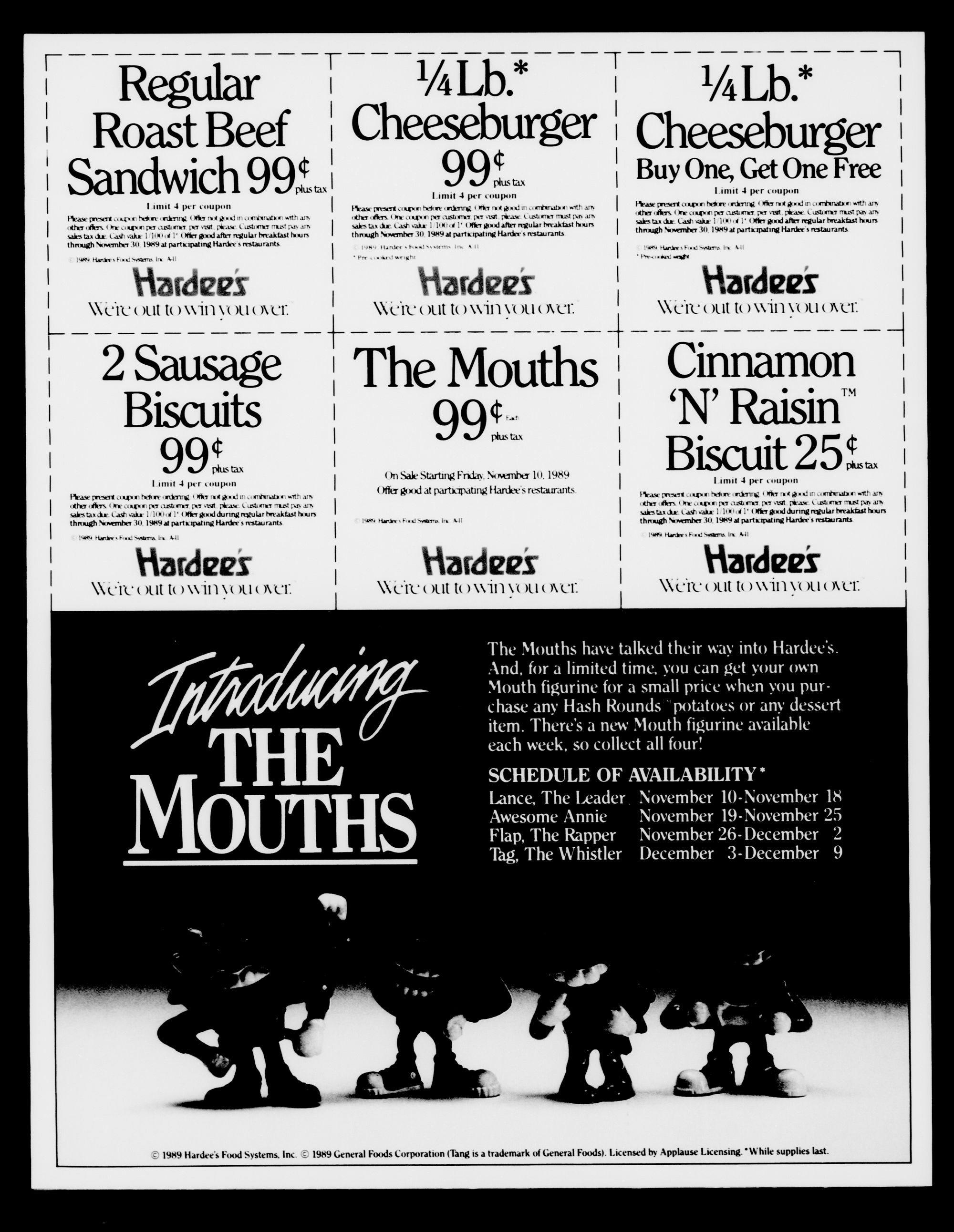 0 1989 Hardees Food Systems. Inc. 6 1989 General Foods Corporation (Tang is a trademark of General Foods) Licensed by Applause Licensing " While supplies last