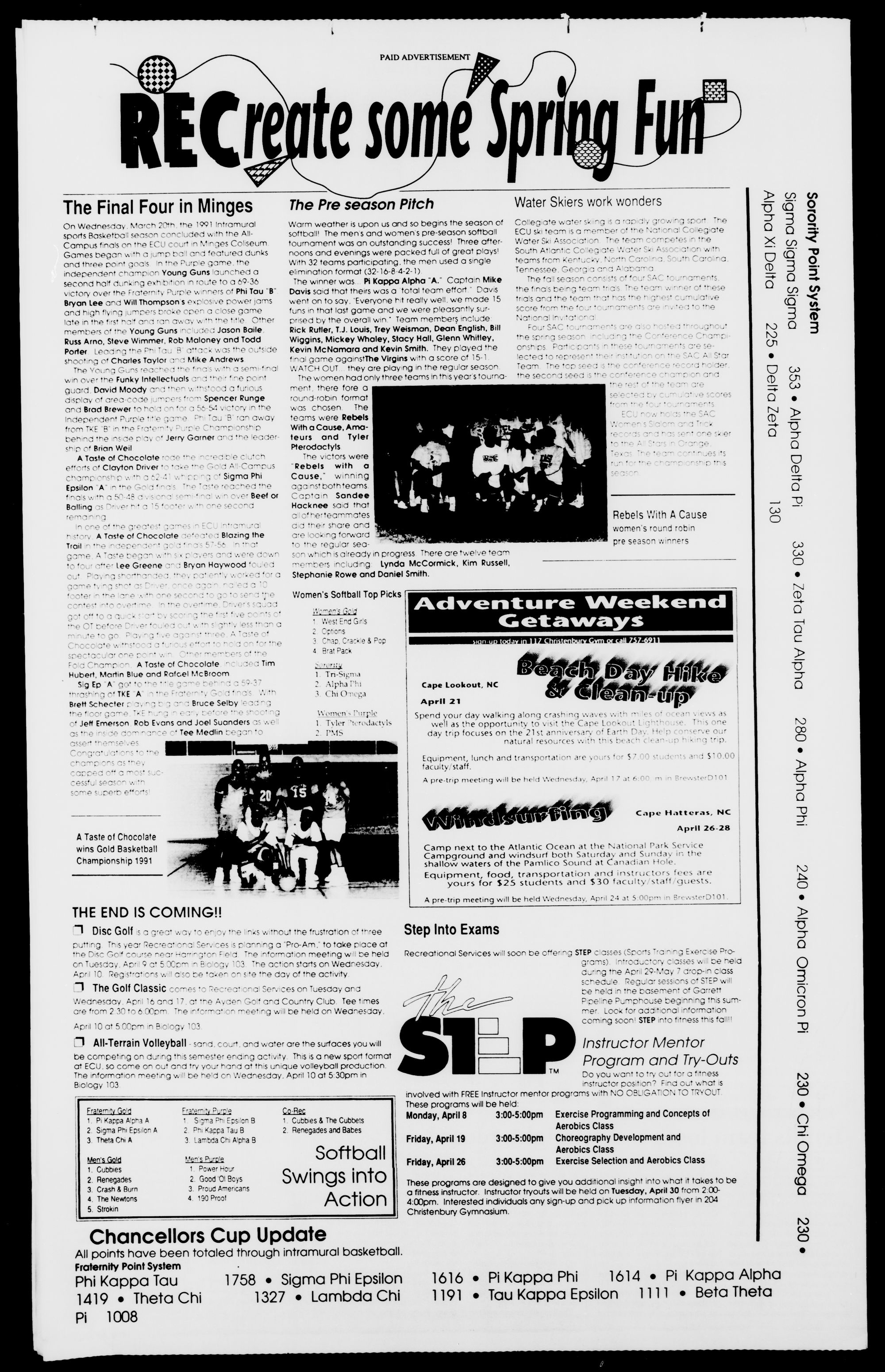 Fraternity Qo'd 1. Pi Kappa Alpha a 2. Sigma Pru Epsiion A 3 Theta Chi A Men's Gold 1. Cubbies 2. Renegades 3 Crash & Burn 4. The Newtons 5. StrokinFraternity Purple 1 S-gma Phi Epsiion B 2 Phi Kappa TauB 3 Lambda Chi Alpha B Men's P'jrD!e 1. Power Hour 2 Good 0l Boys 3. Proud Americans 4. 190 ProofCo-Pec 1. Cubbies & TheCubbets 2. Renegades and Babes Softball Swings into Action