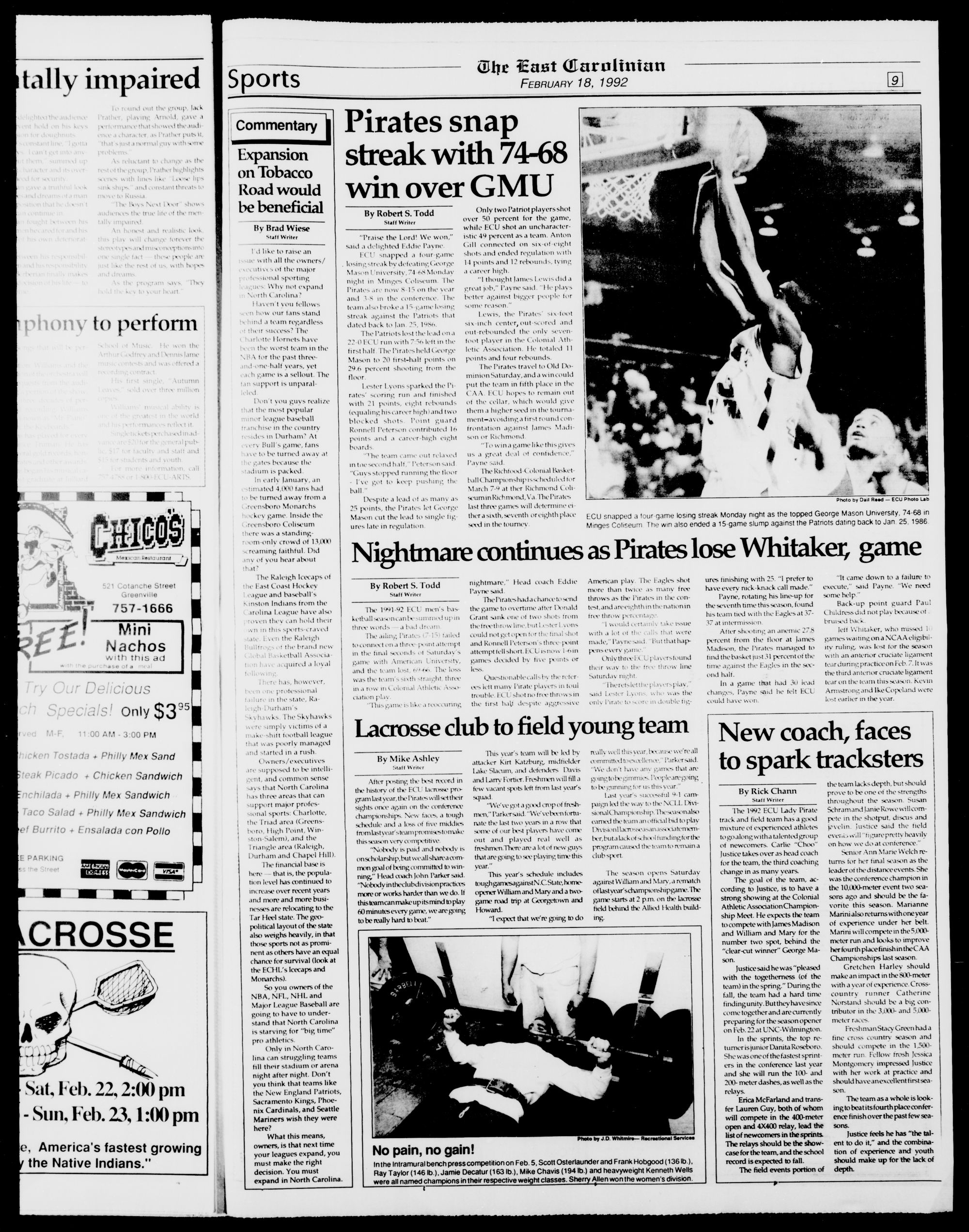 East Carolina's student-run campus newspaper was first published in 1923 as the East Carolina Teachers College News (1923-1925). It has been re-named as The Teco Echo (1925, 1926-1952), East Carolinian (1952-1969), Fountainhead (1969-1979), and The East Carolinian (1969, 1979-present). It includes local, state, national, and international stories with a focus on campus events.