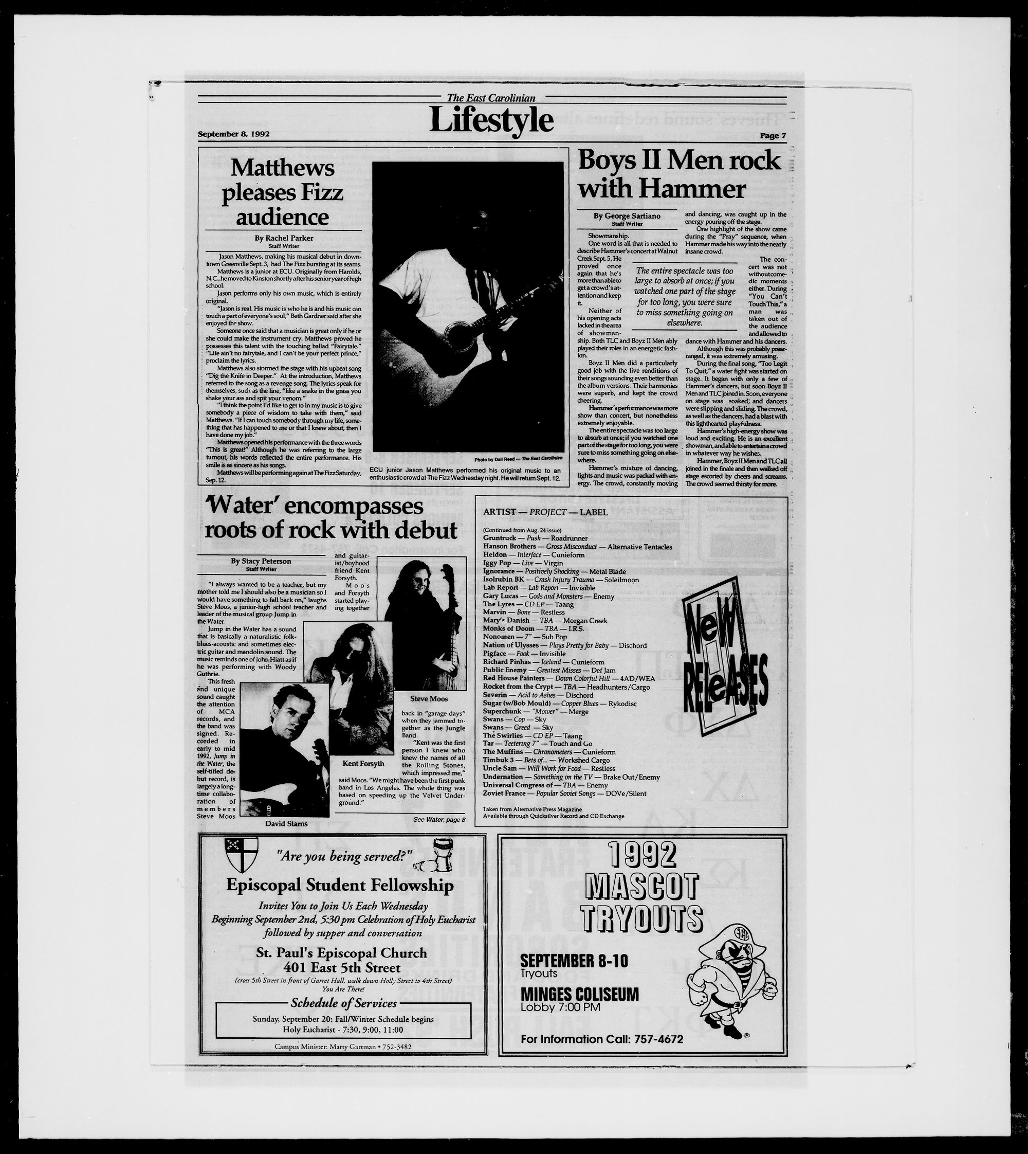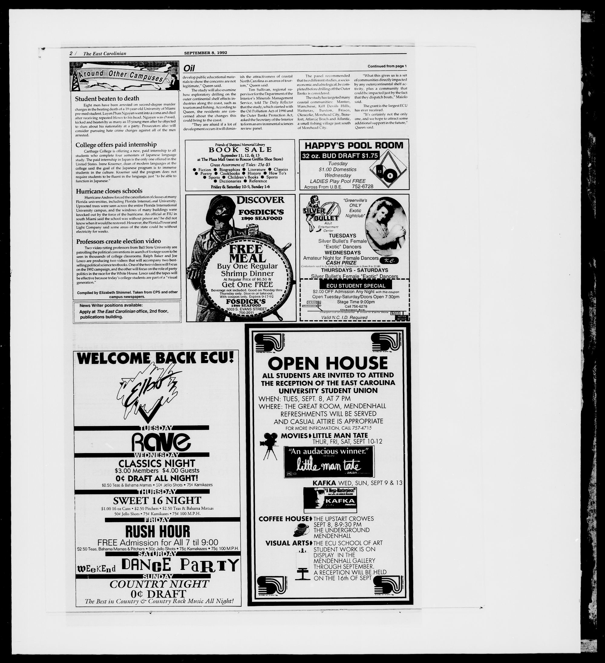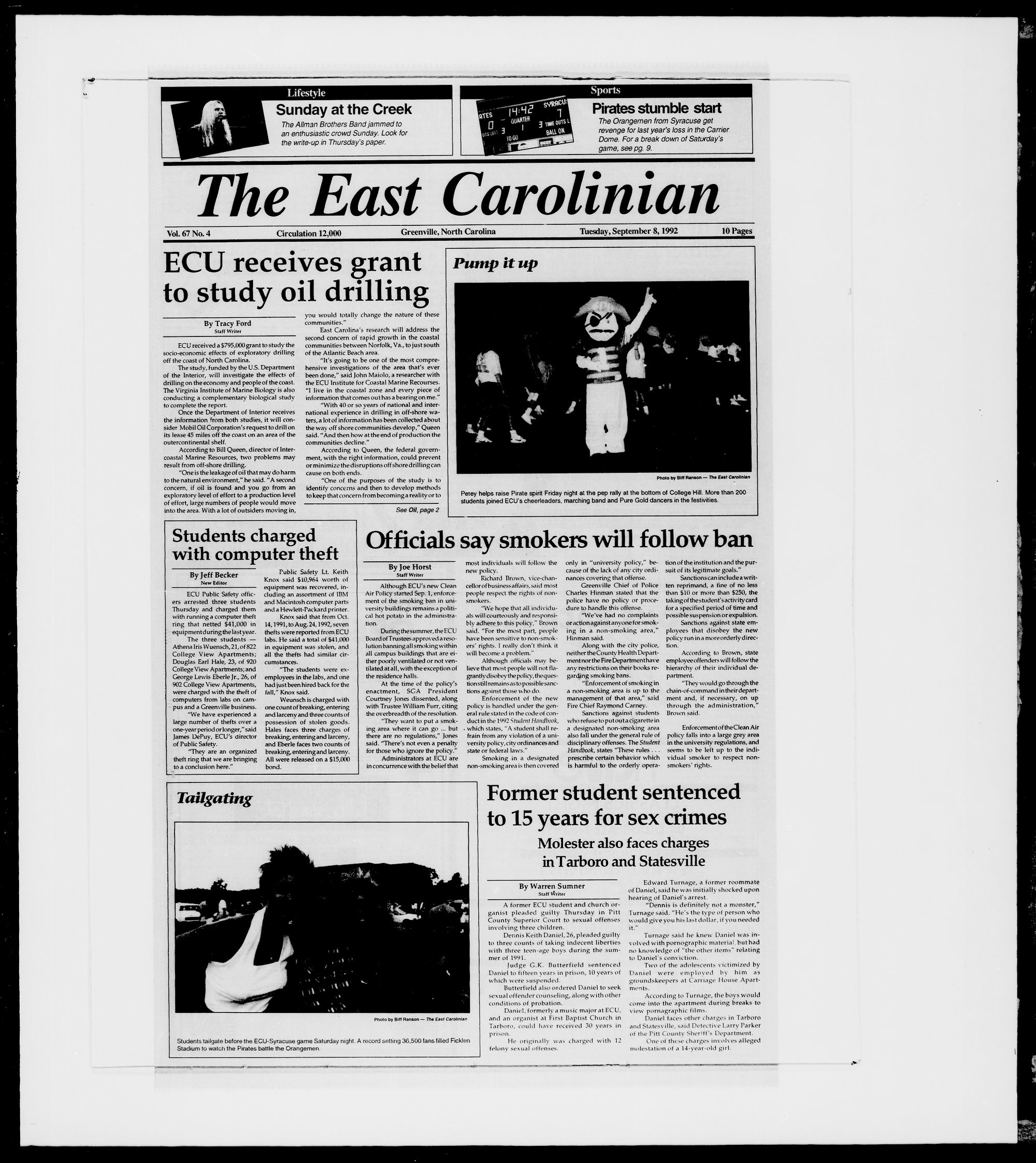 East Carolina's student-run campus newspaper was first published in 1923 as the East Carolina Teachers College News (1923-1925). It has been re-named as The Teco Echo (1925, 1926-1952), East Carolinian (1952-1969), Fountainhead (1969-1979), and The East Carolinian (1969, 1979-present). It includes local, state, national, and international stories with a focus on campus events.
