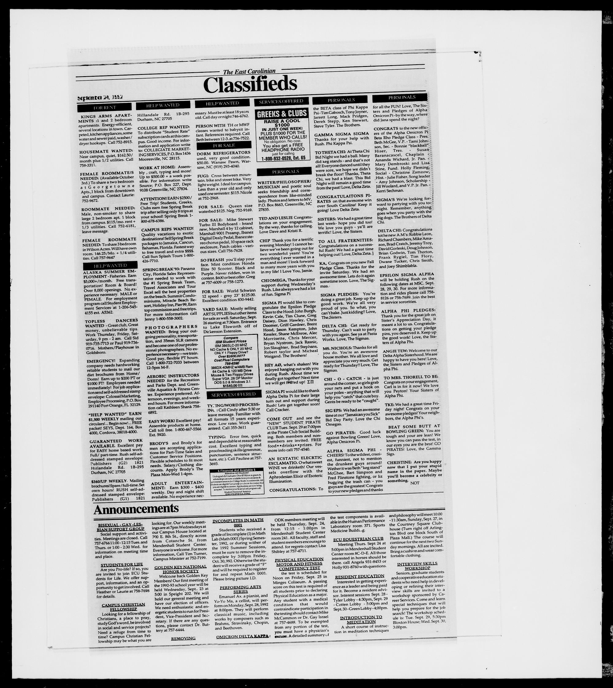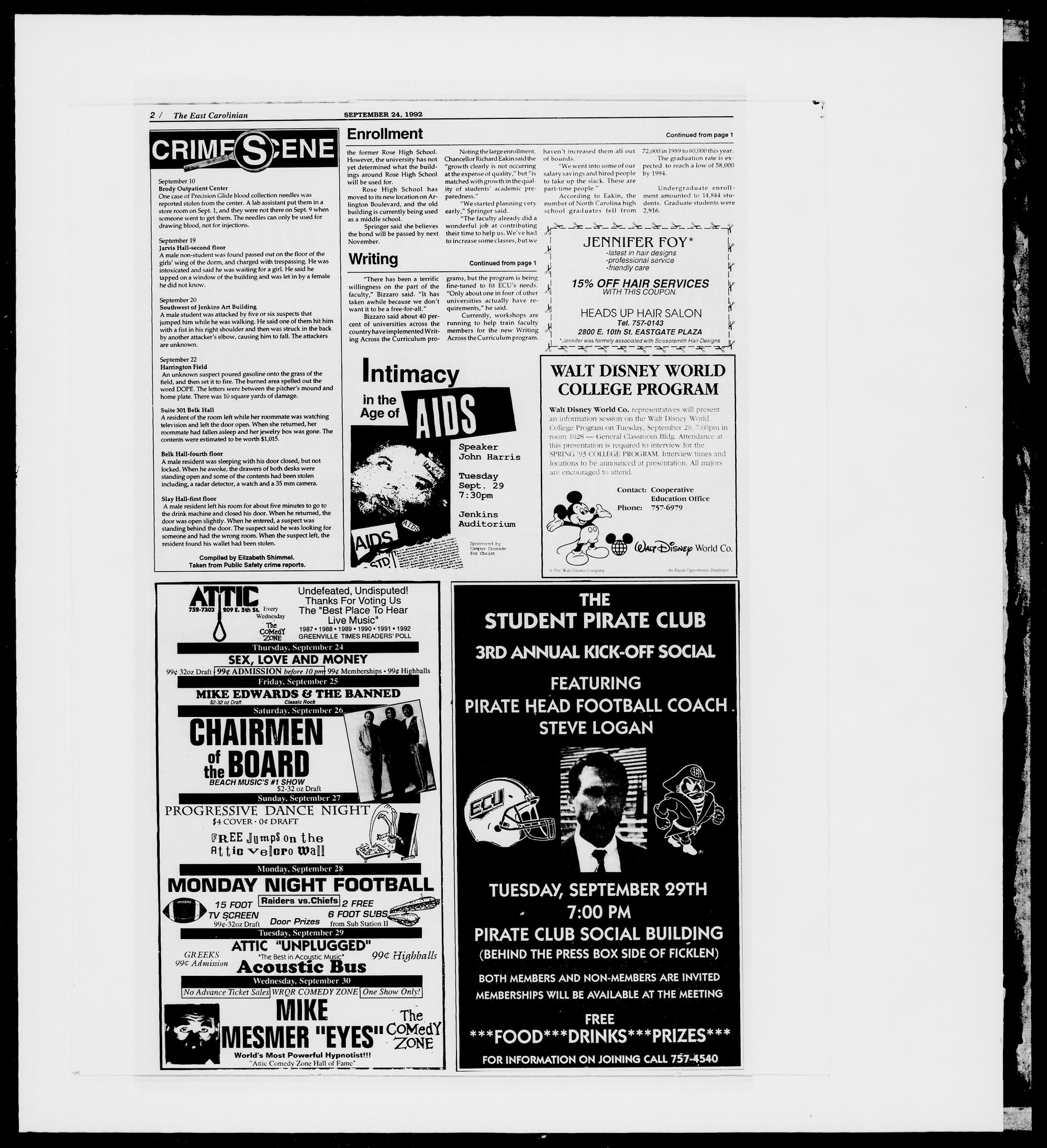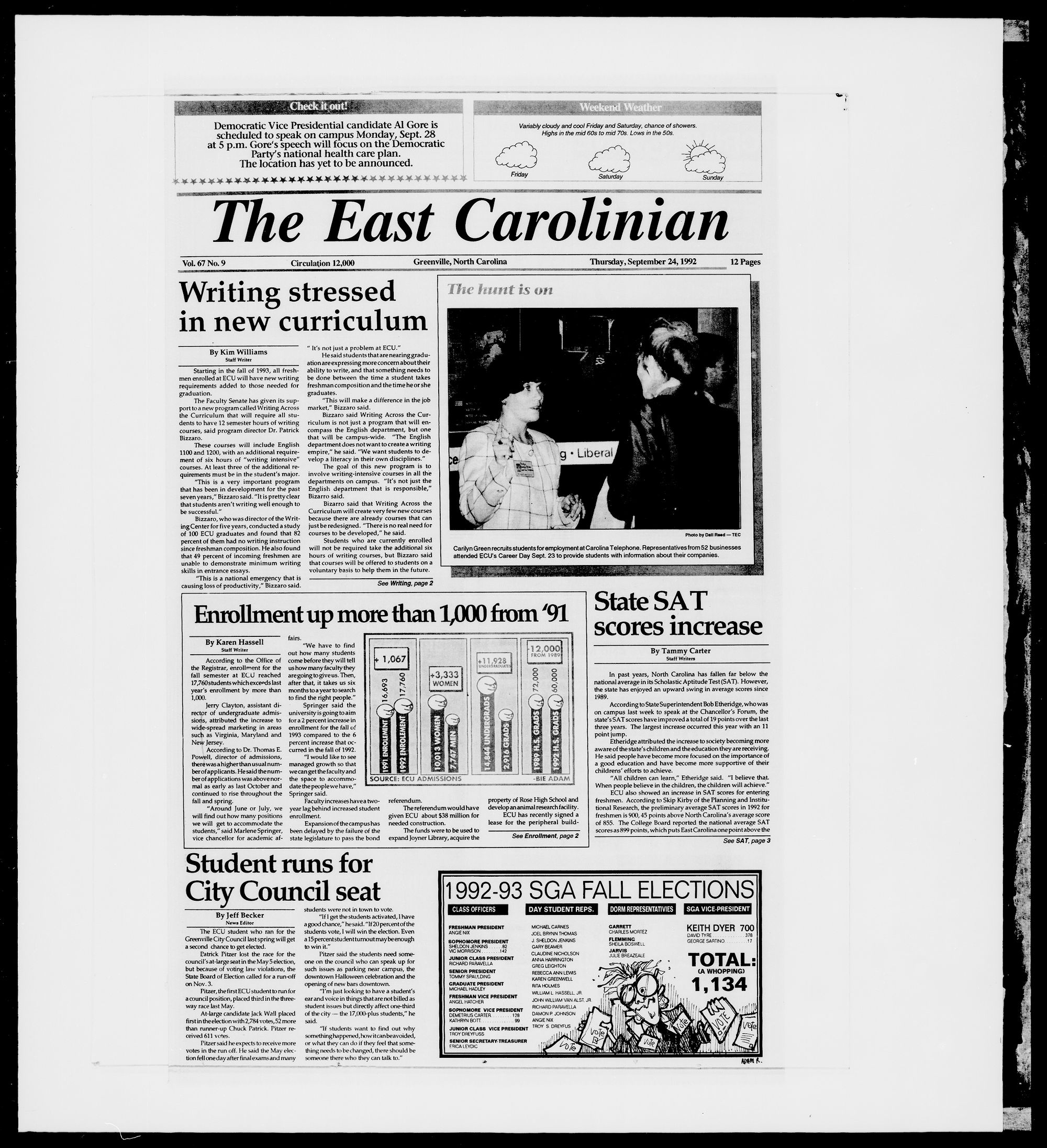 East Carolina's student-run campus newspaper was first published in 1923 as the East Carolina Teachers College News (1923-1925). It has been re-named as The Teco Echo (1925, 1926-1952), East Carolinian (1952-1969), Fountainhead (1969-1979), and The East Carolinian (1969, 1979-present). It includes local, state, national, and international stories with a focus on campus events.