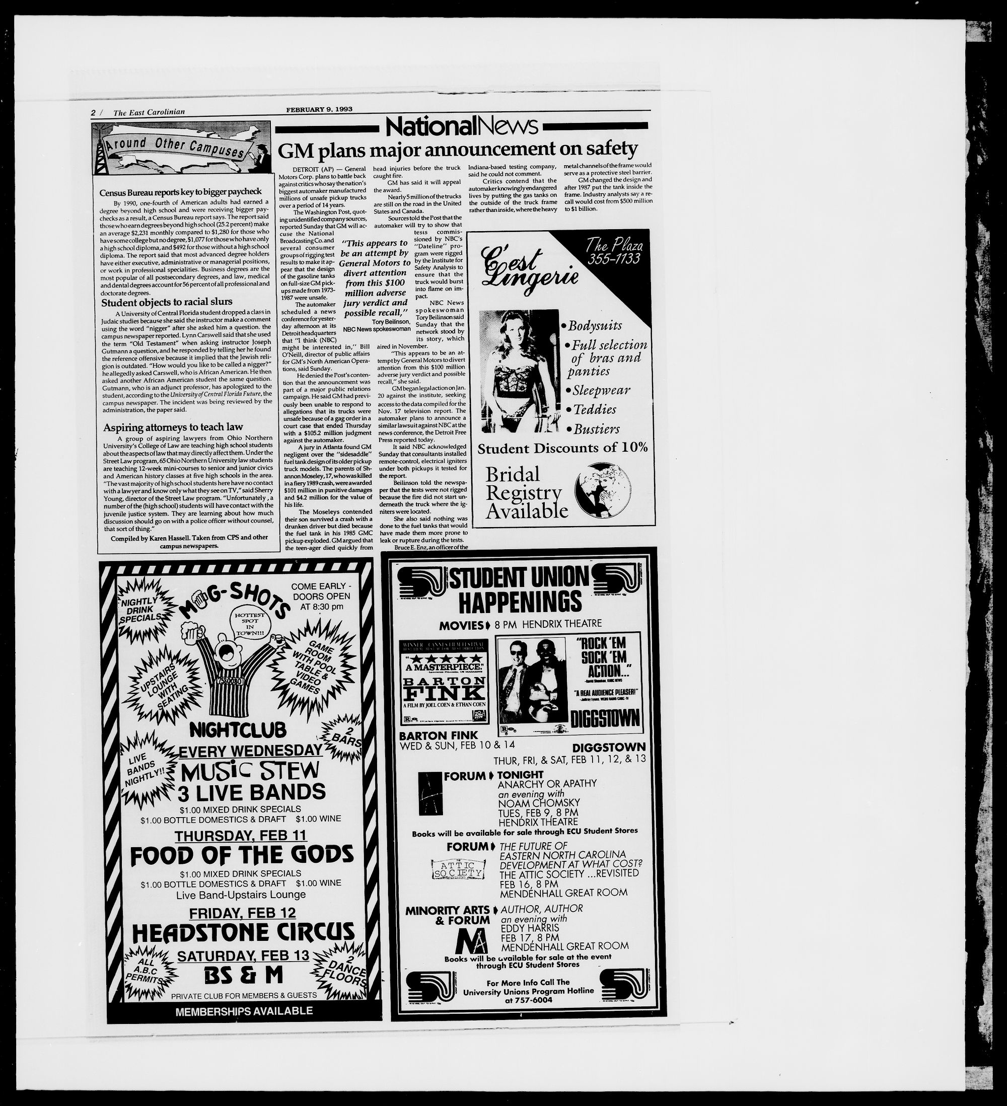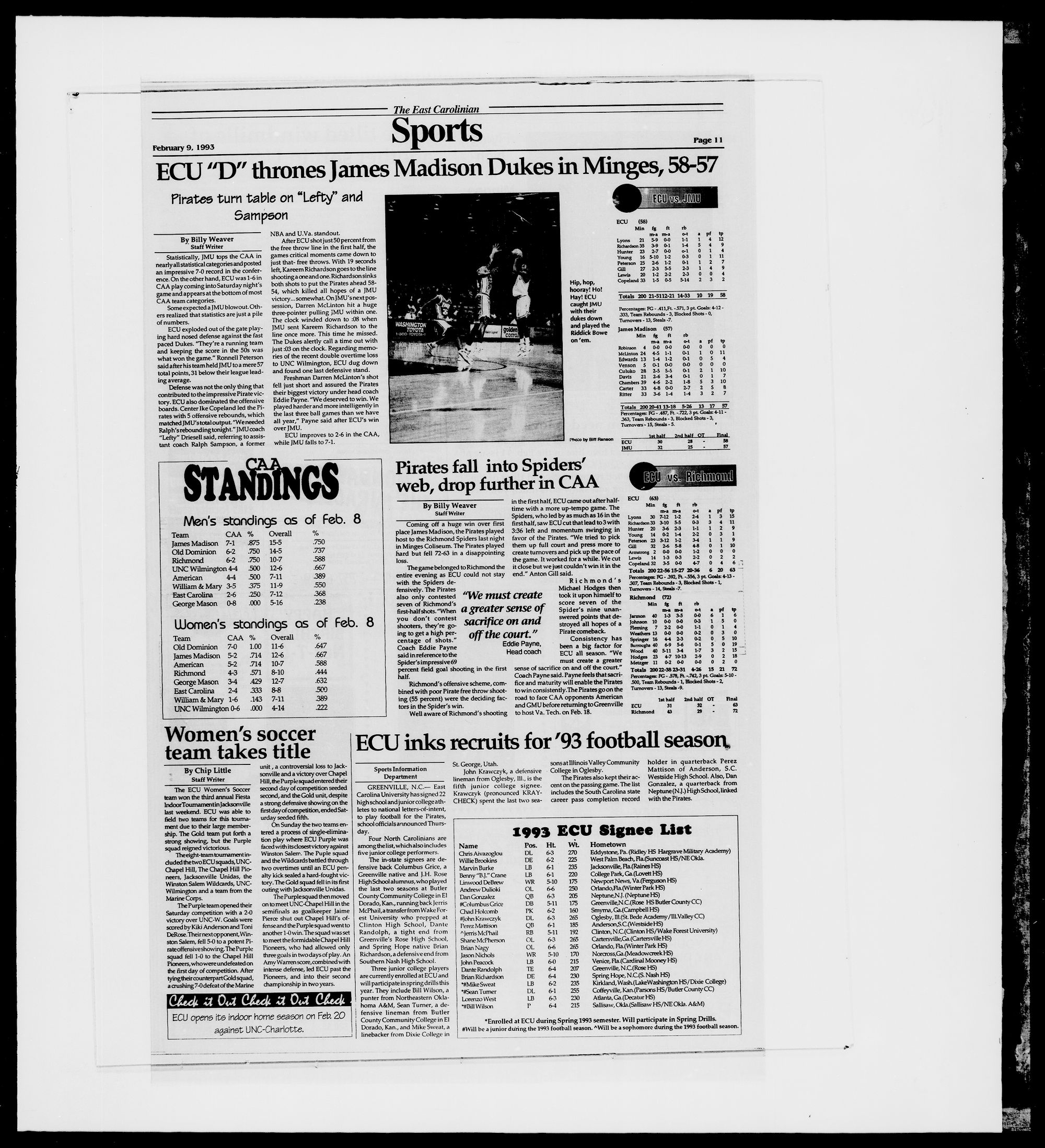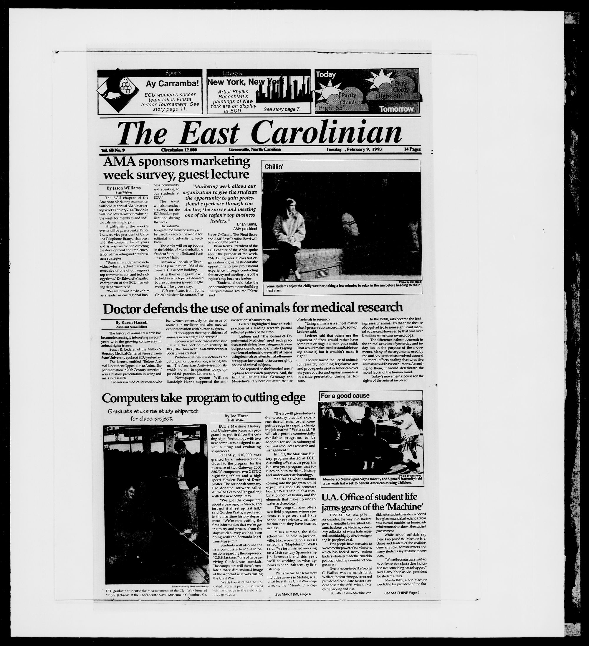 East Carolina's student-run campus newspaper was first published in 1923 as the East Carolina Teachers College News (1923-1925). It has been re-named as The Teco Echo (1925, 1926-1952), East Carolinian (1952-1969), Fountainhead (1969-1979), and The East Carolinian (1969, 1979-present). It includes local, state, national, and international stories with a focus on campus events.