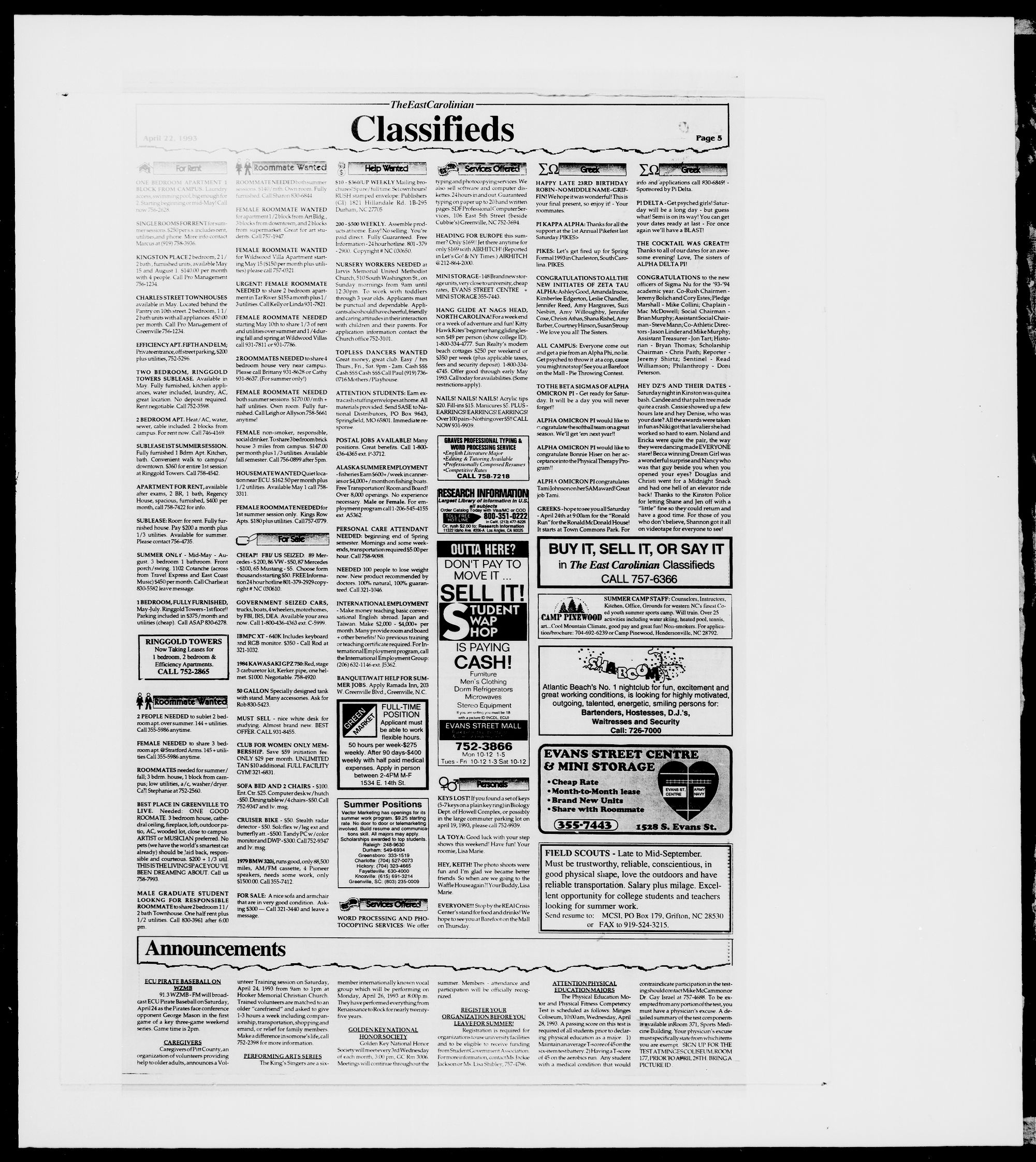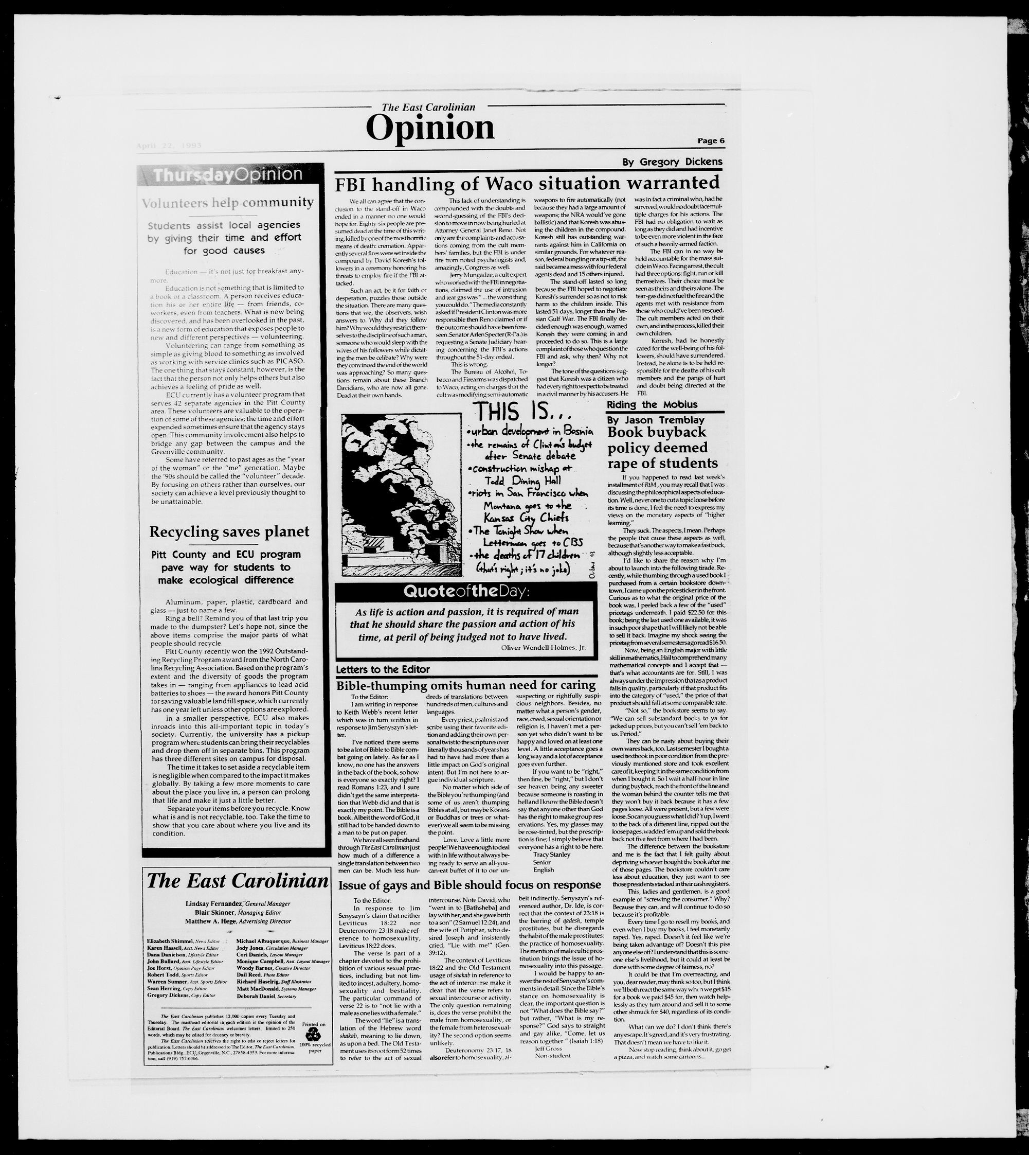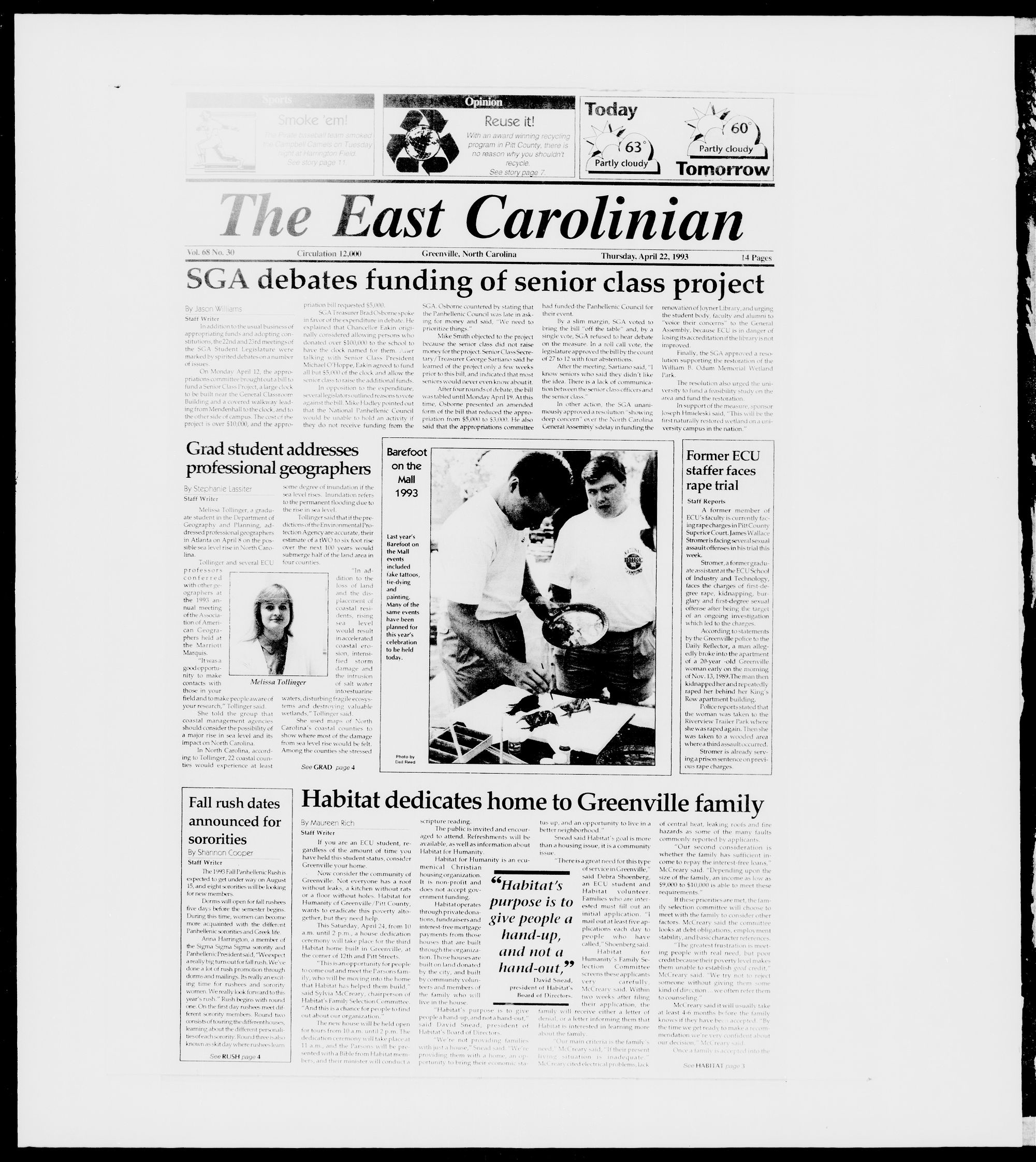 East Carolina's student-run campus newspaper was first published in 1923 as the East Carolina Teachers College News (1923-1925). It has been re-named as The Teco Echo (1925, 1926-1952), East Carolinian (1952-1969), Fountainhead (1969-1979), and The East Carolinian (1969, 1979-present). It includes local, state, national, and international stories with a focus on campus events.