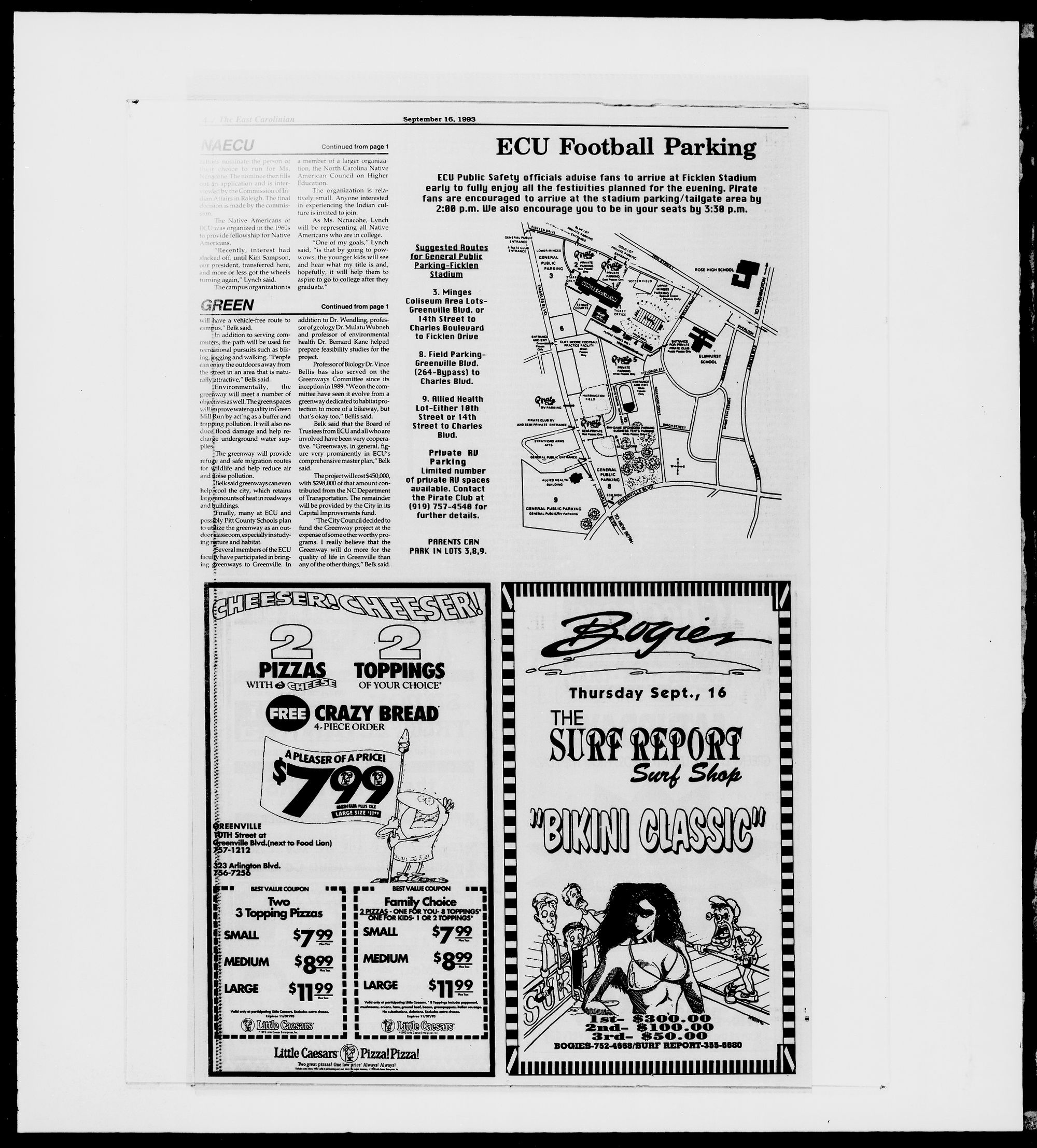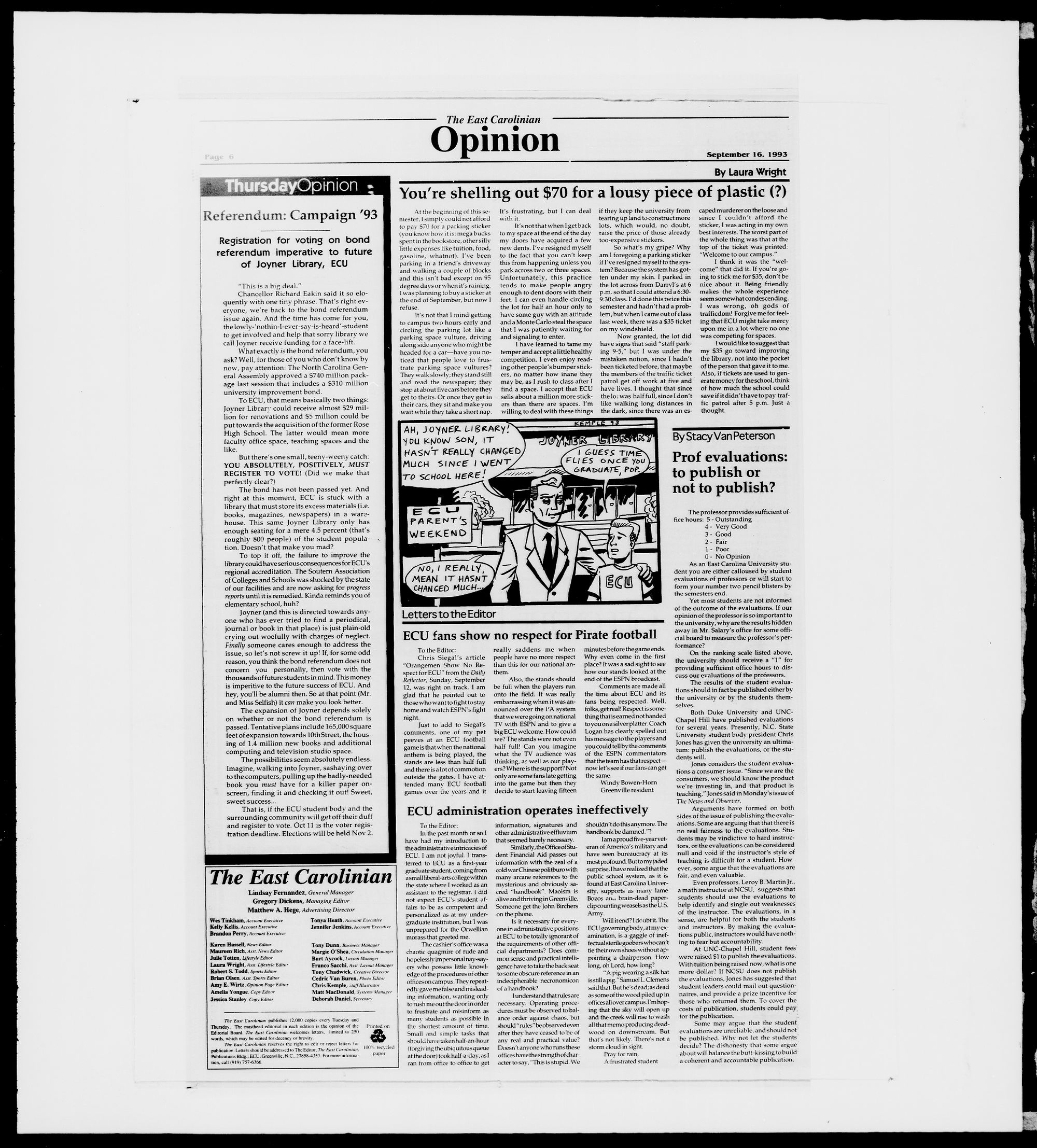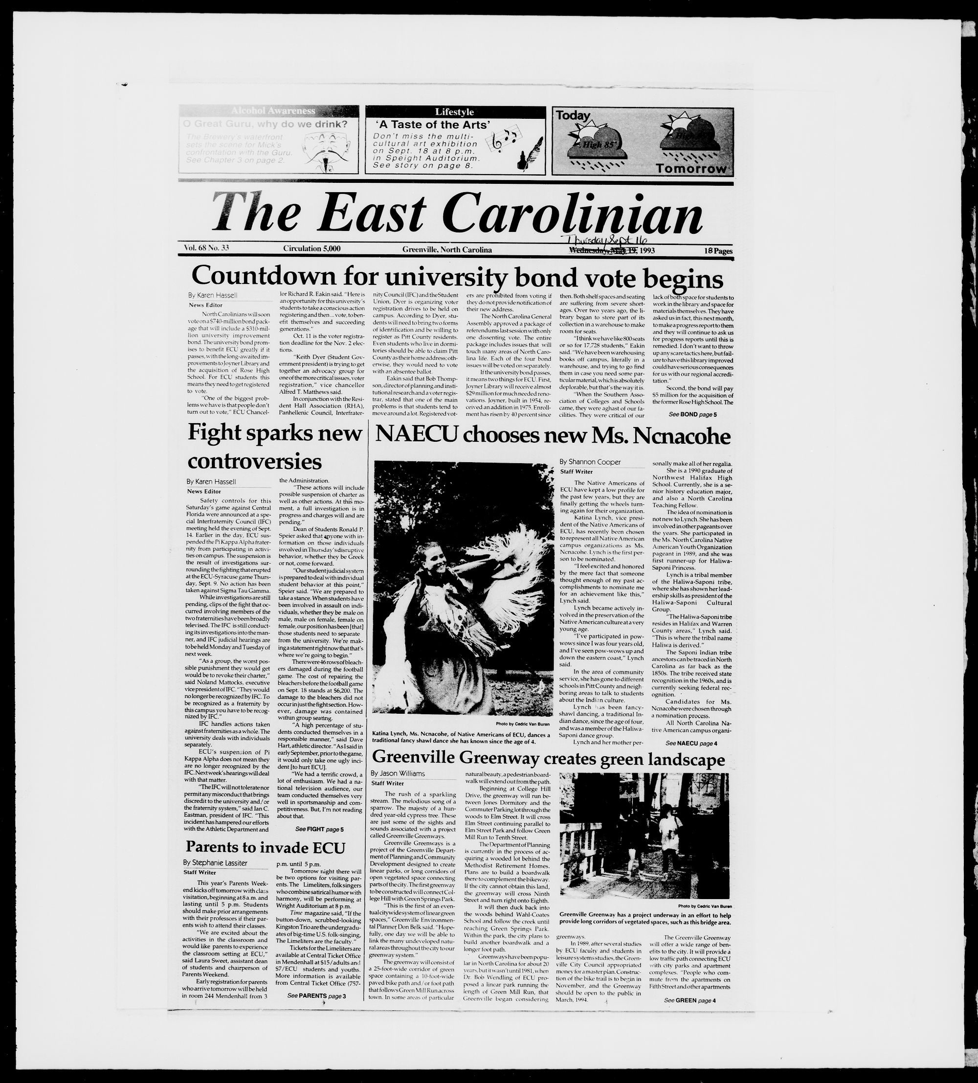 East Carolina's student-run campus newspaper was first published in 1923 as the East Carolina Teachers College News (1923-1925). It has been re-named as The Teco Echo (1925, 1926-1952), East Carolinian (1952-1969), Fountainhead (1969-1979), and The East Carolinian (1969, 1979-present). It includes local, state, national, and international stories with a focus on campus events.